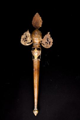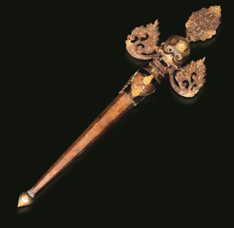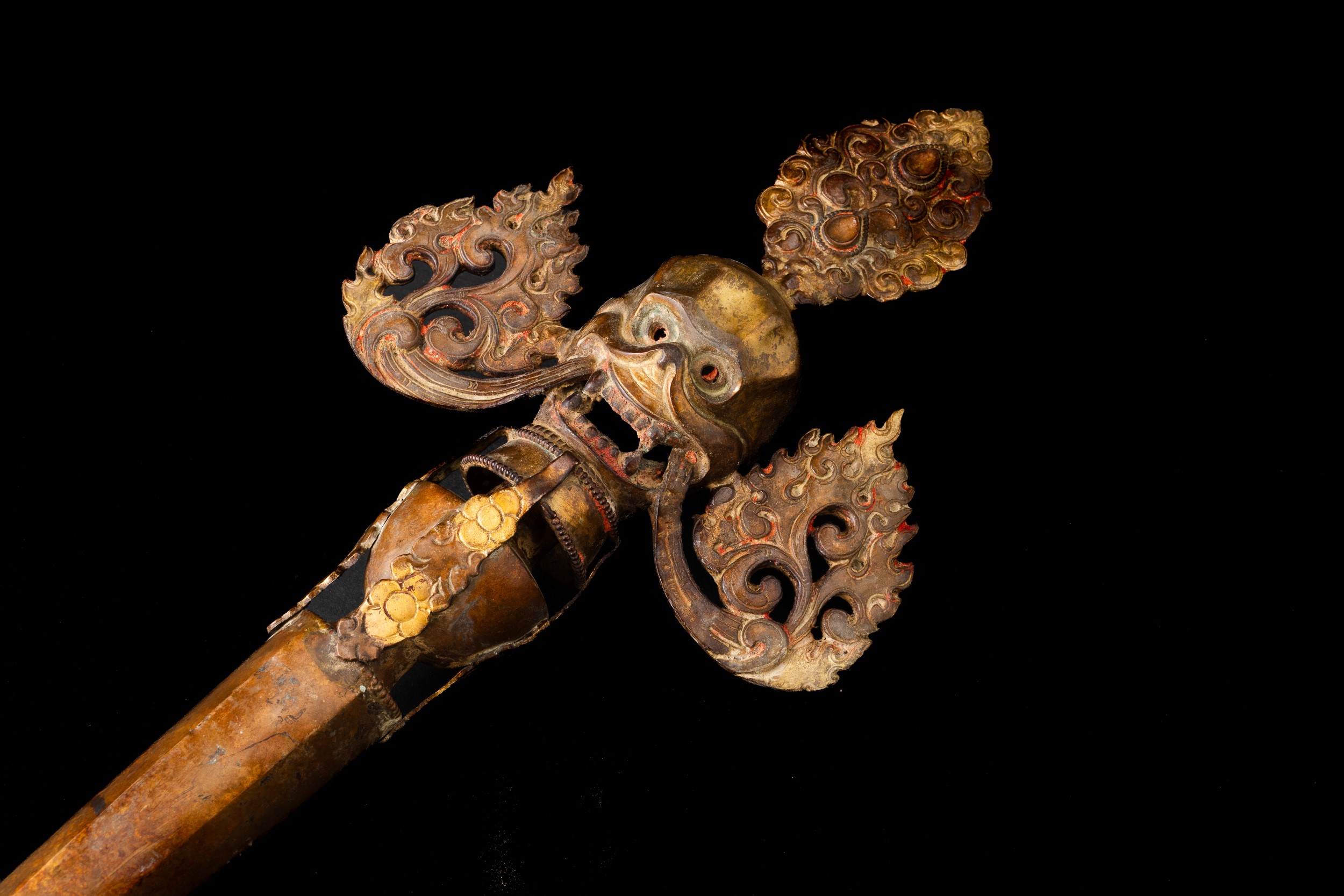 Scettro rituale con teschio in bronzo parzialmente dorato con tracce di policromia, Tibet, XIX secolo