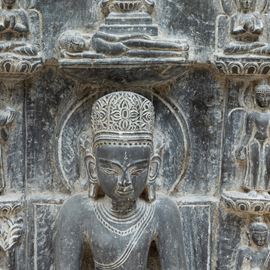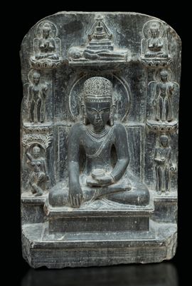 Stele scolpita in pietra con figura centrale di Buddha Sakyamuni e altre divinità, India, XIX secolo