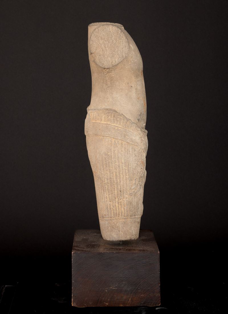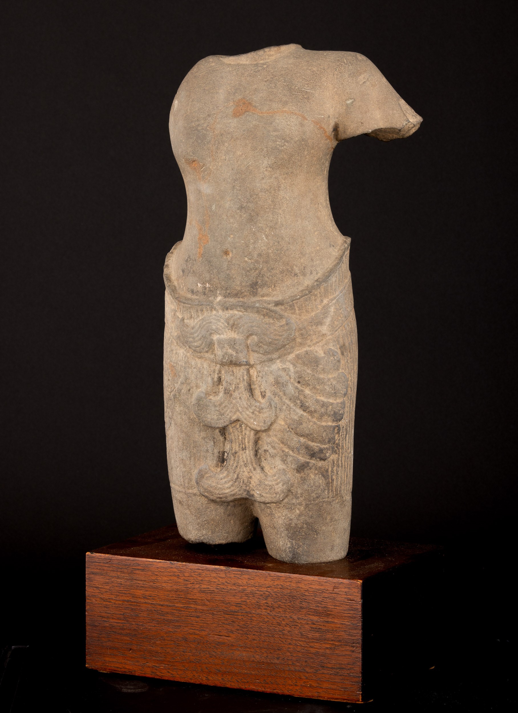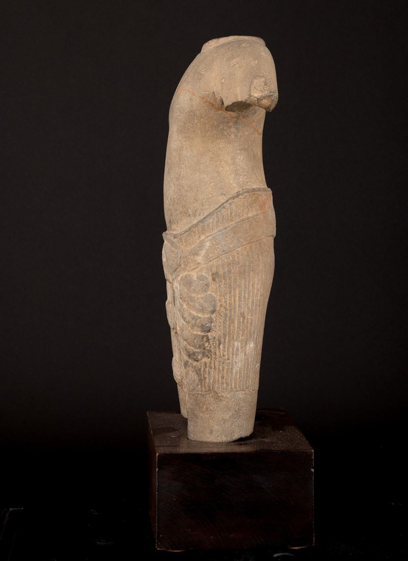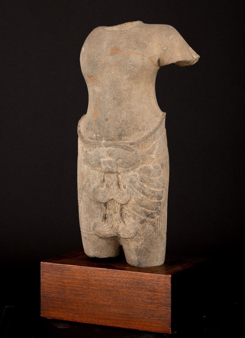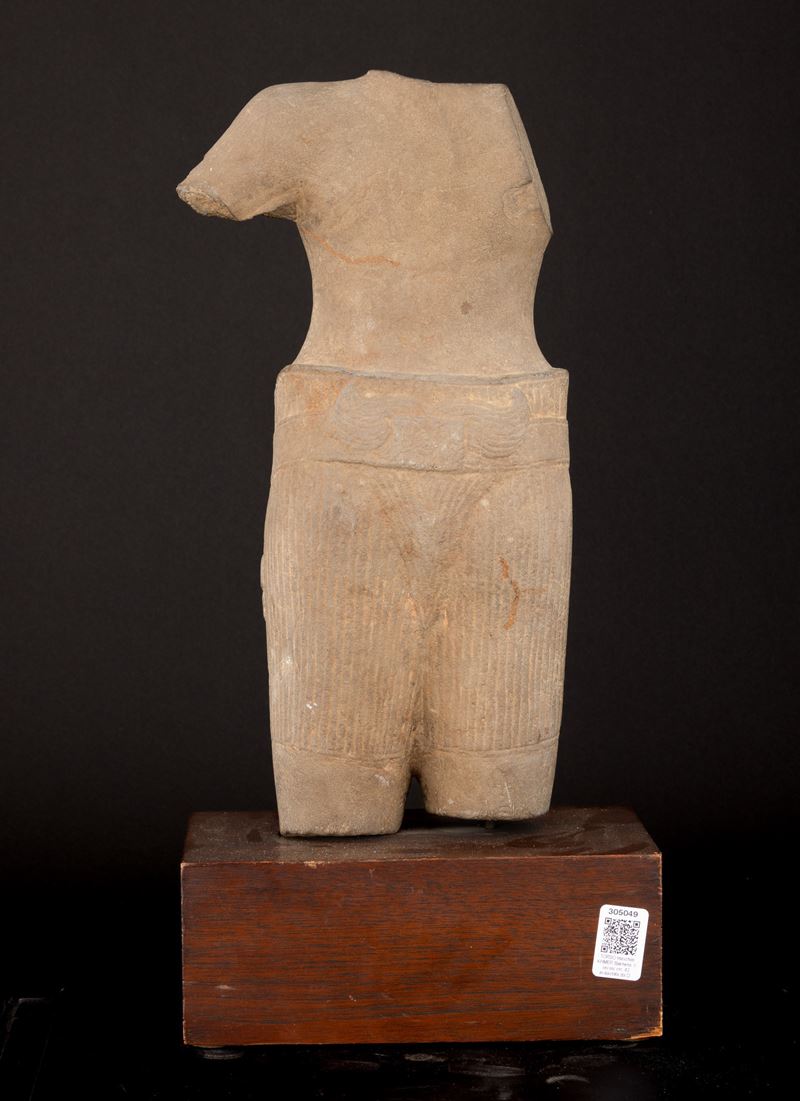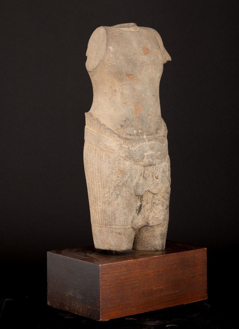 Torso maschile scolpito in pietra, Cambogia, Khemer, X secolo
