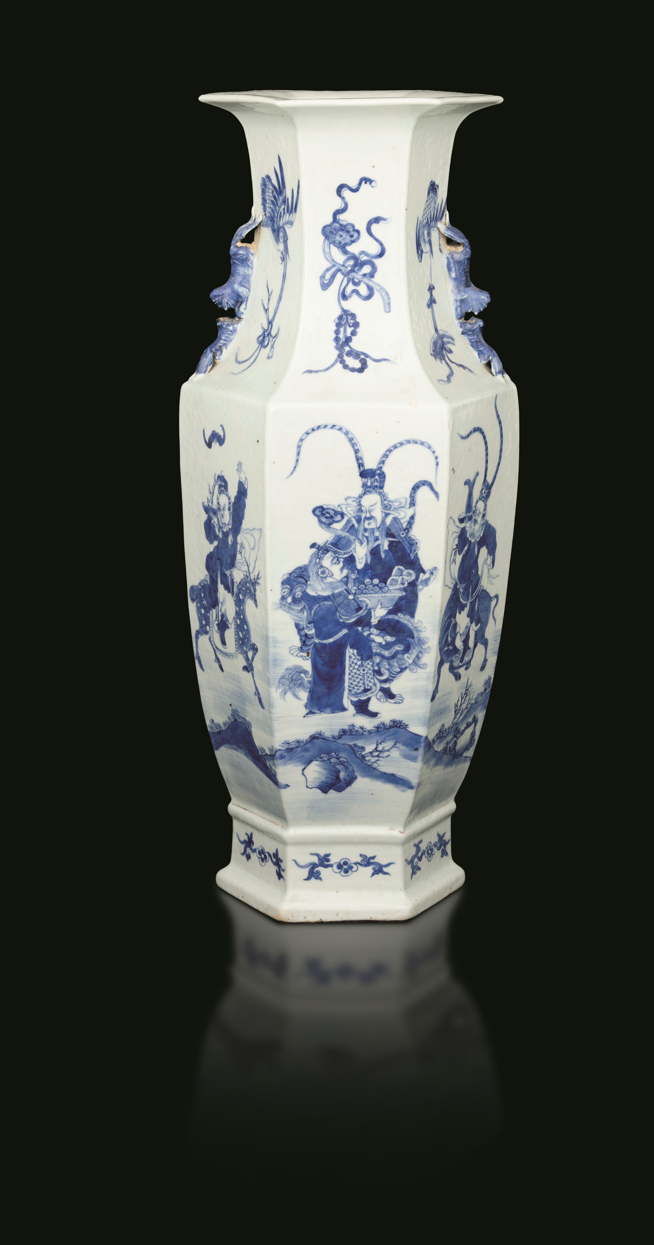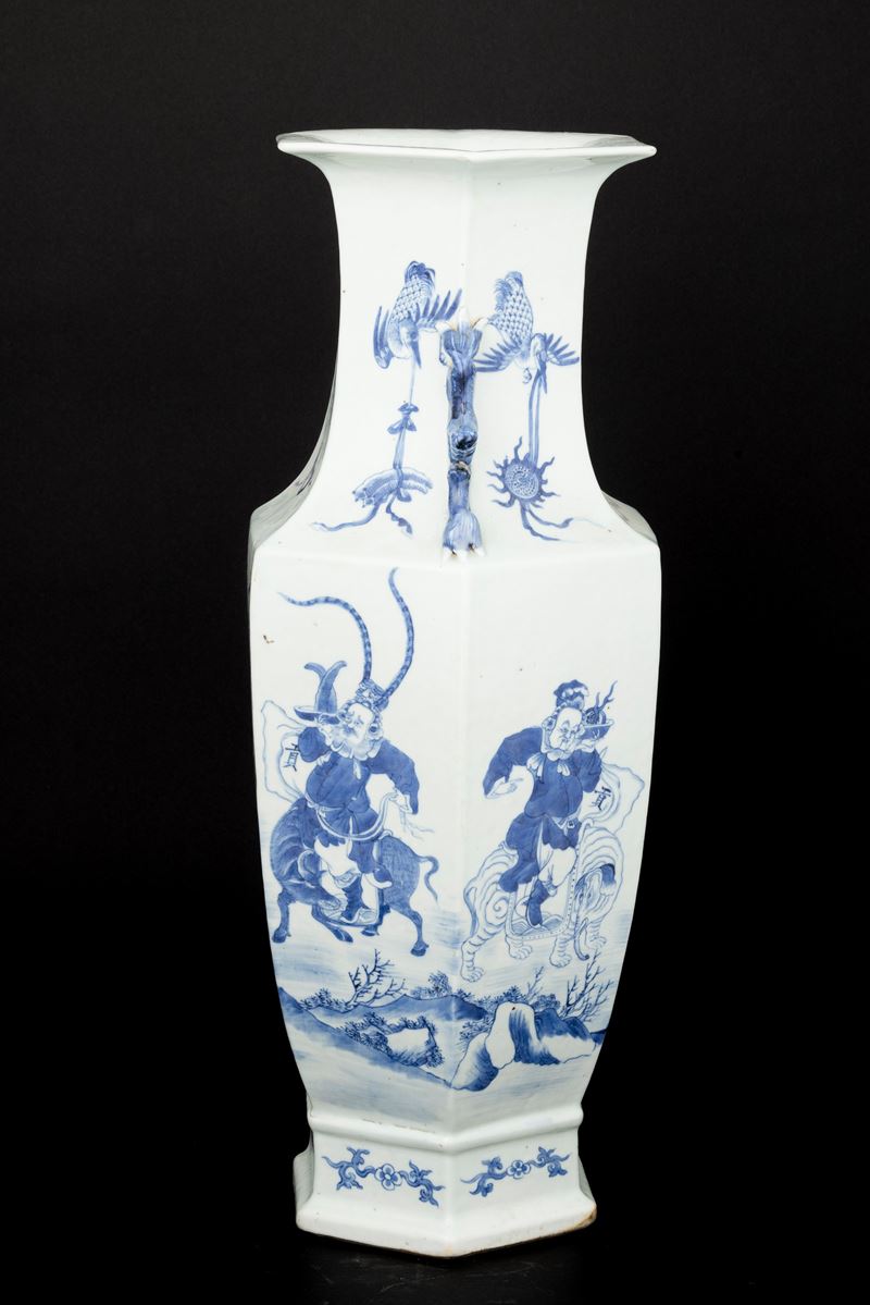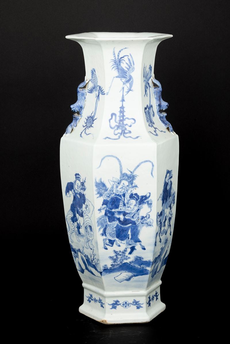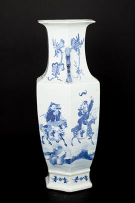 Vaso in porcellana bianca e blu a pianta esagonale raffigurante scena di battaglia, anse sagomate, Cina, Dinastia Qing, [..]