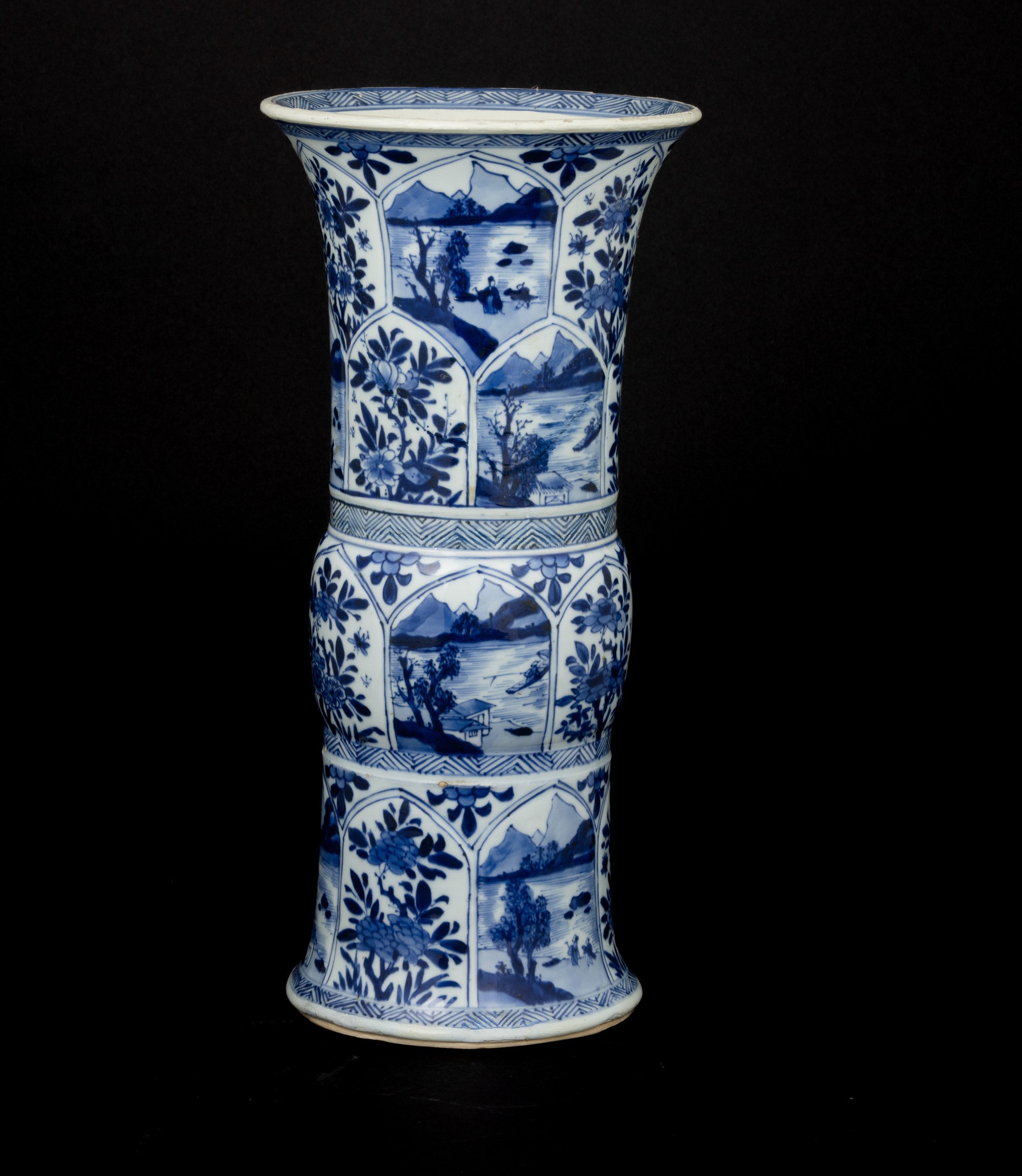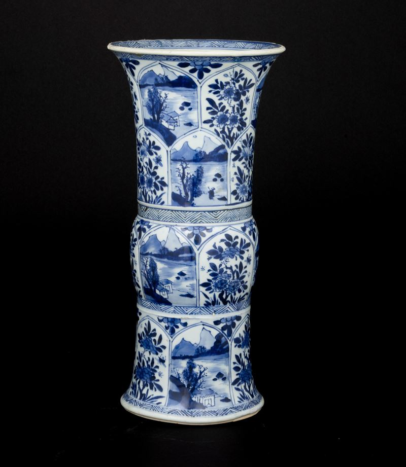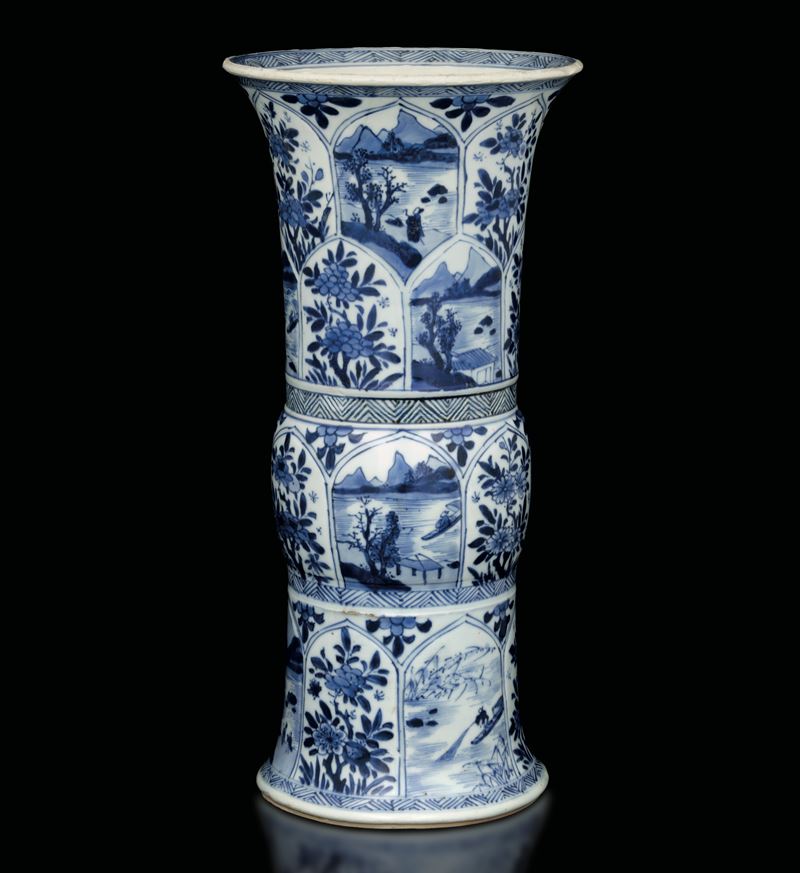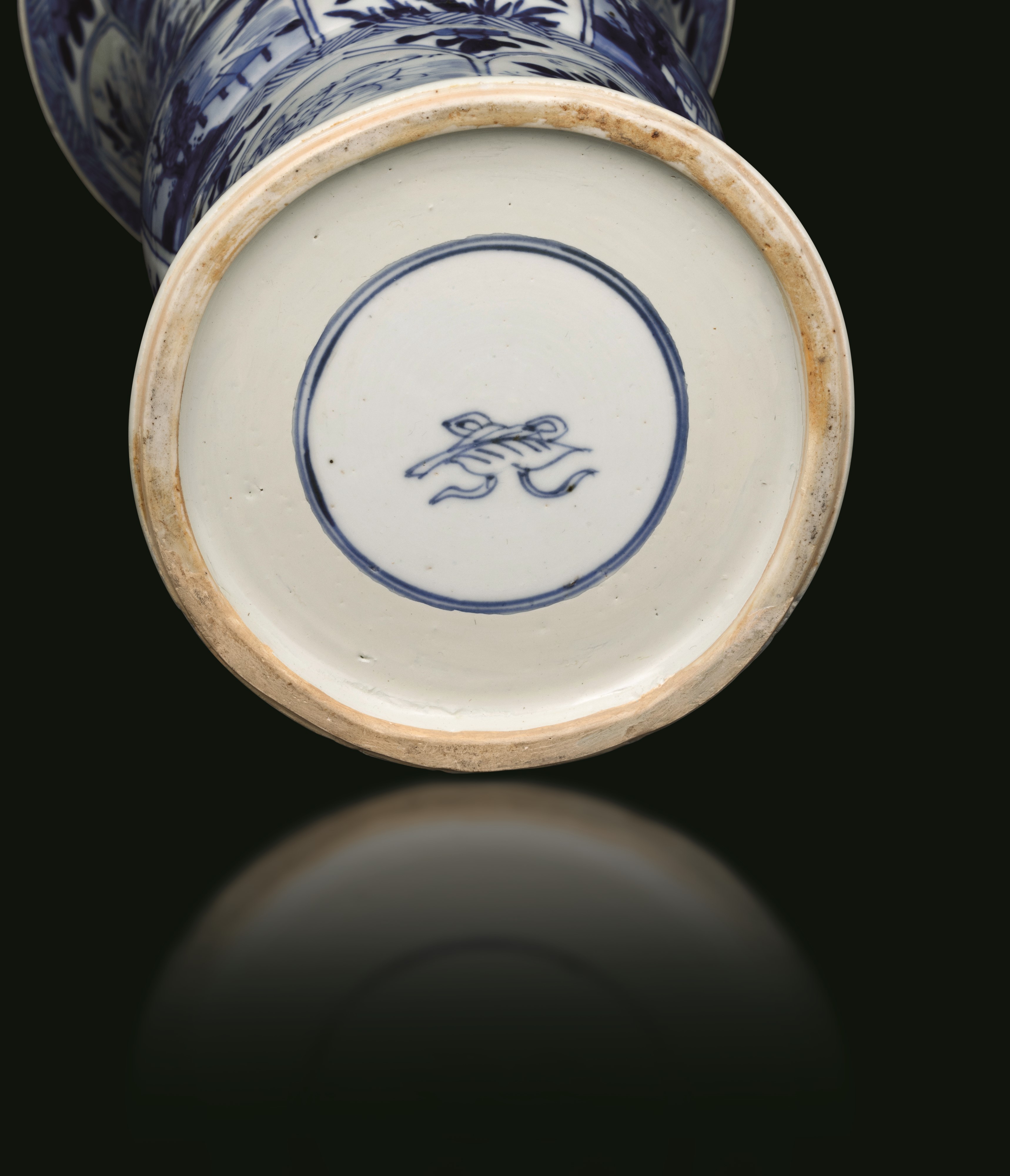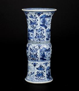Vaso in porcellana bianca e blu a soggetto naturalistico entro riserve, Cina, Dinastia Qing, epoca Kangxi (1662-1722)