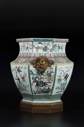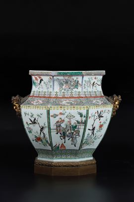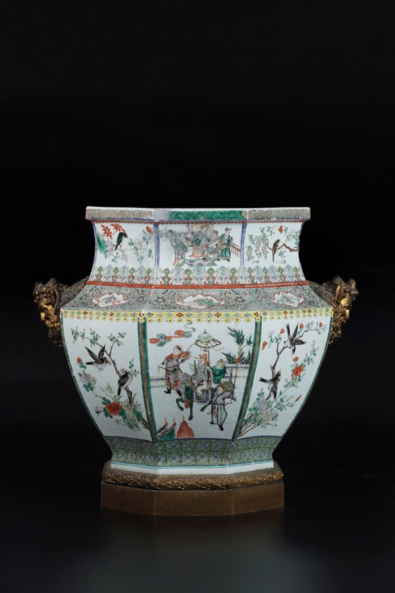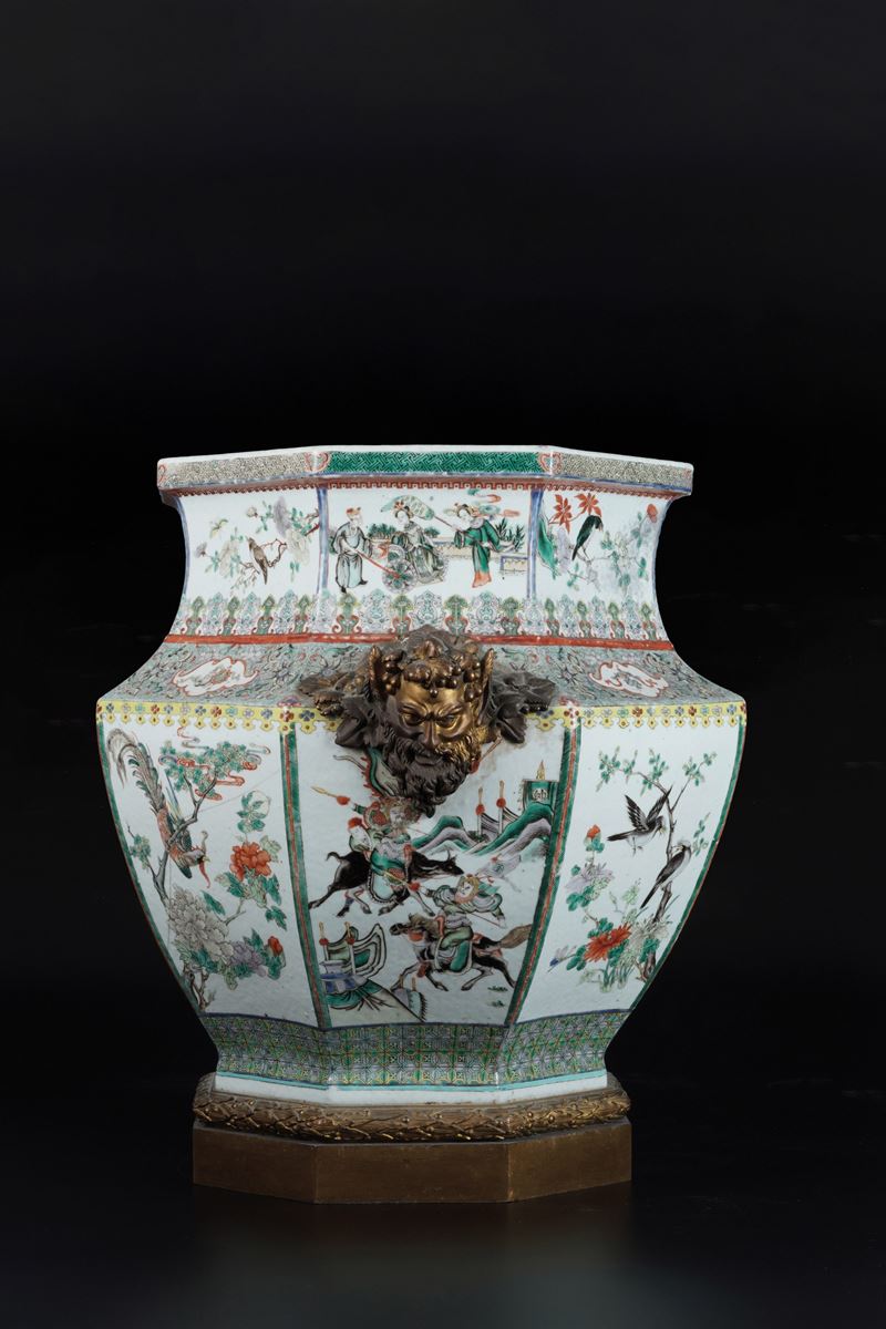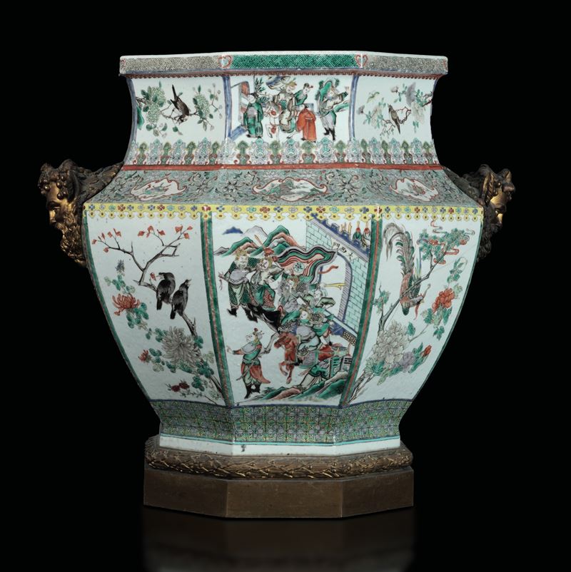 Vaso in porcellana Famiglia Verde a sezione esagonale raffigurante scene di battaglie, Cina, Dinastia Qing, XIX secolo