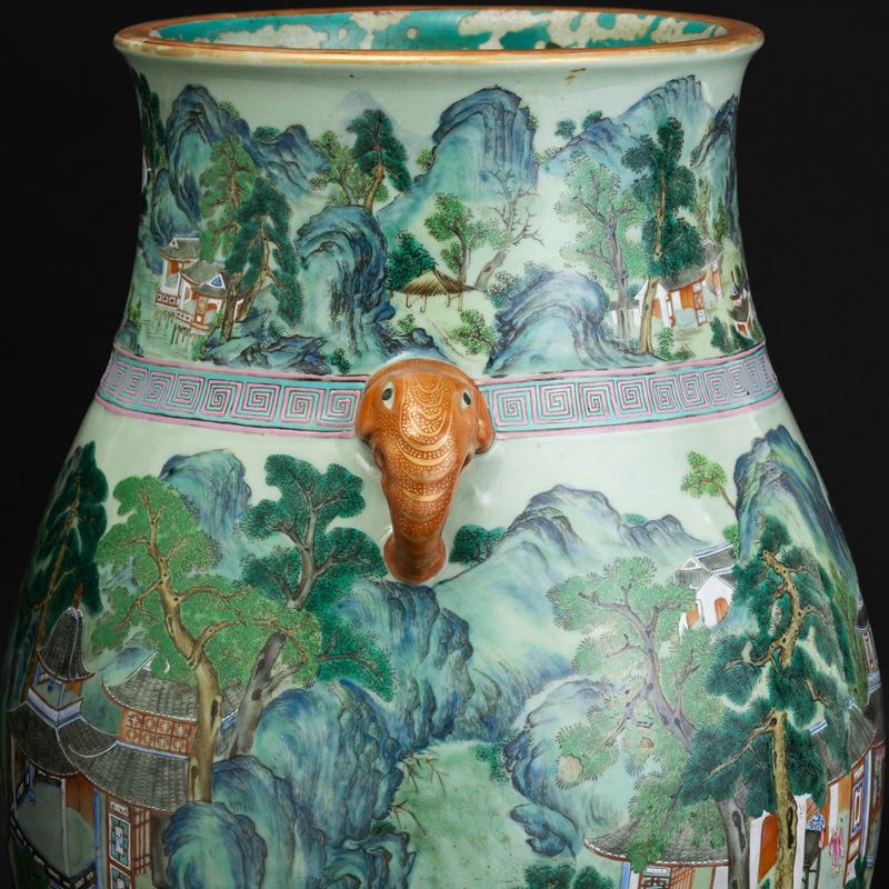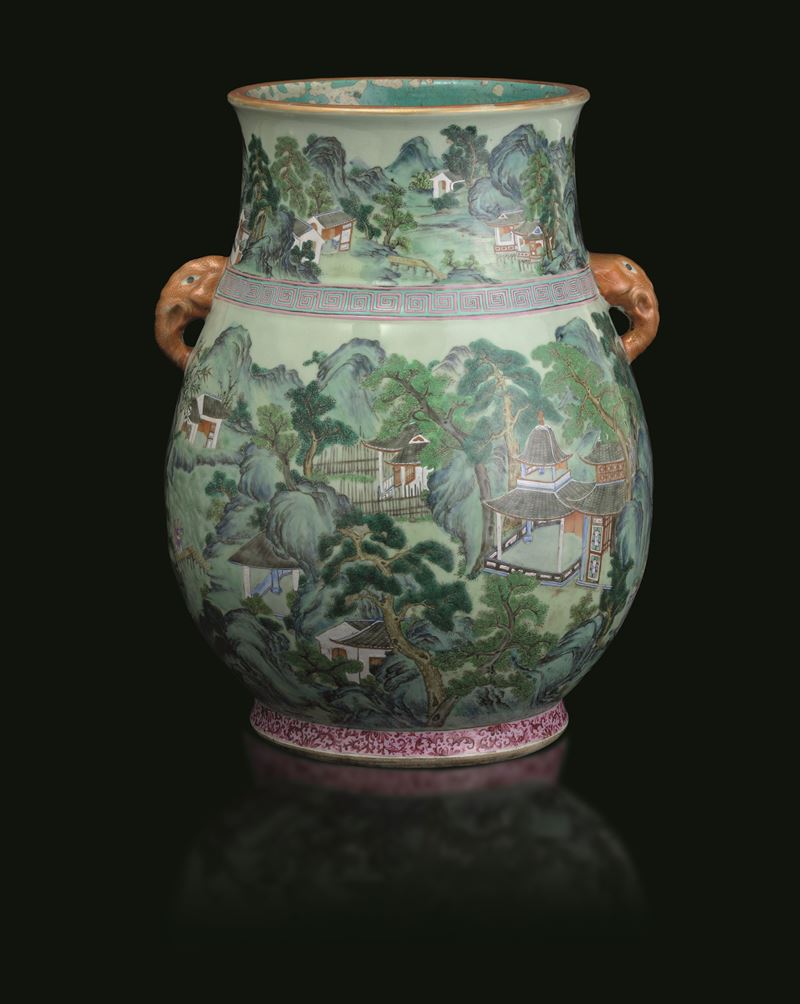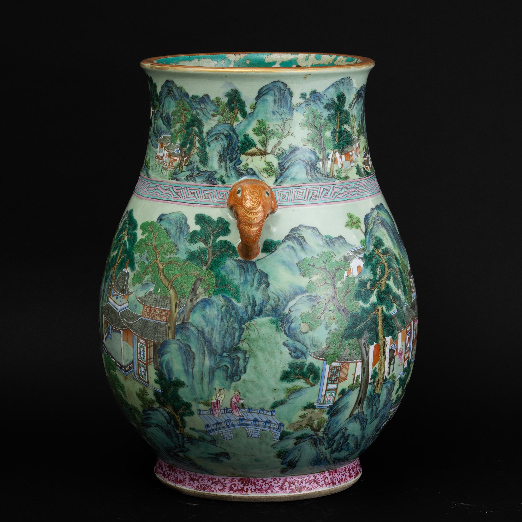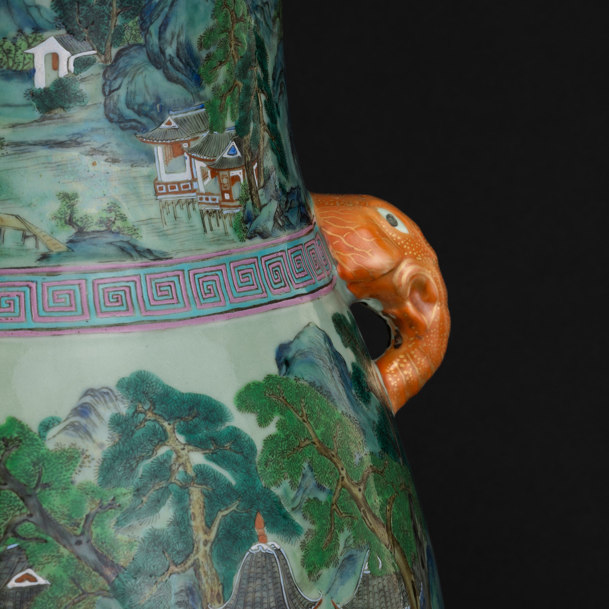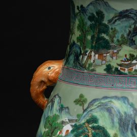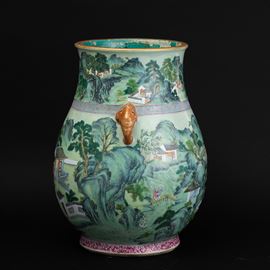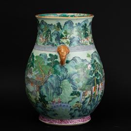 Vaso in porcellana policroma Famiglia Rosa raffigurante scena paesaggistica con motivi geometrici e anse zoomorfe, Cina, [..]