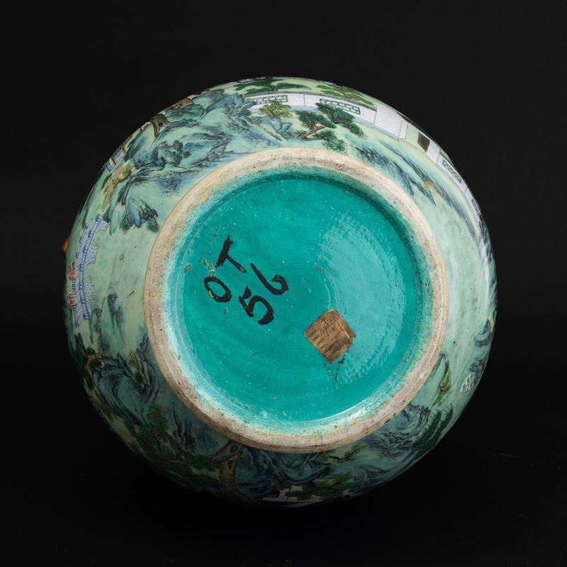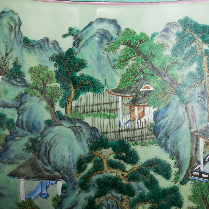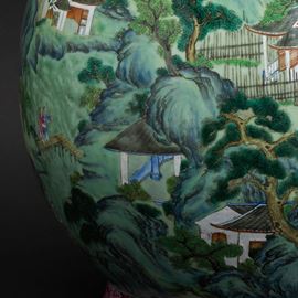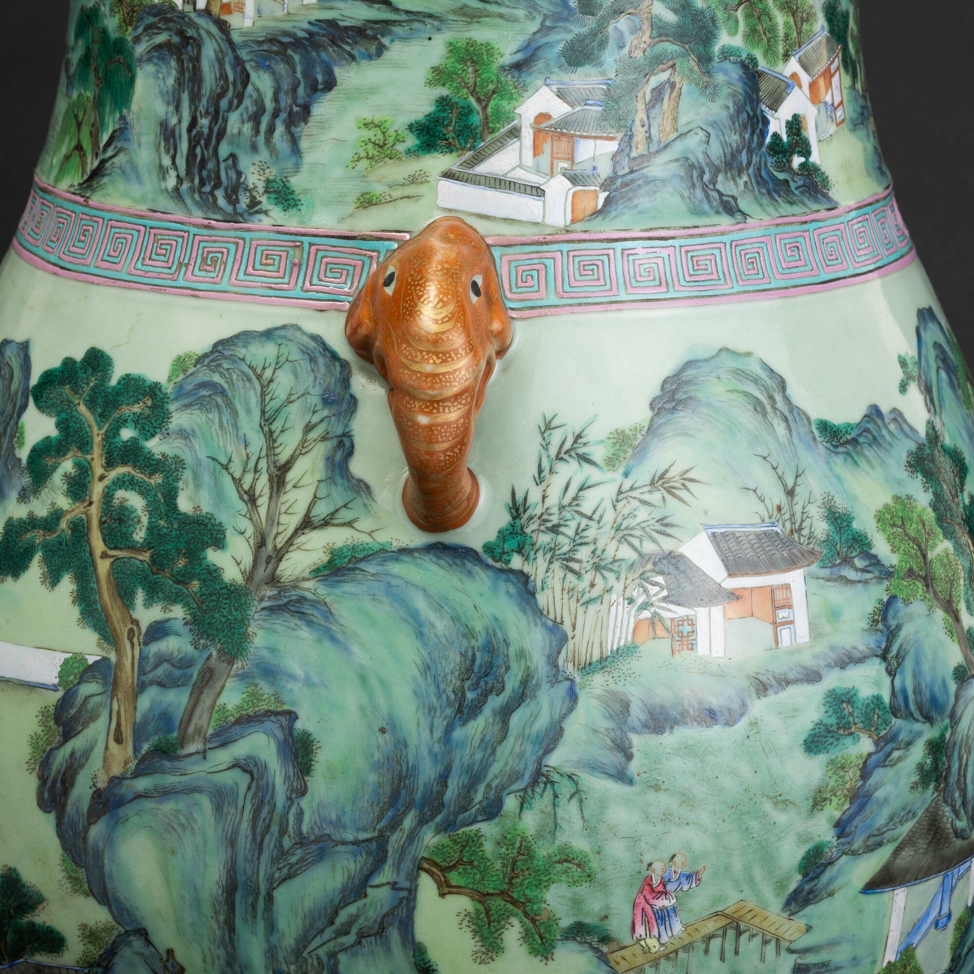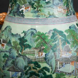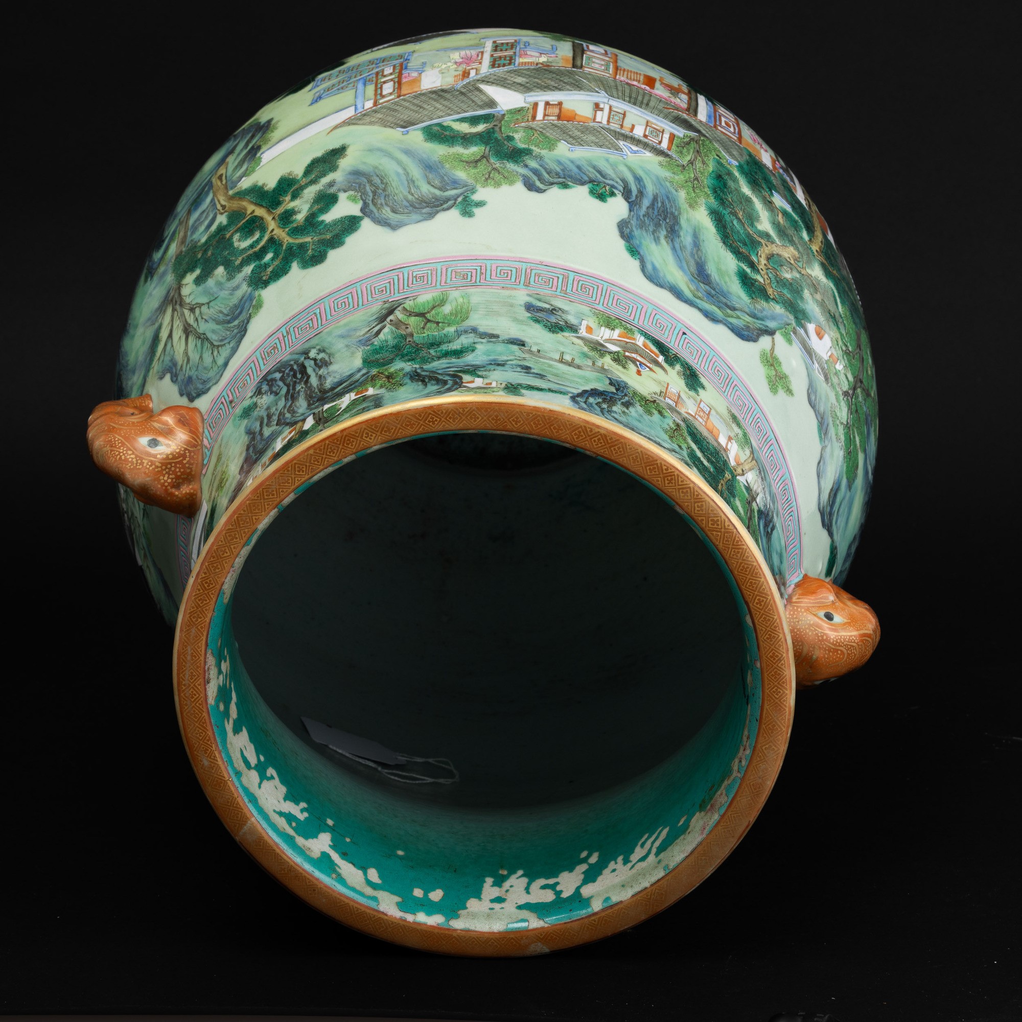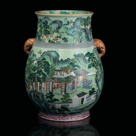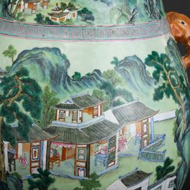 Vaso in porcellana policroma Famiglia Rosa raffigurante scena paesaggistica con motivi geometrici e anse zoomorfe, Cina, [..]