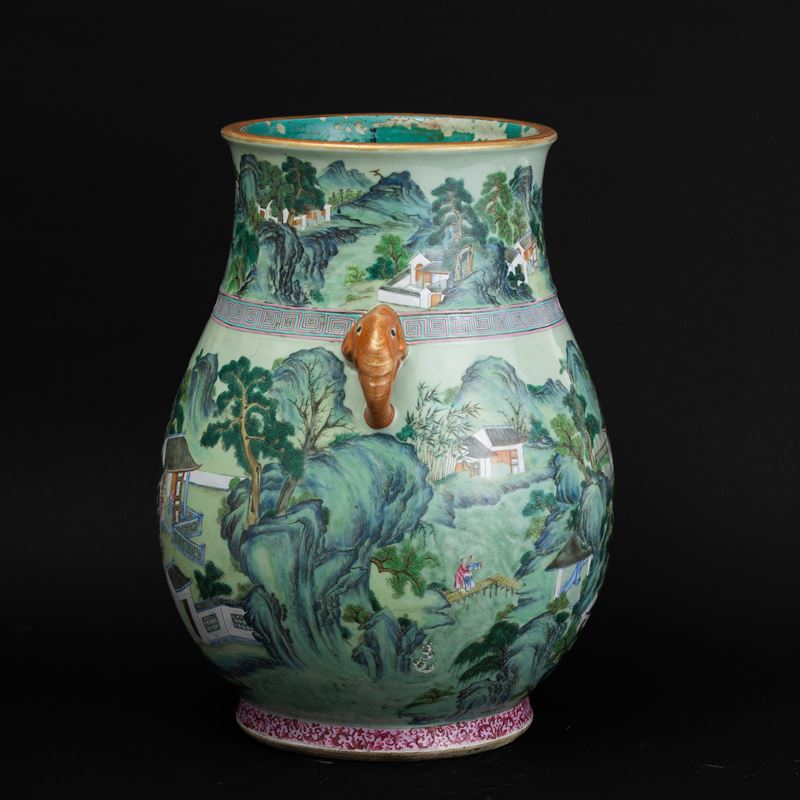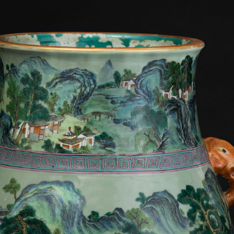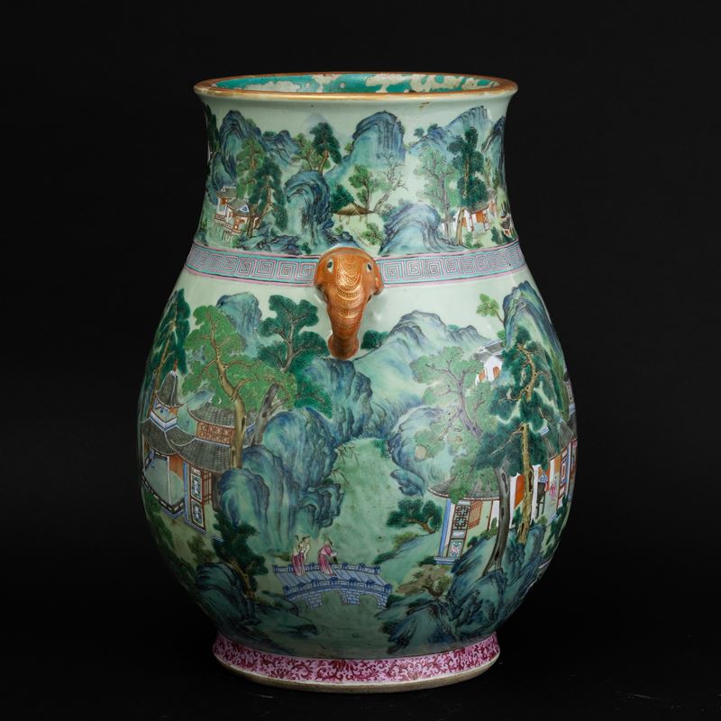 Vaso in porcellana policroma Famiglia Rosa raffigurante scena paesaggistica con motivi geometrici e anse zoomorfe, Cina, Dinastia Qing, epoca Qianlong (1736-1796)