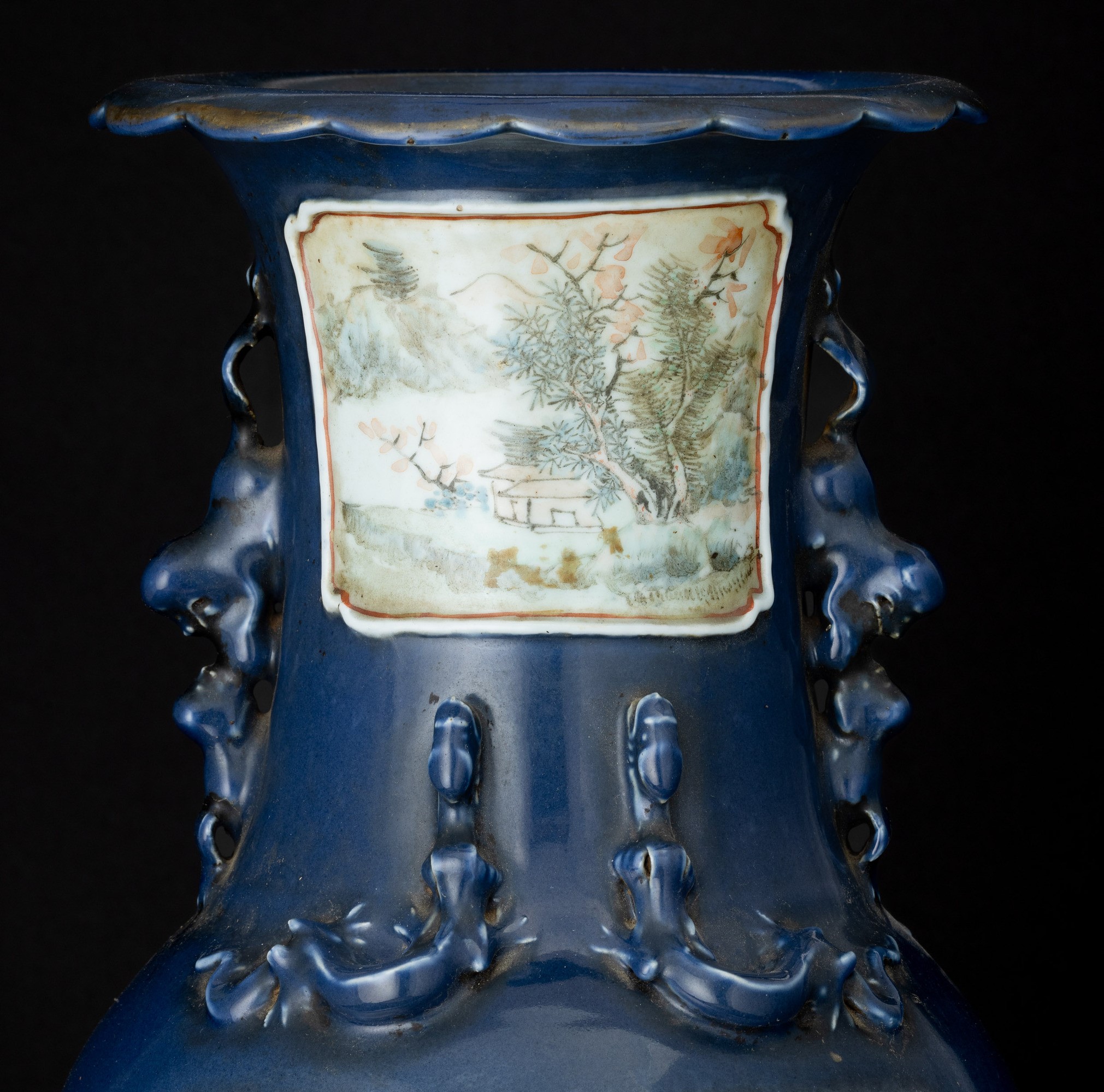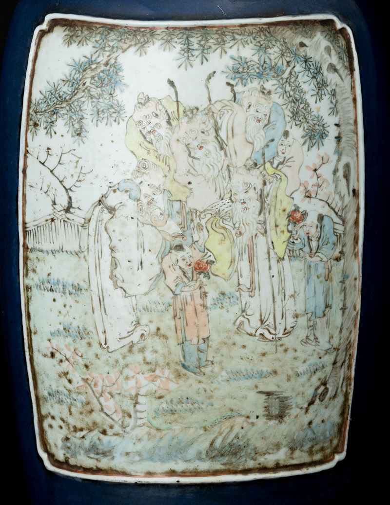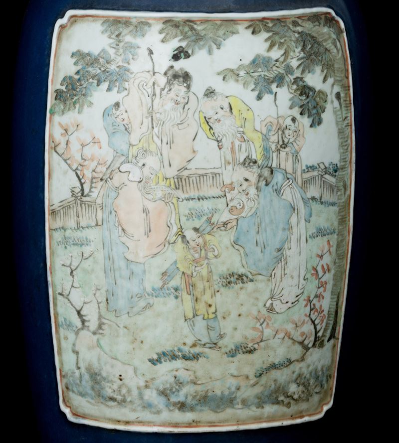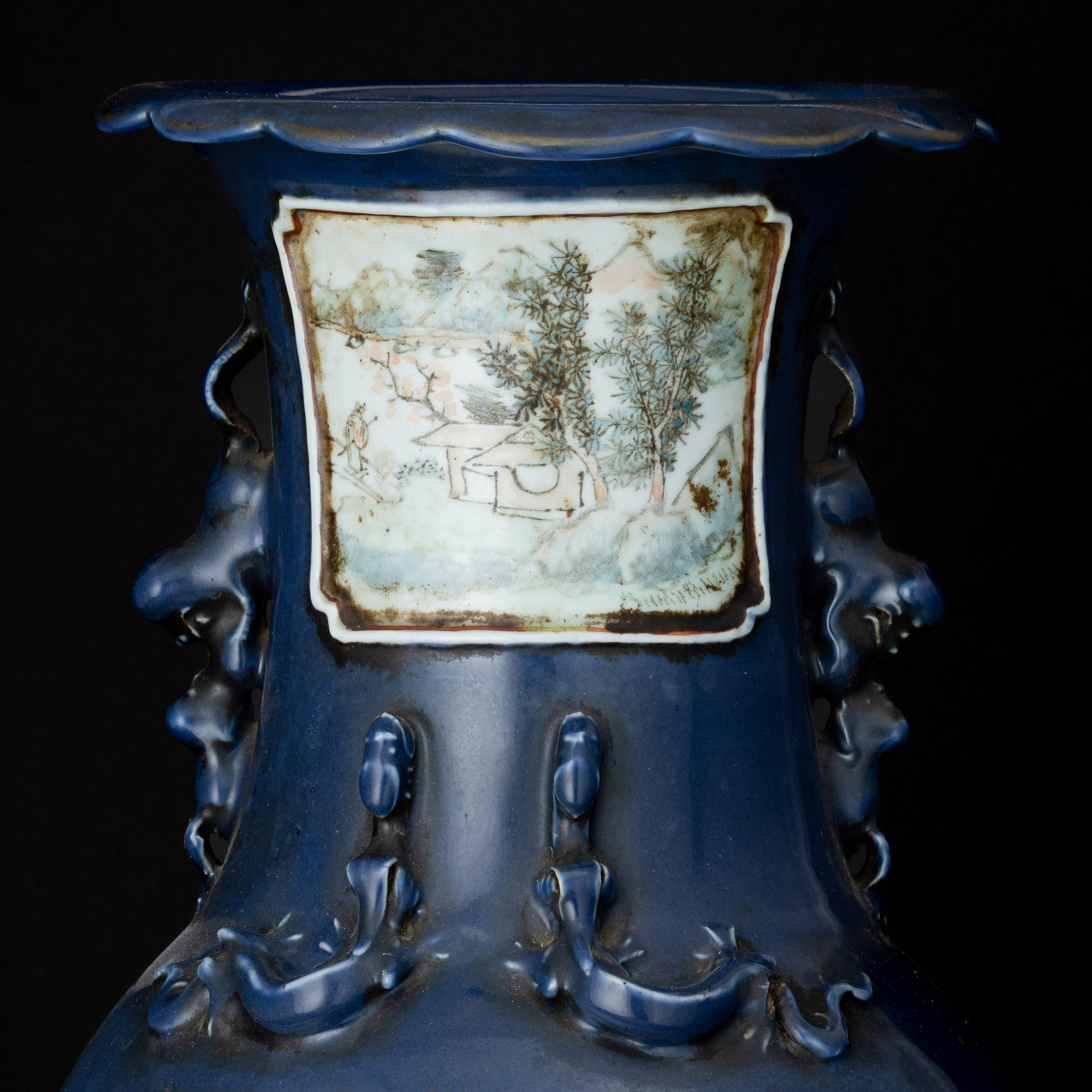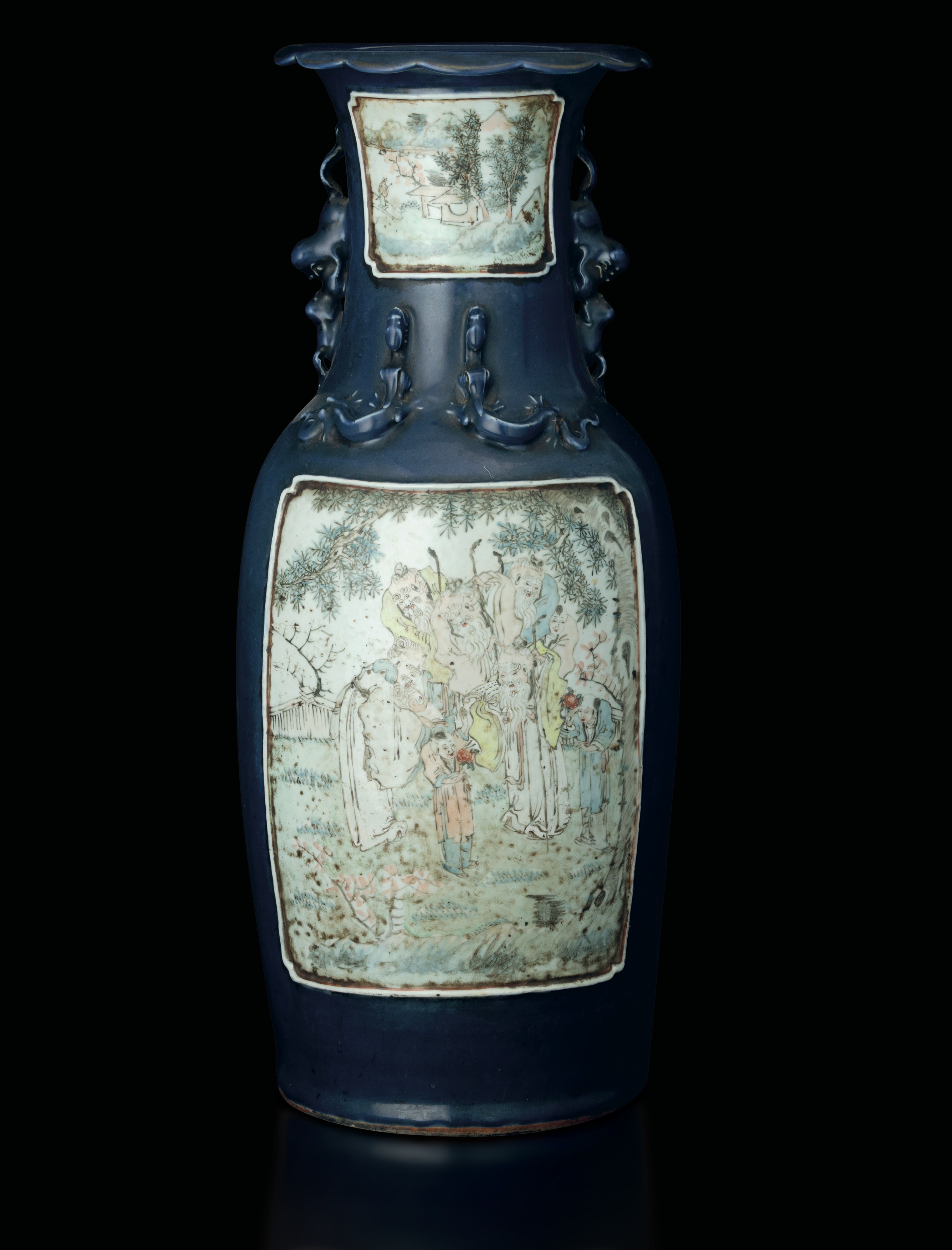 Vaso in porcellana Qian Jiang a fondo blu con figure di saggi entro riserve e figure di draghetti a rilievo, Cina, Dinastia Qing, XIX secolo