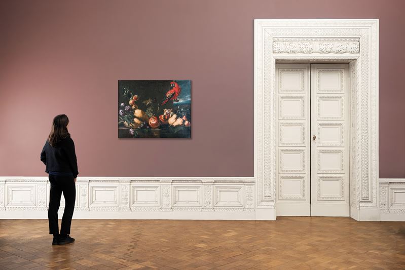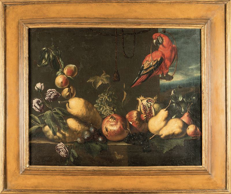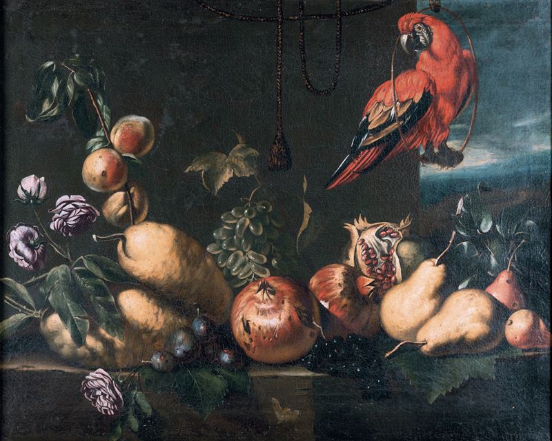 Frutta, fiori e pappagallo su ripiano in pietra
