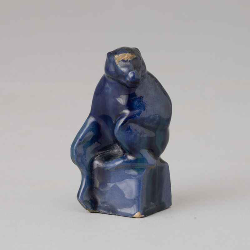 Piccola scultura raffigurante babbuino in ceramica con decoro di smalto blu.