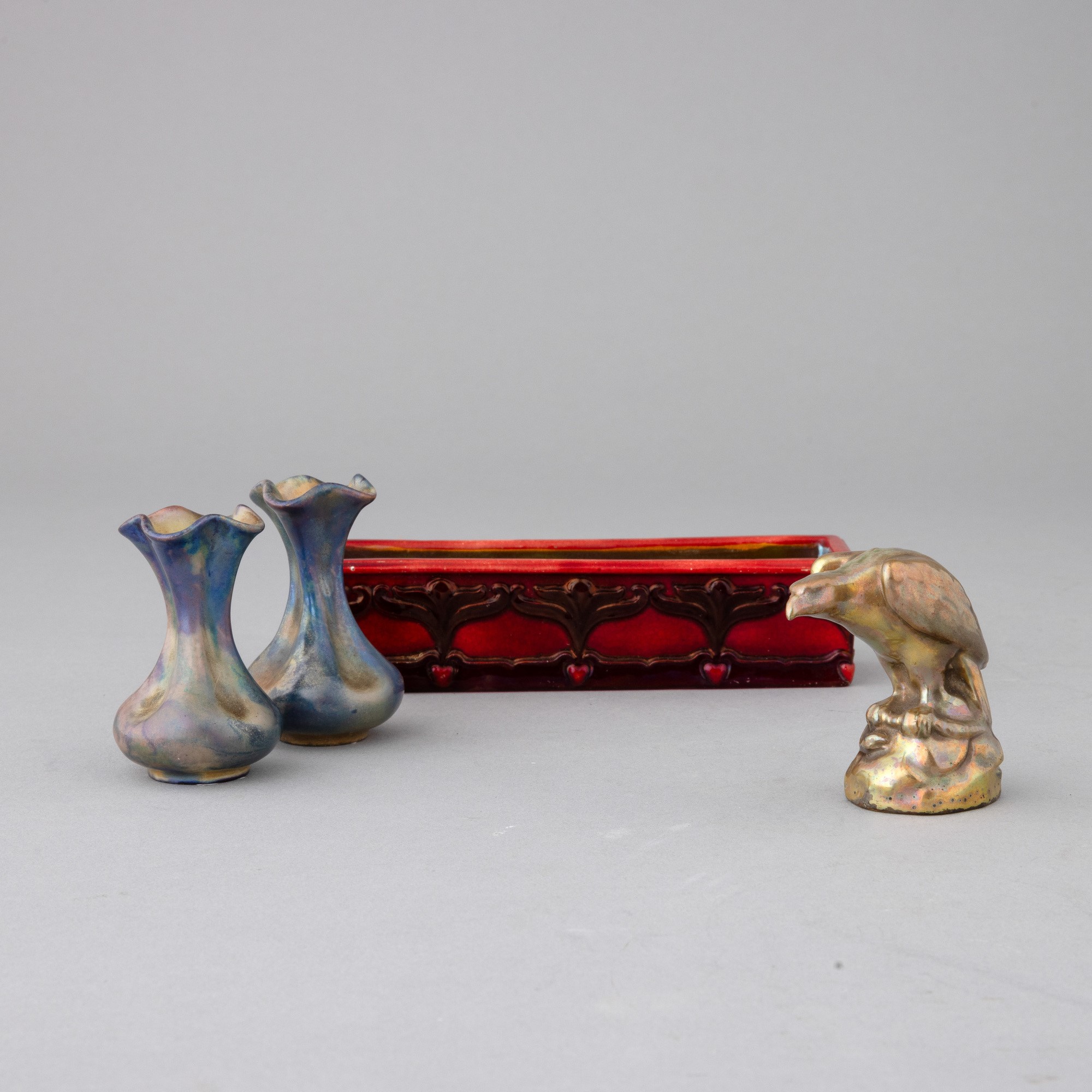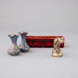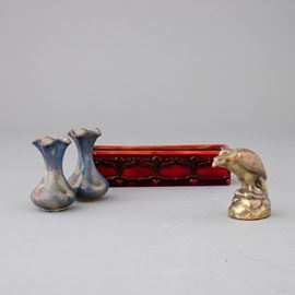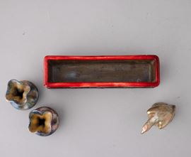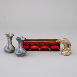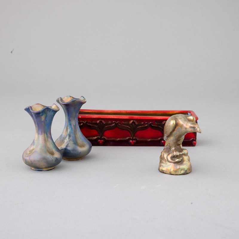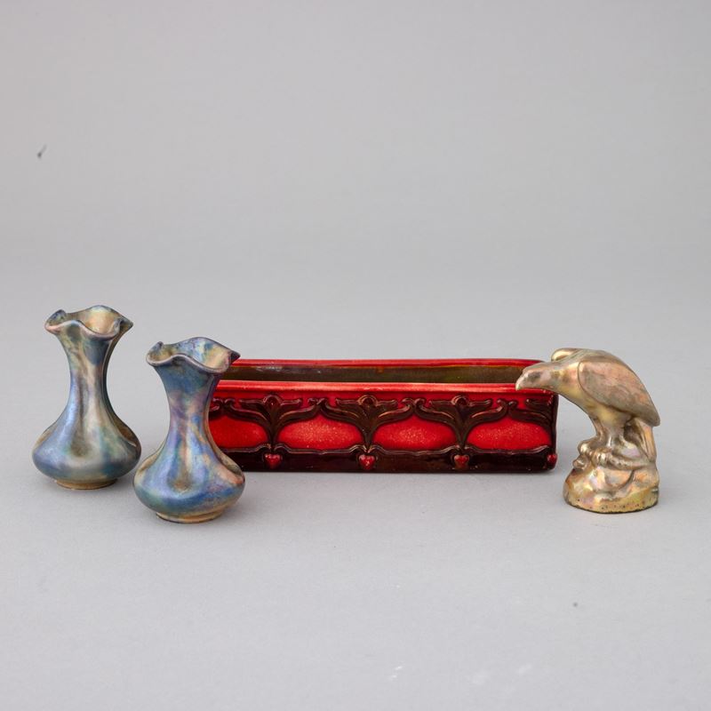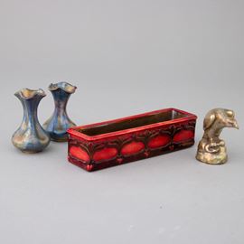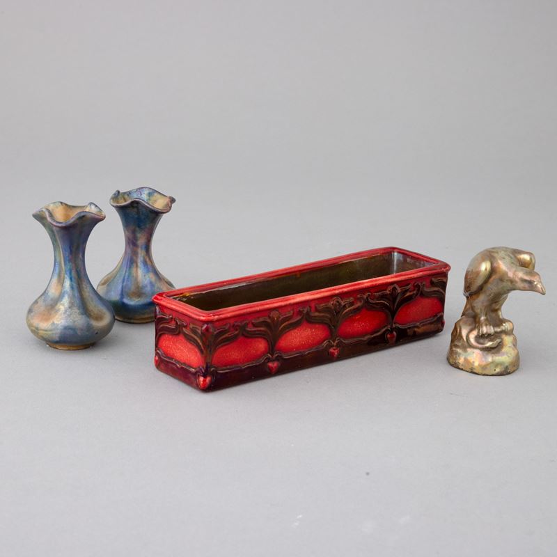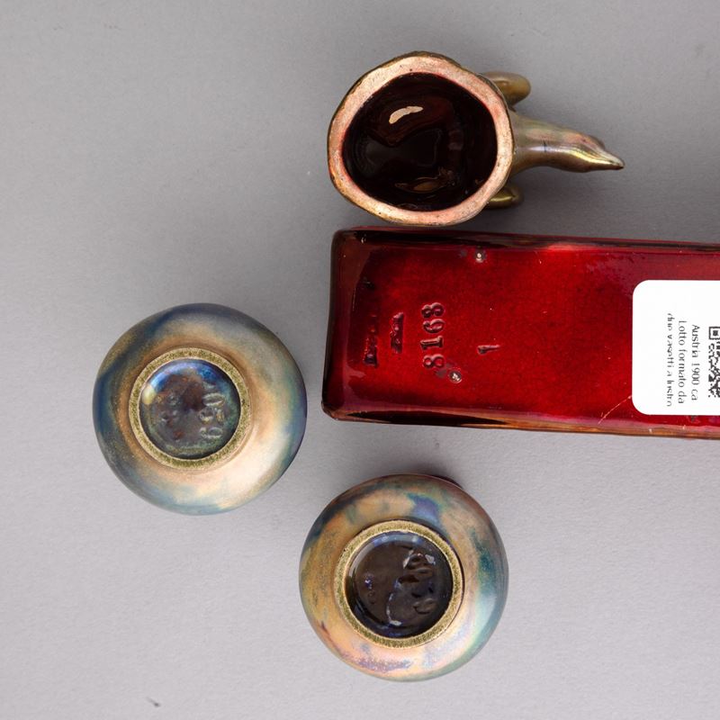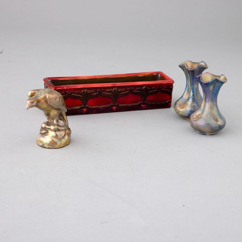 Lotto formato da due vasetti solifleur a lustro, un uccellino e un portapenne a sezione rettangolare in ceramica con decoro a smalti policromi.