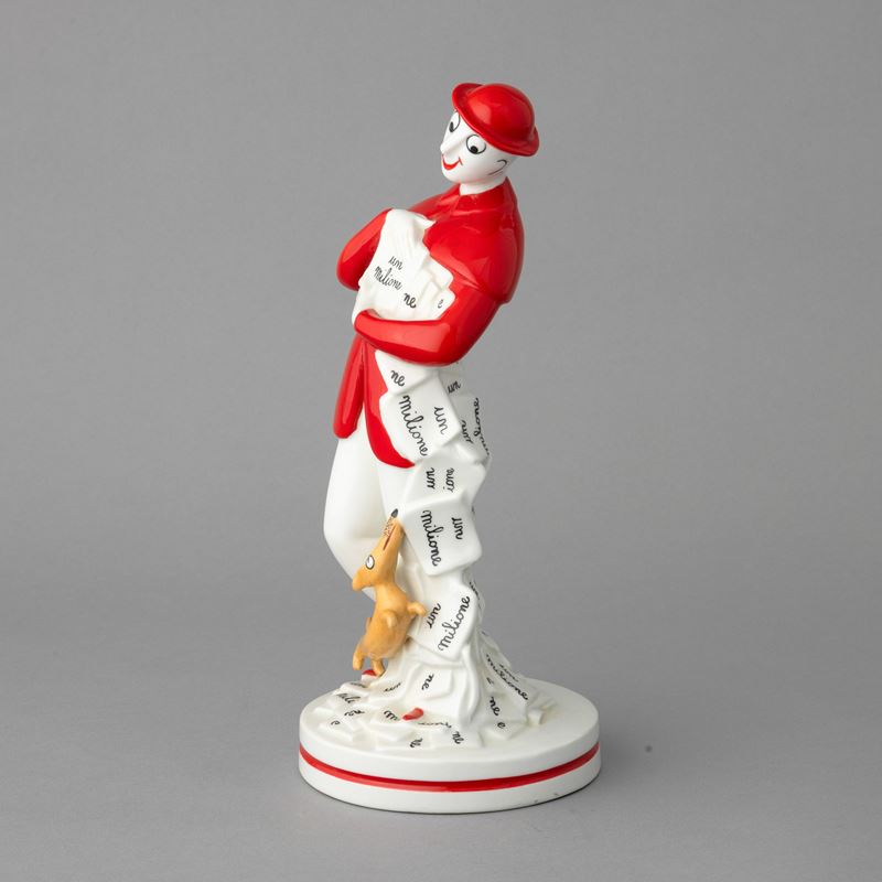 Figura rappresentante il Signor Bonaventura in porcellana modellata a stampo con decoro in policromia.