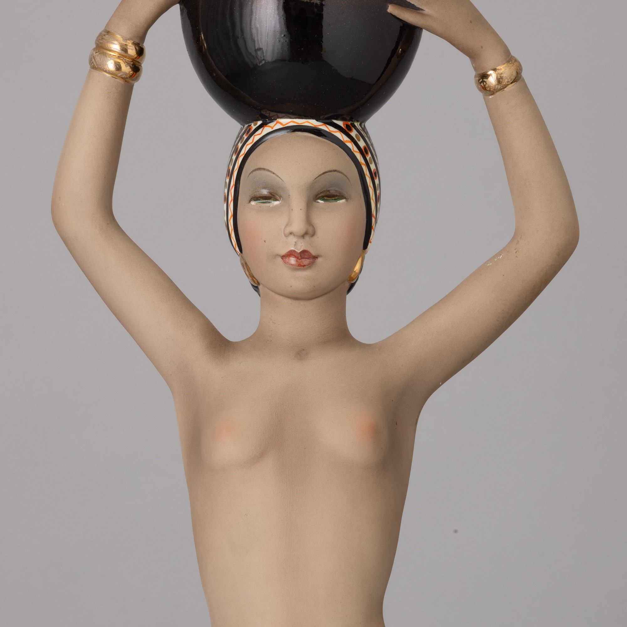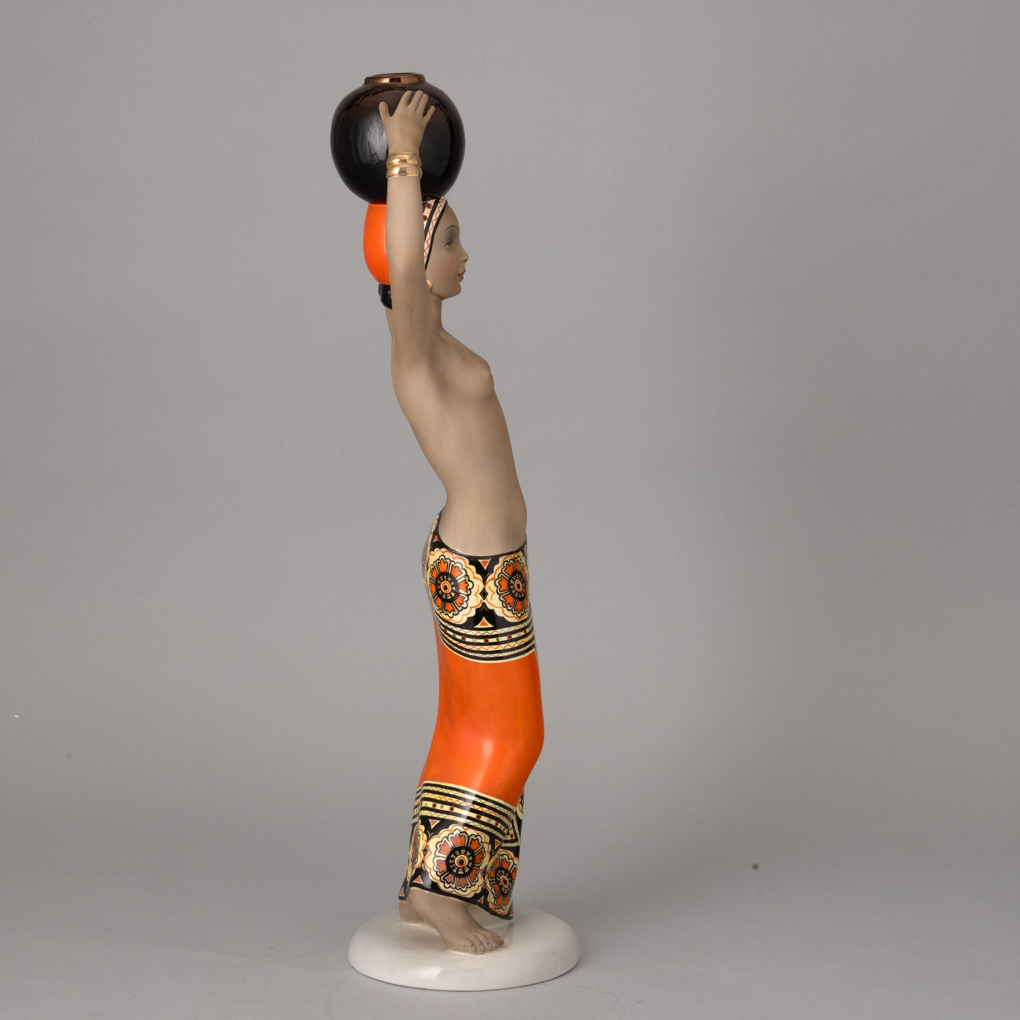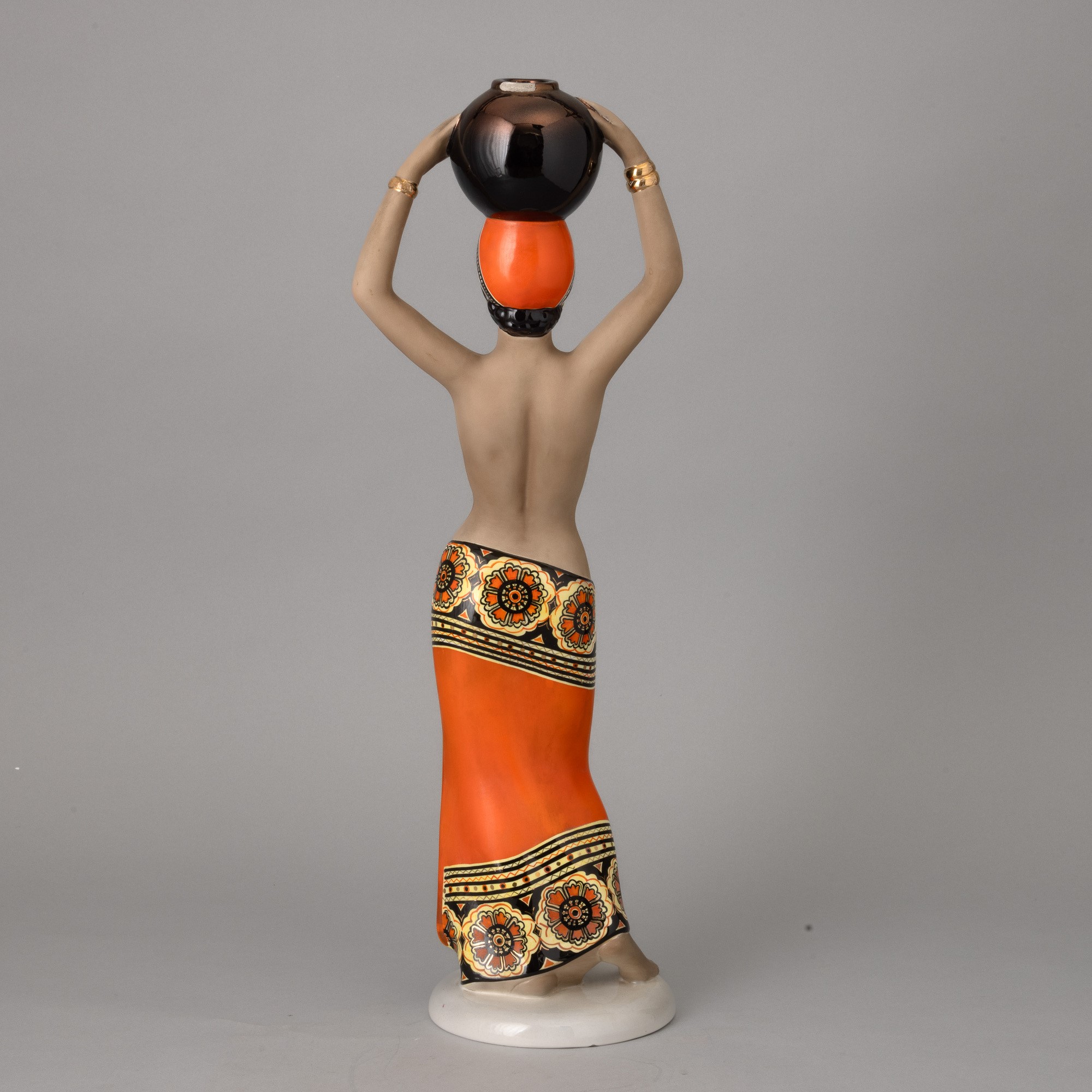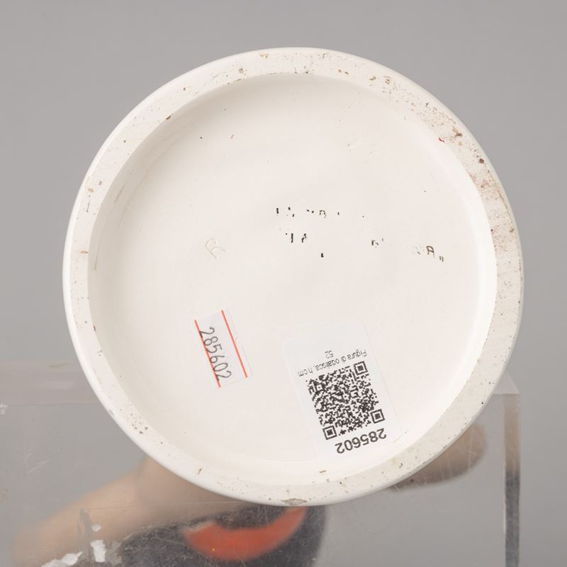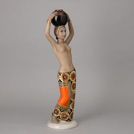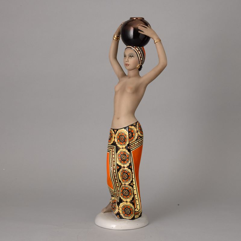 Scultura in terraglia a colaggio raffigurante portatrice d'acqua con decoro a smalti policromi.
