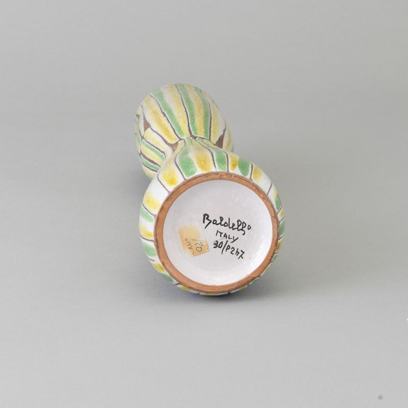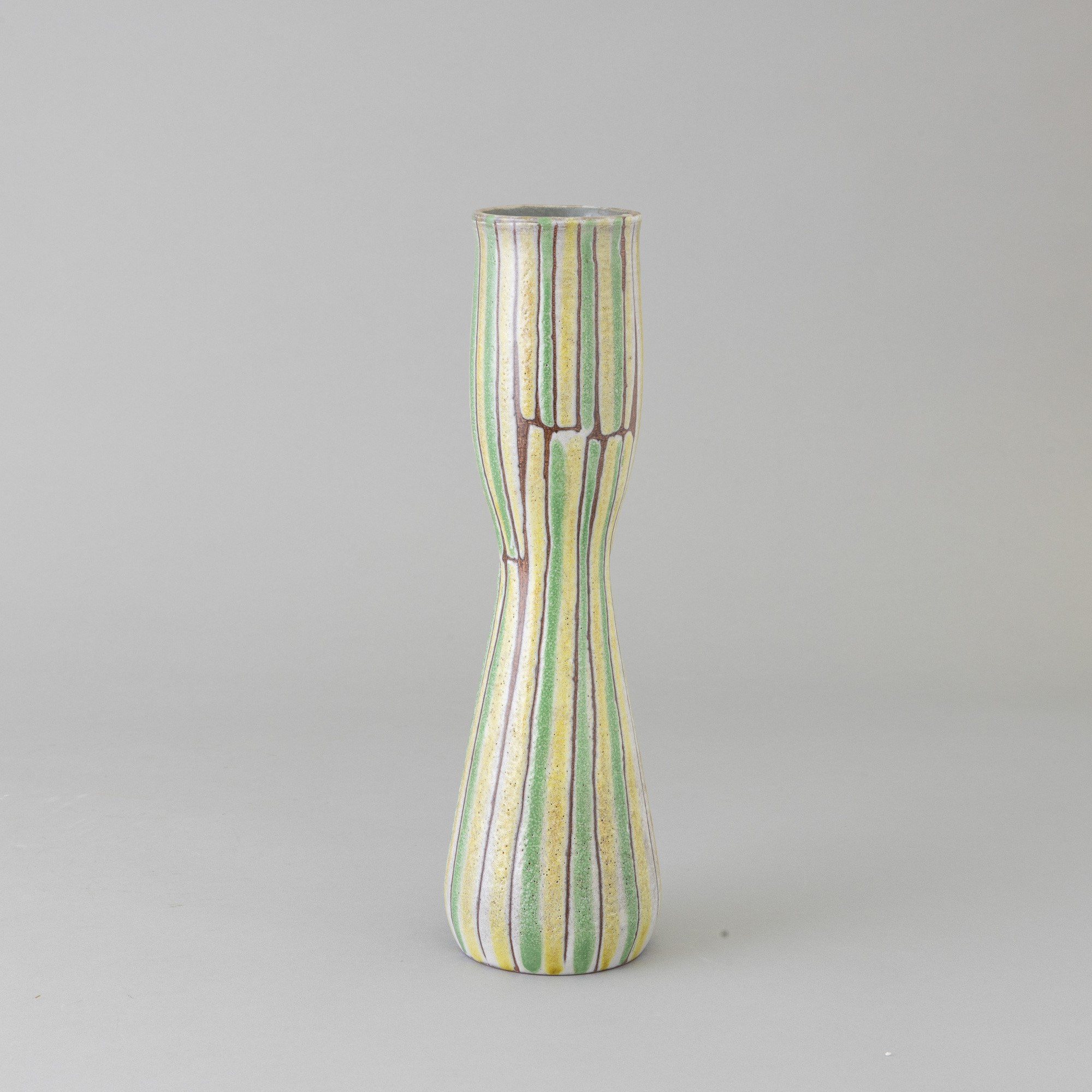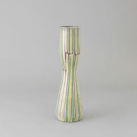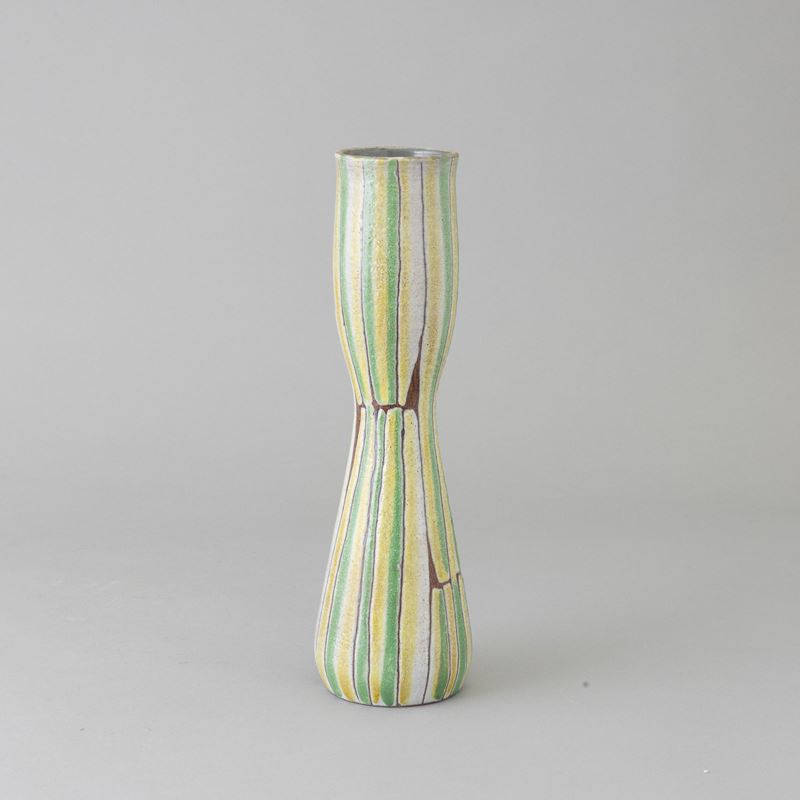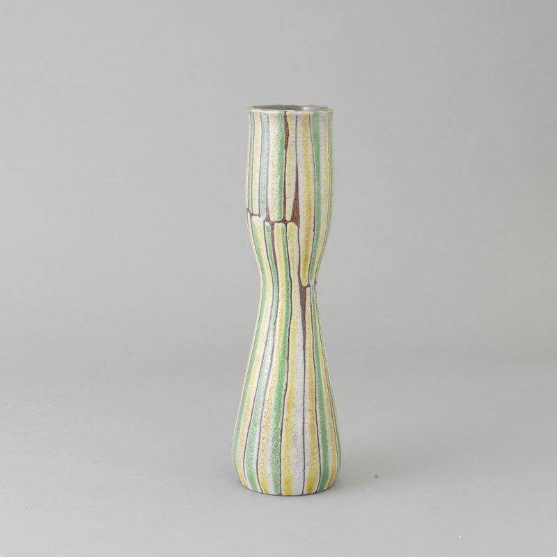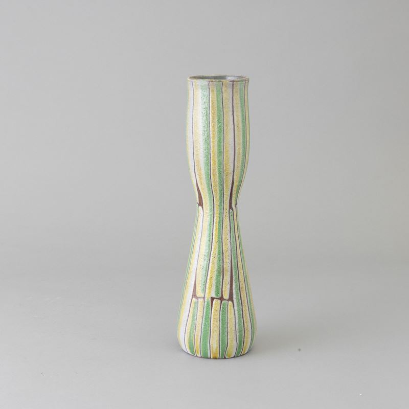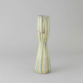 Vaso con strozzatura centrale in ceramica con decoro di fasce policrome.