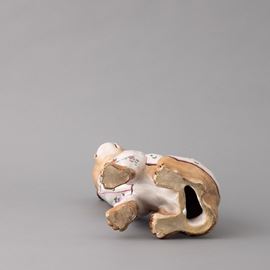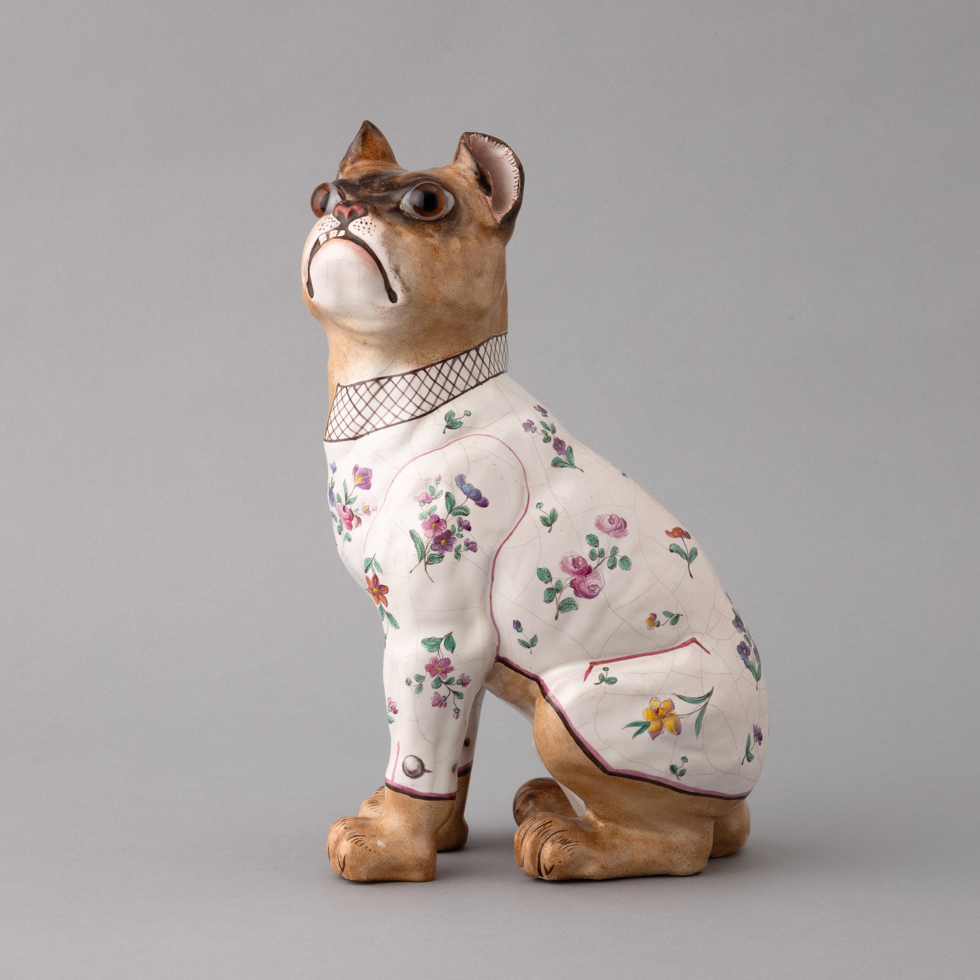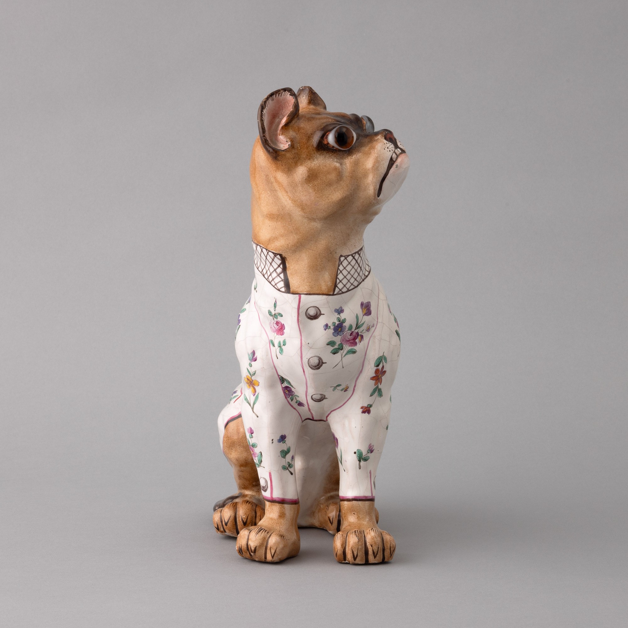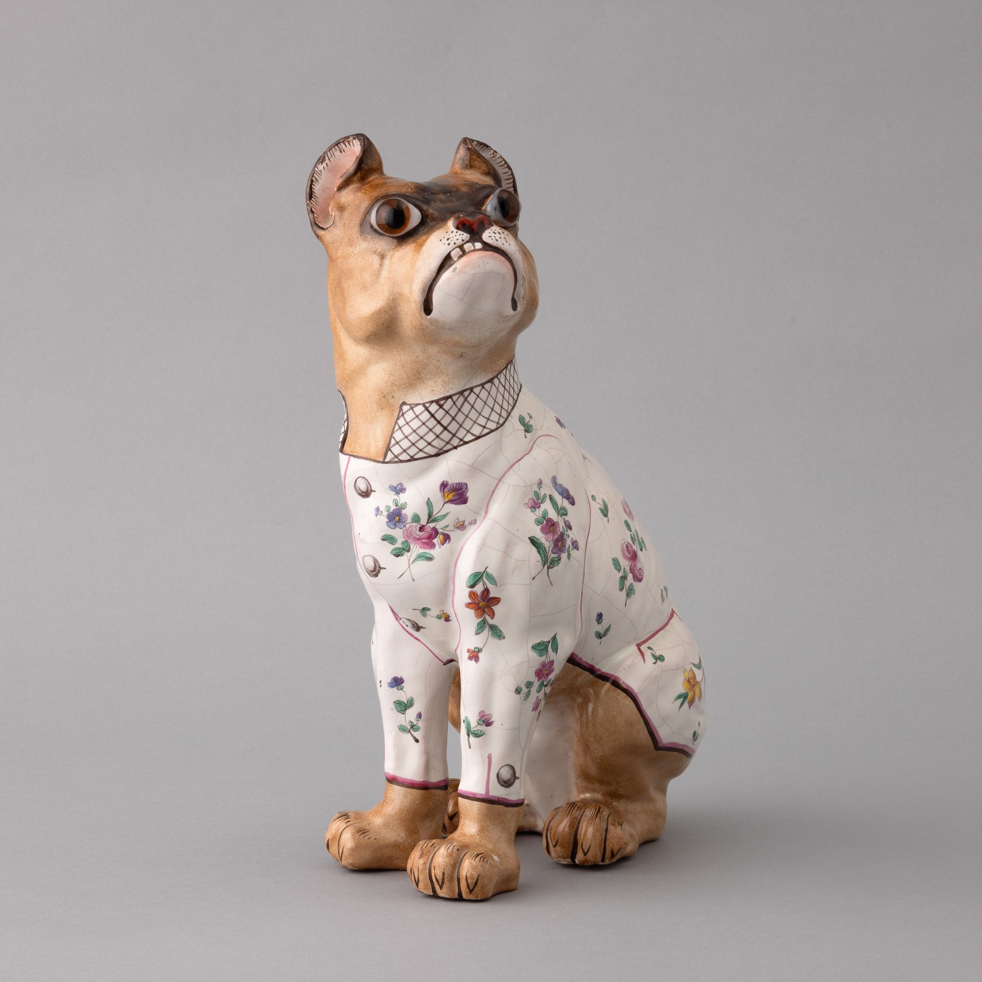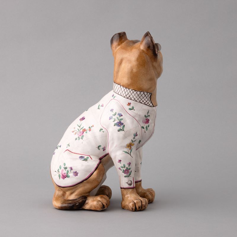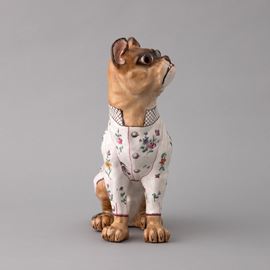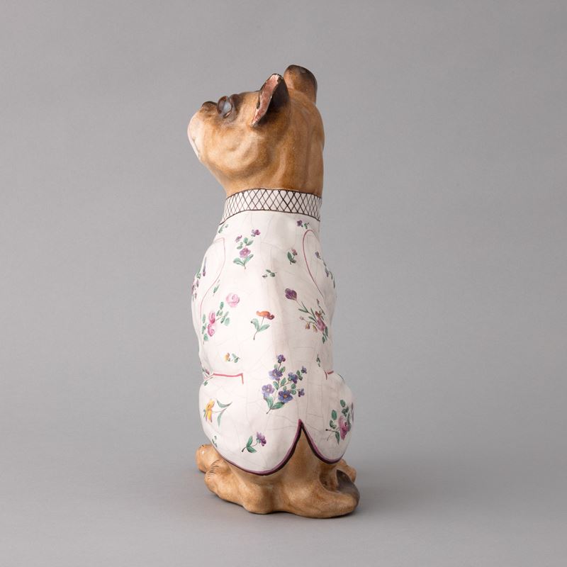 Scultura raffigurante bulldog francese in ceramica con decoro di smalti policromi e dorature. Occhi applicati in vetro.