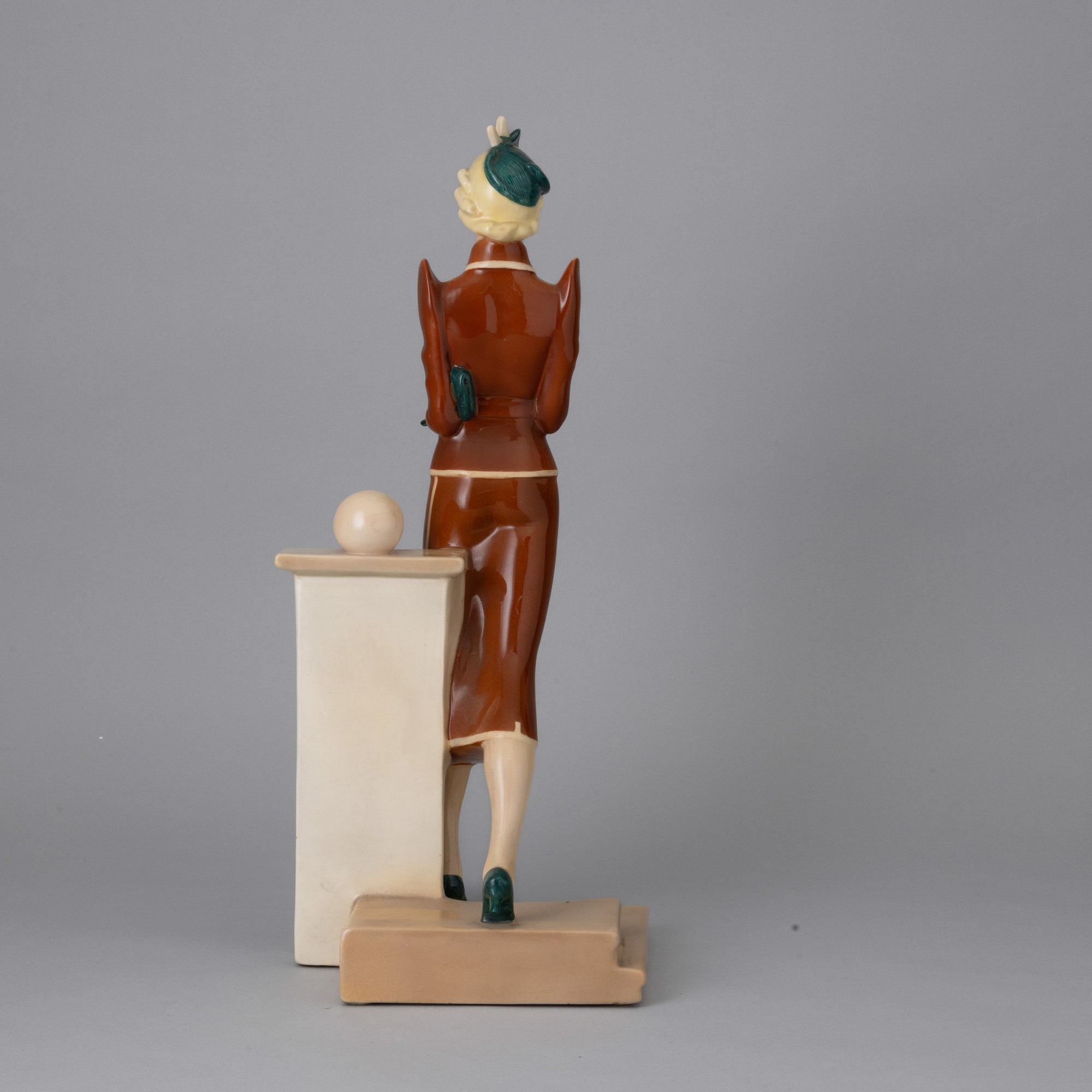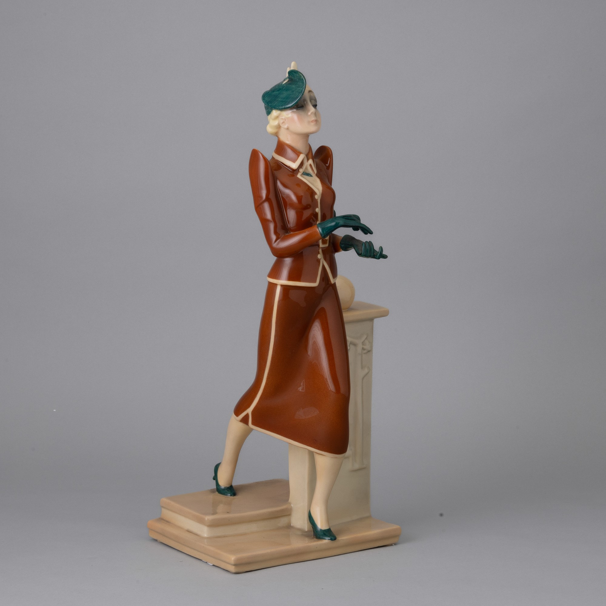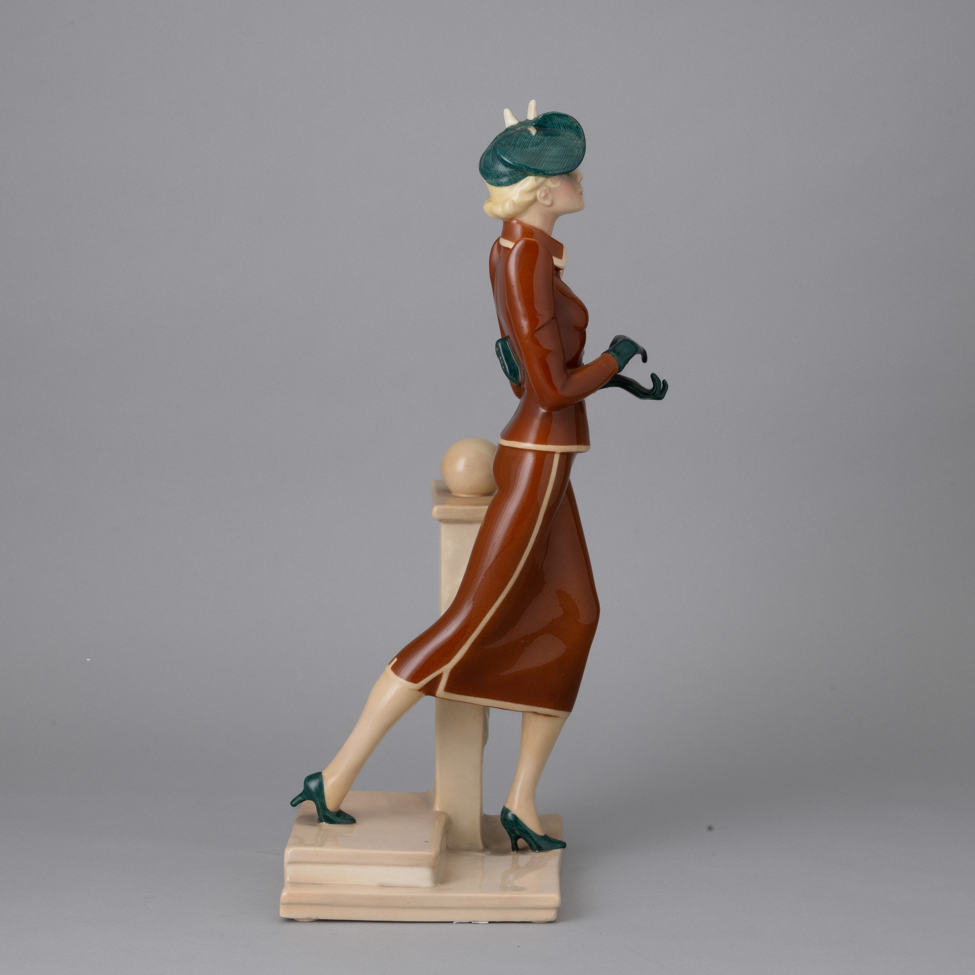 Figura di donna vestita alla moda che scende le scale in terraglia a colaggio con decoro policromo.