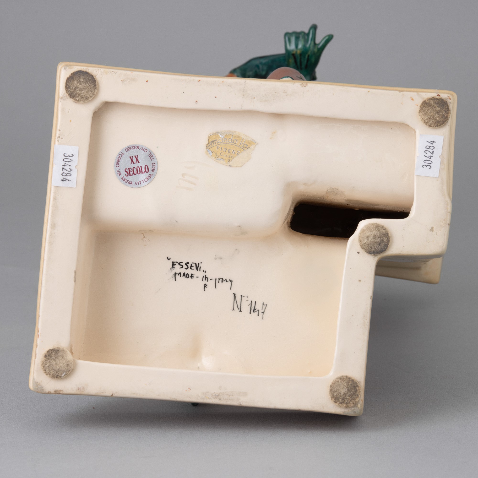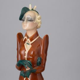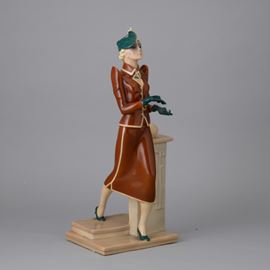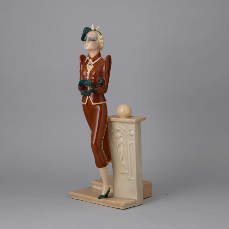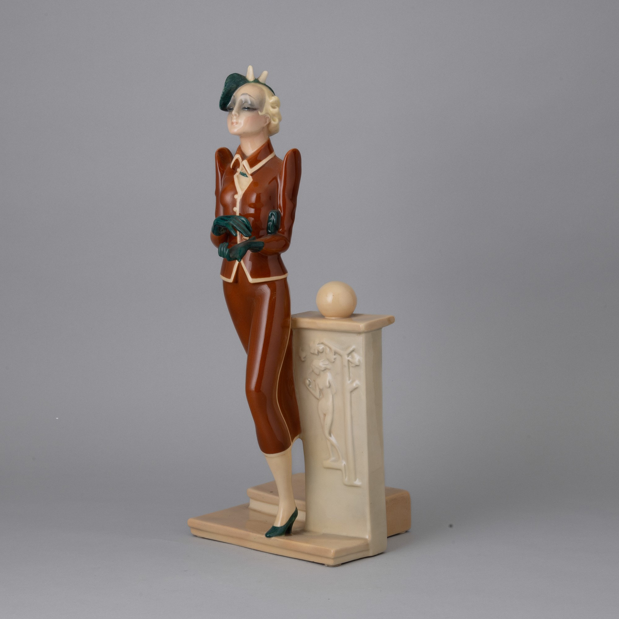 Figura di donna vestita alla moda che scende le scale in terraglia a colaggio con decoro policromo.