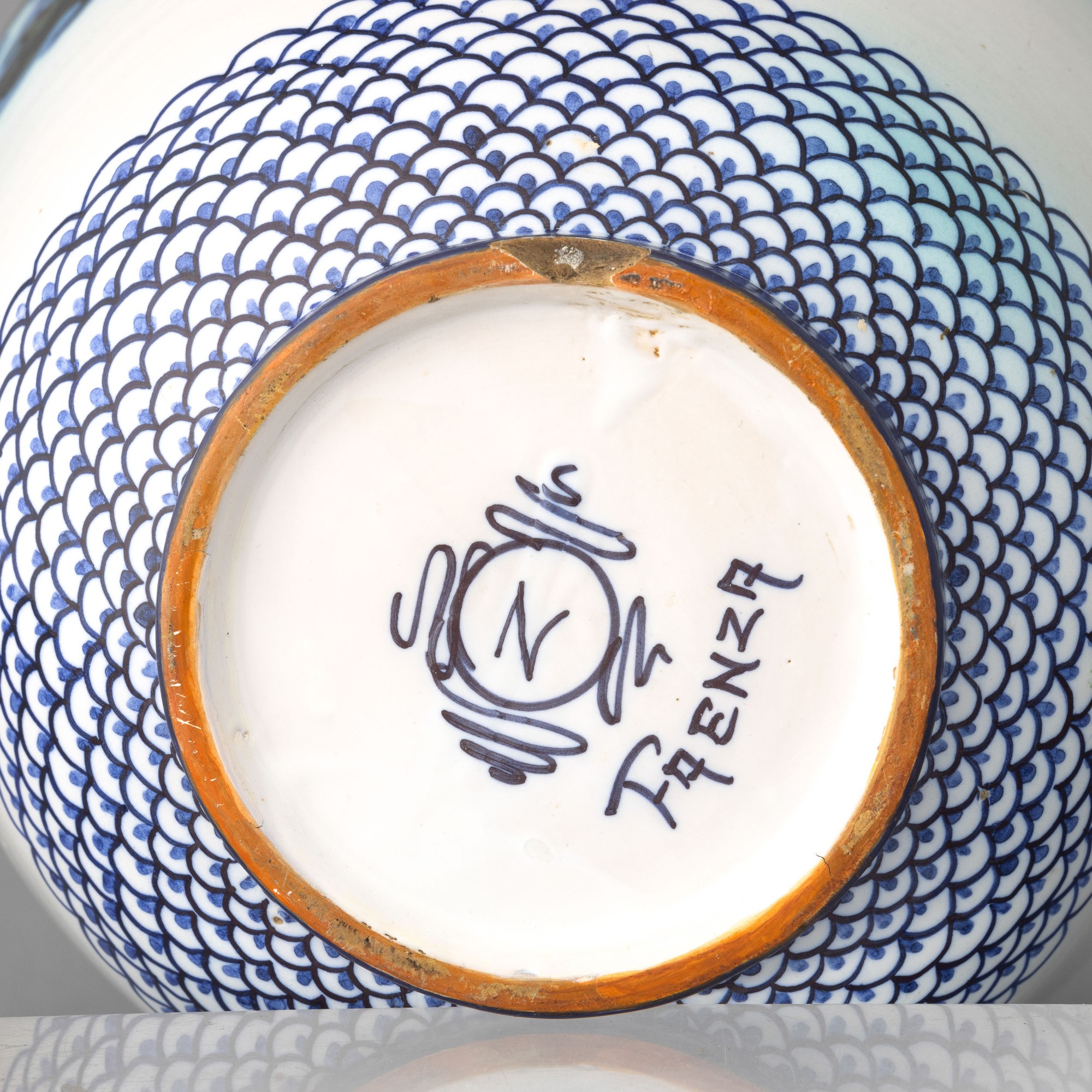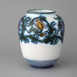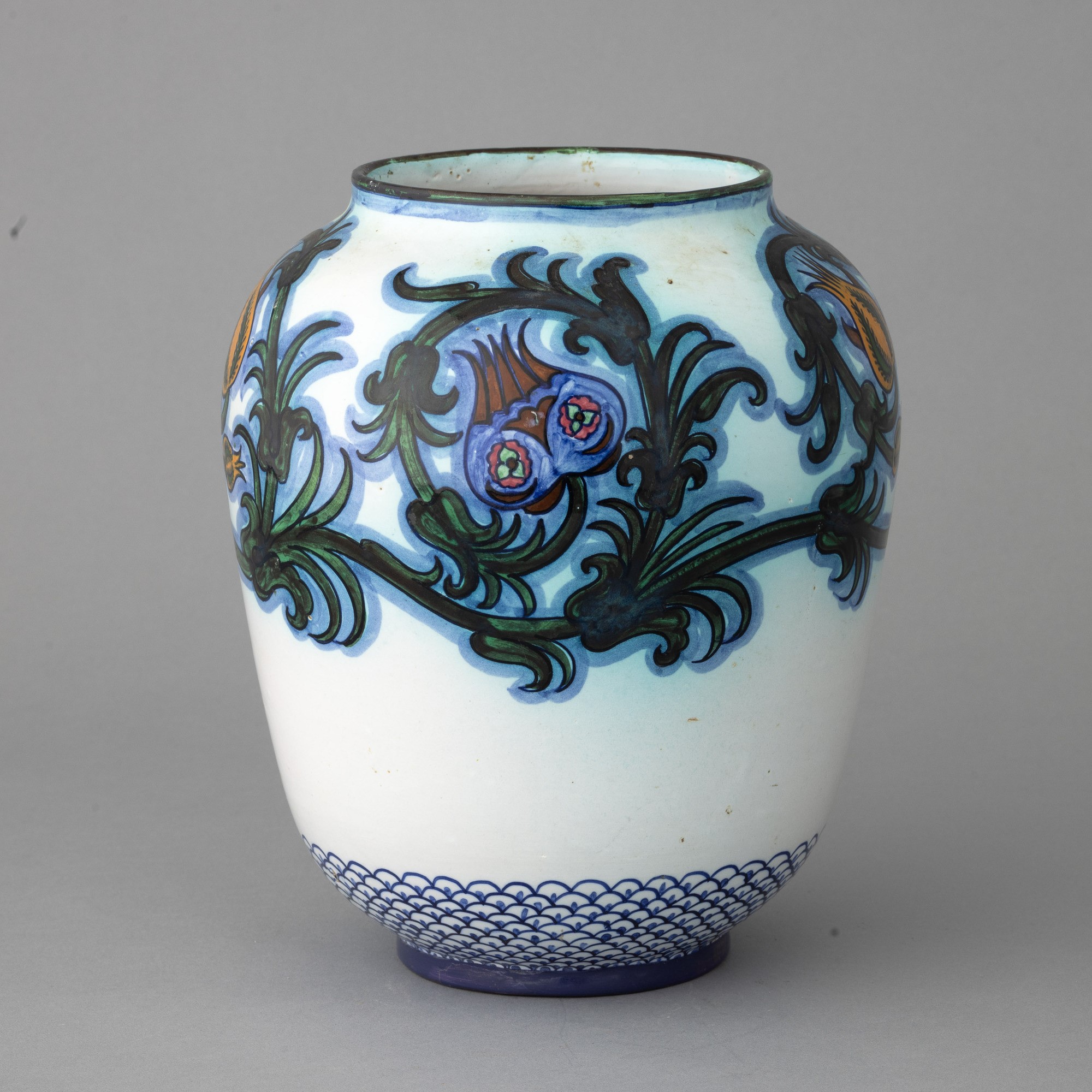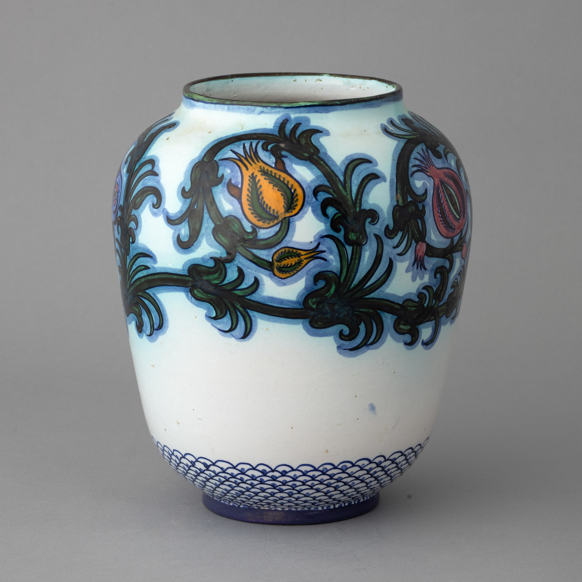 Vaso in terracotta maiolicata con decoro di tralci di melograno. Fondo a decoro di scaglie policrome.