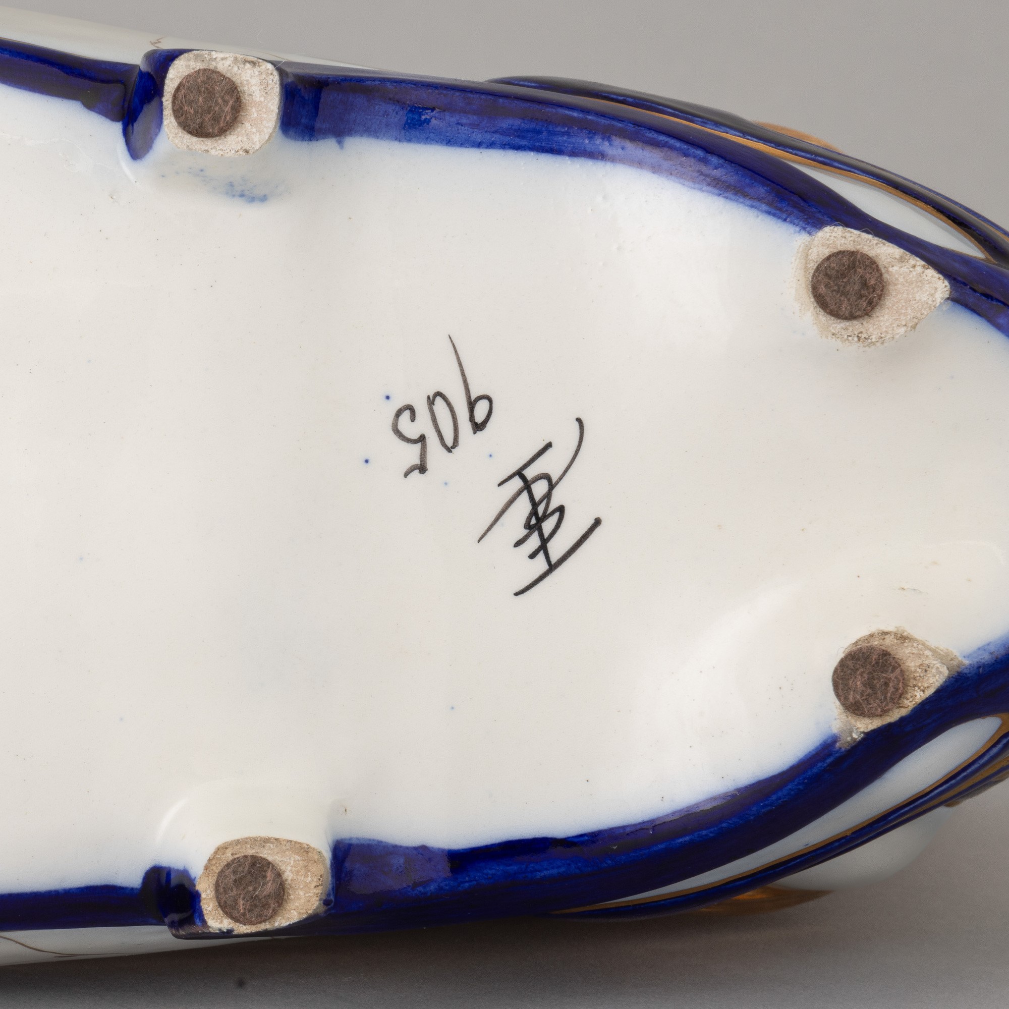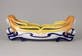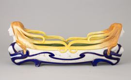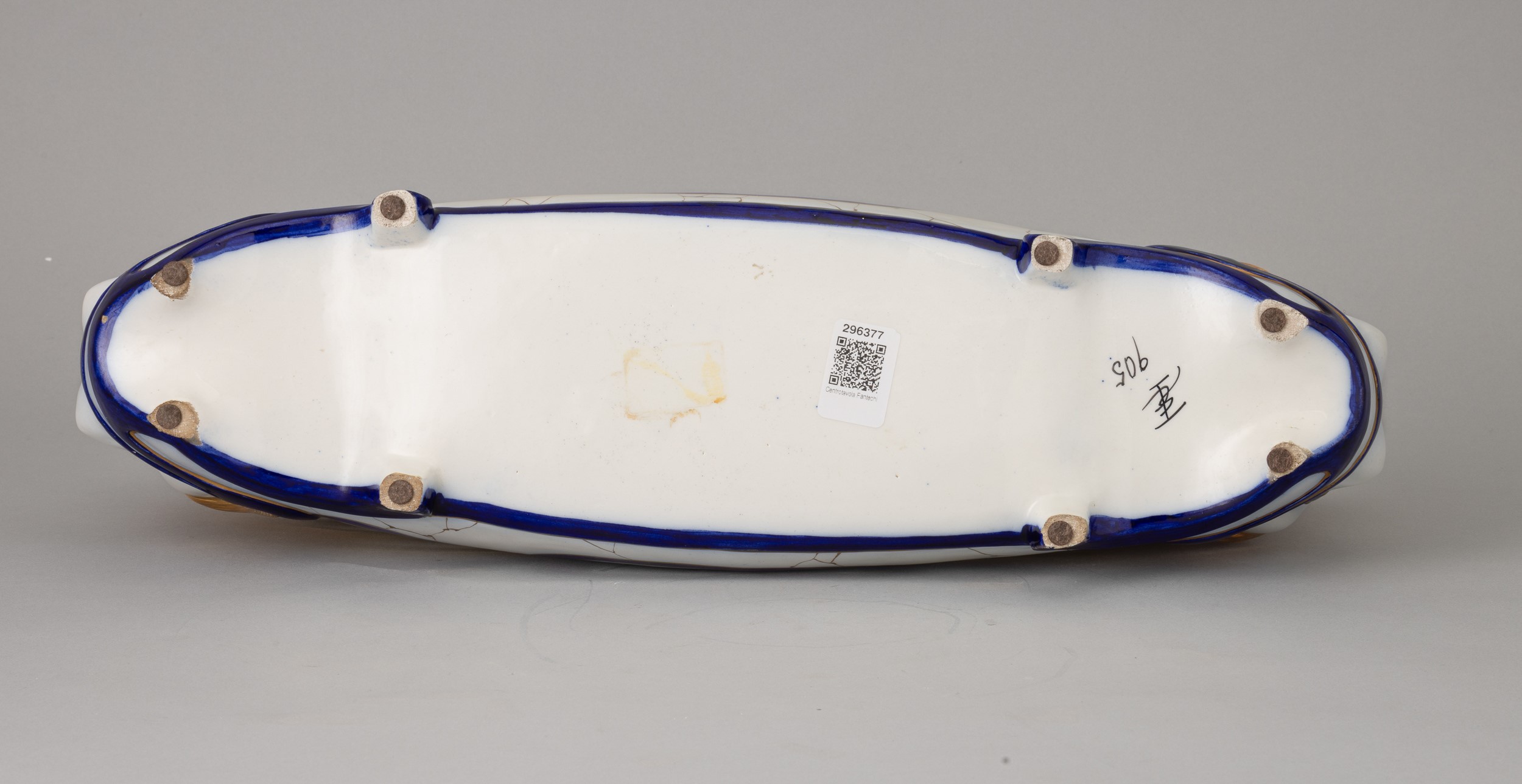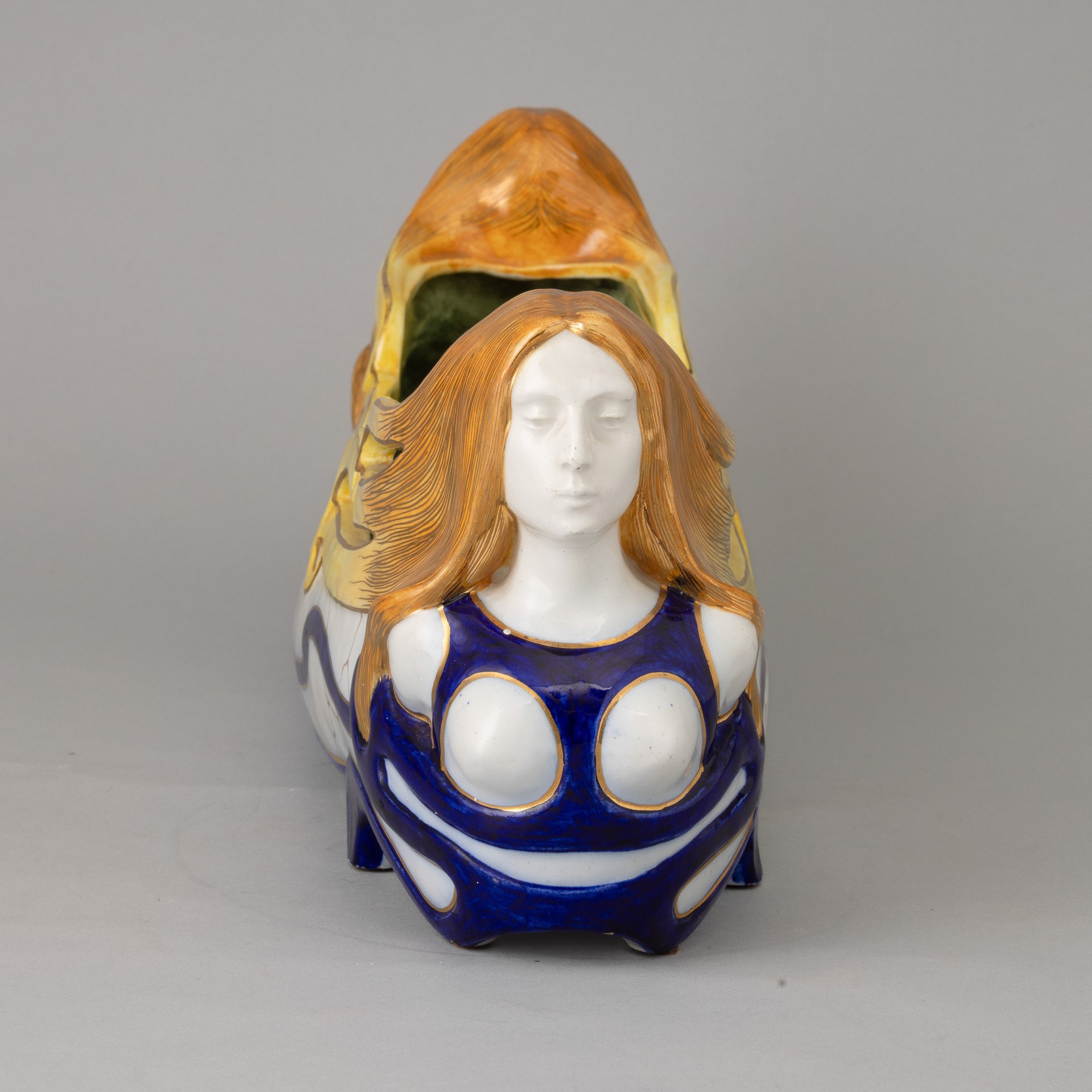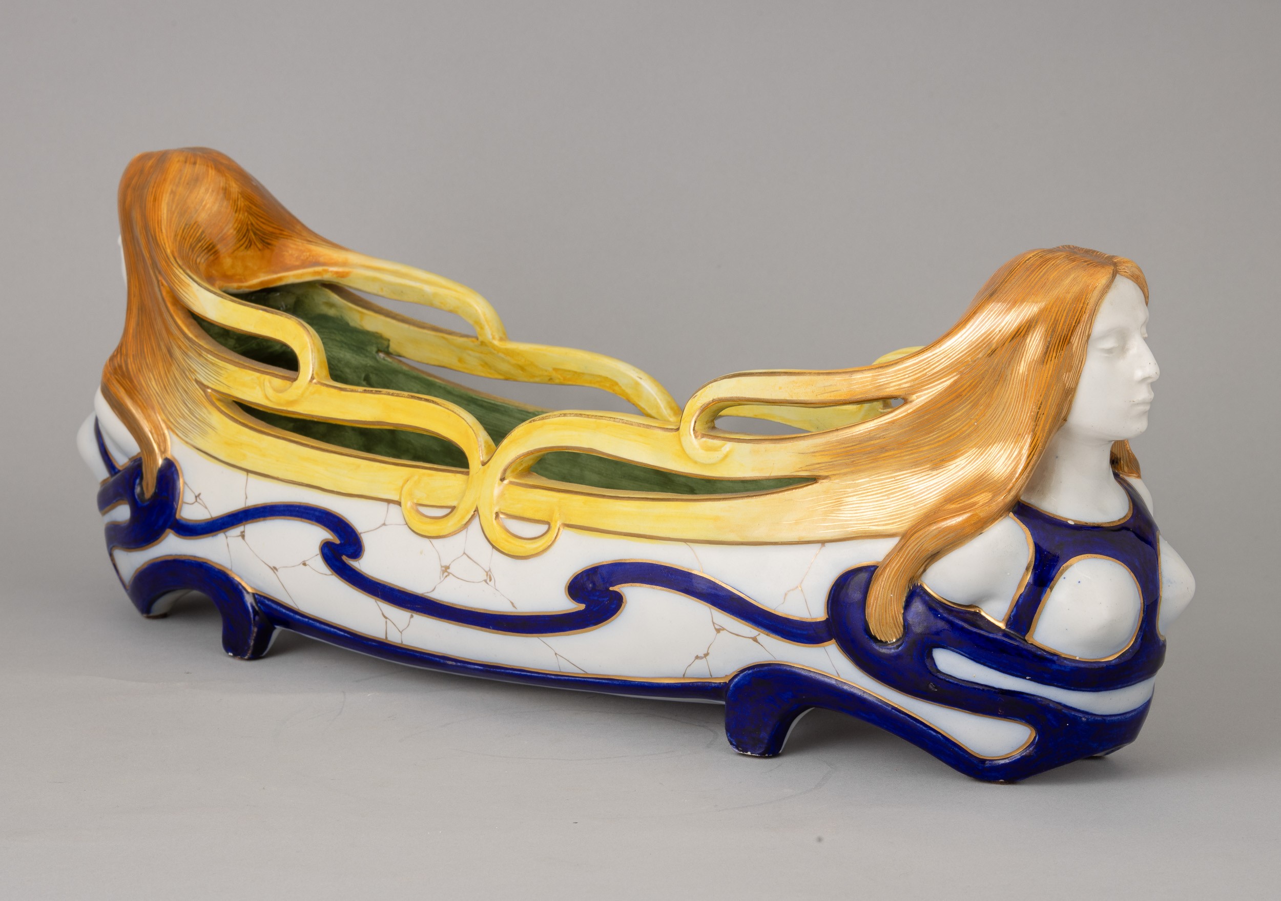 Centrotavola ovale in ceramica con decoro di protomi femminili, smalti policromi e dorature.