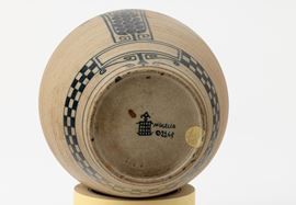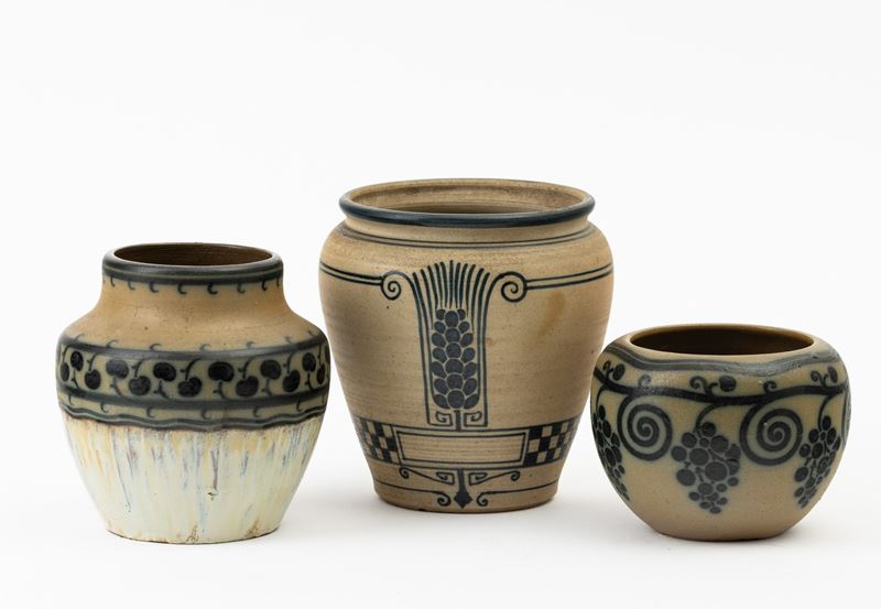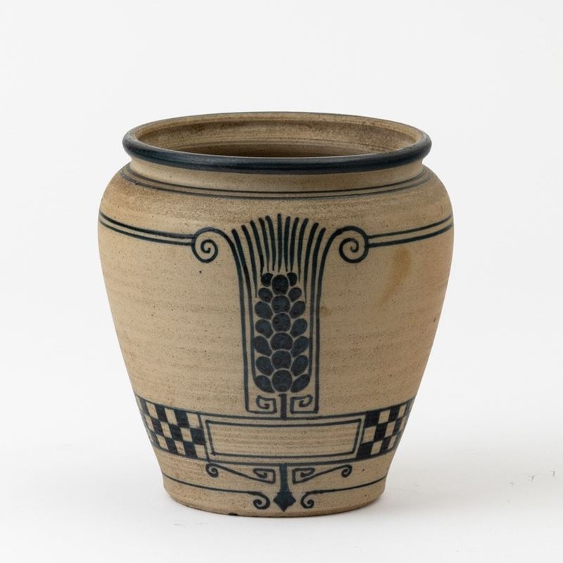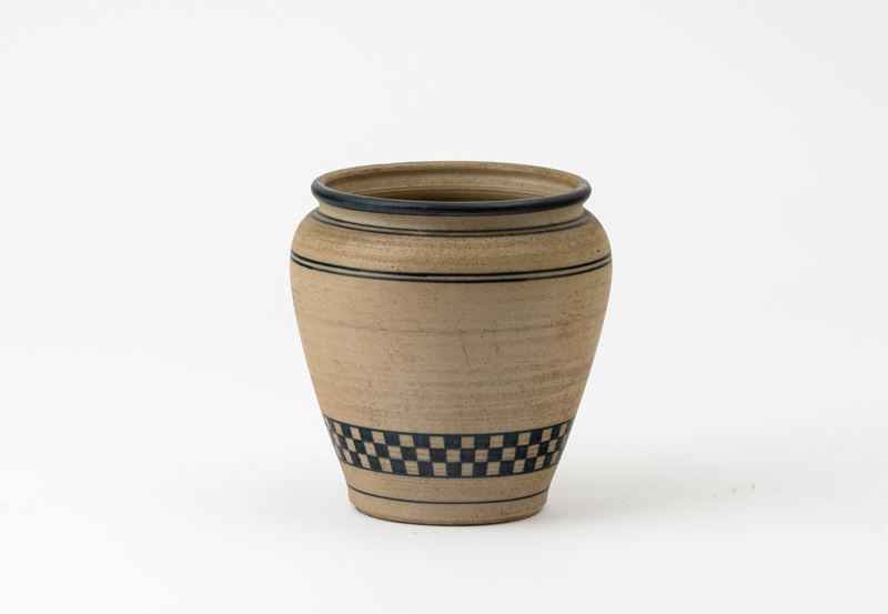 Vaso in grès con decoro di spiga stilizzate e fascia a dama.