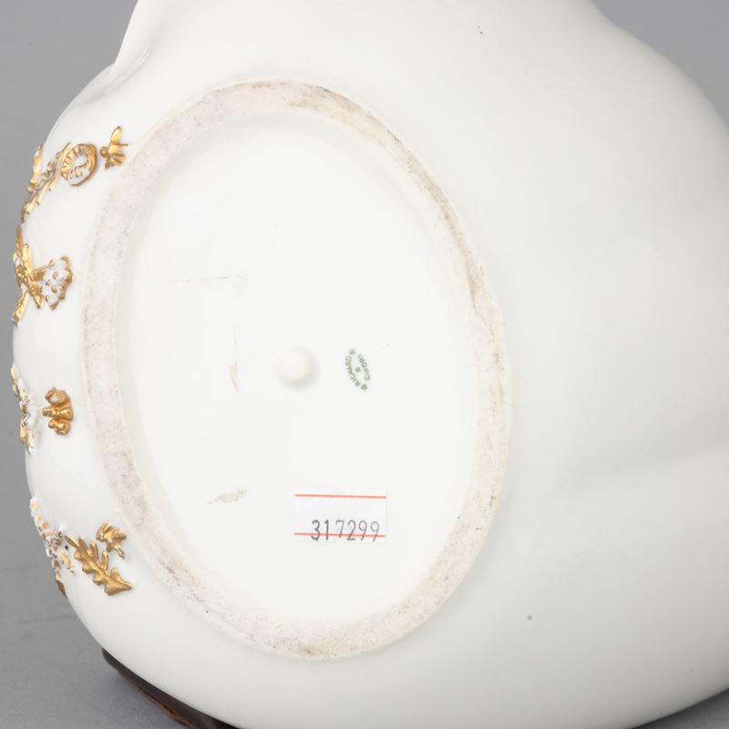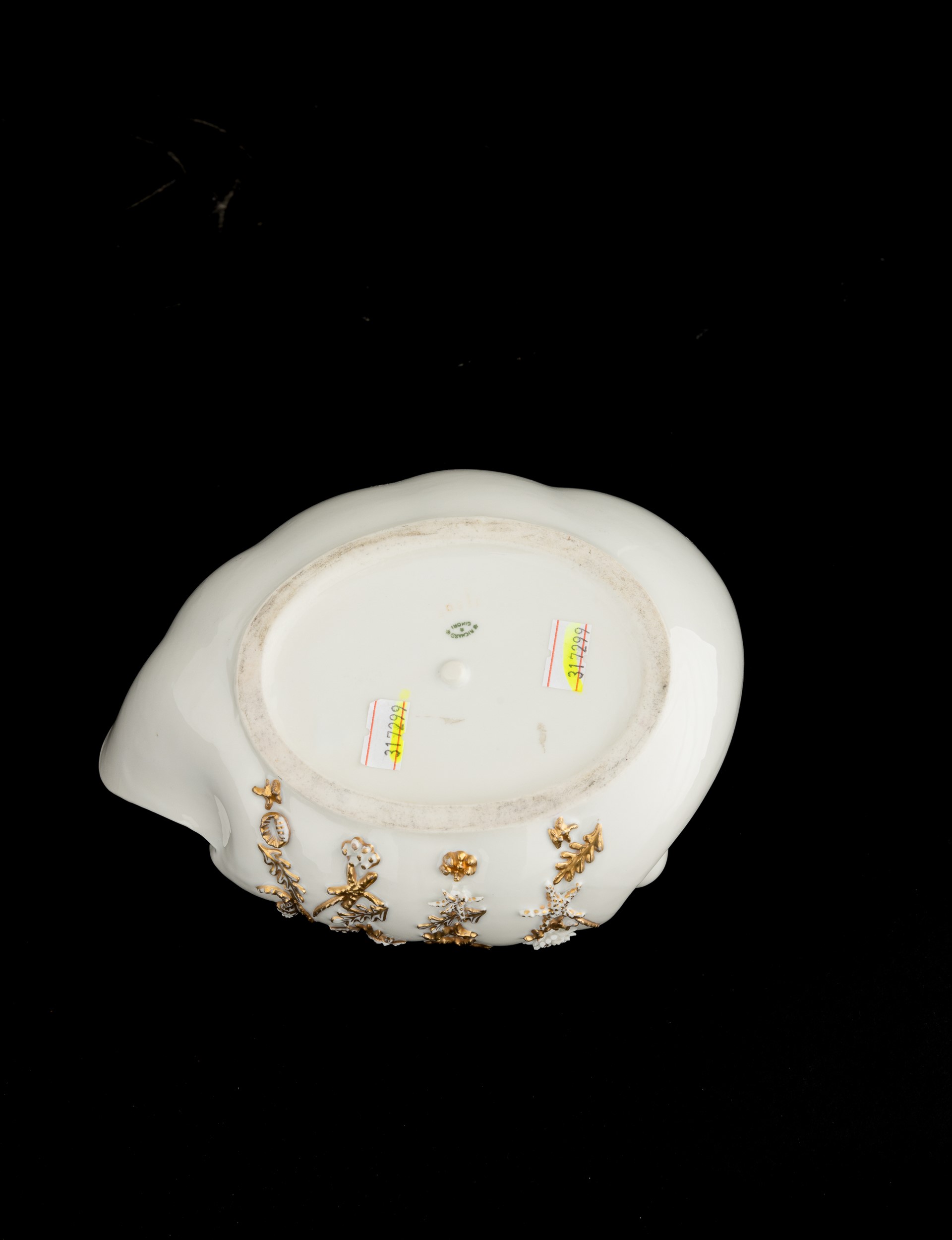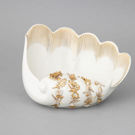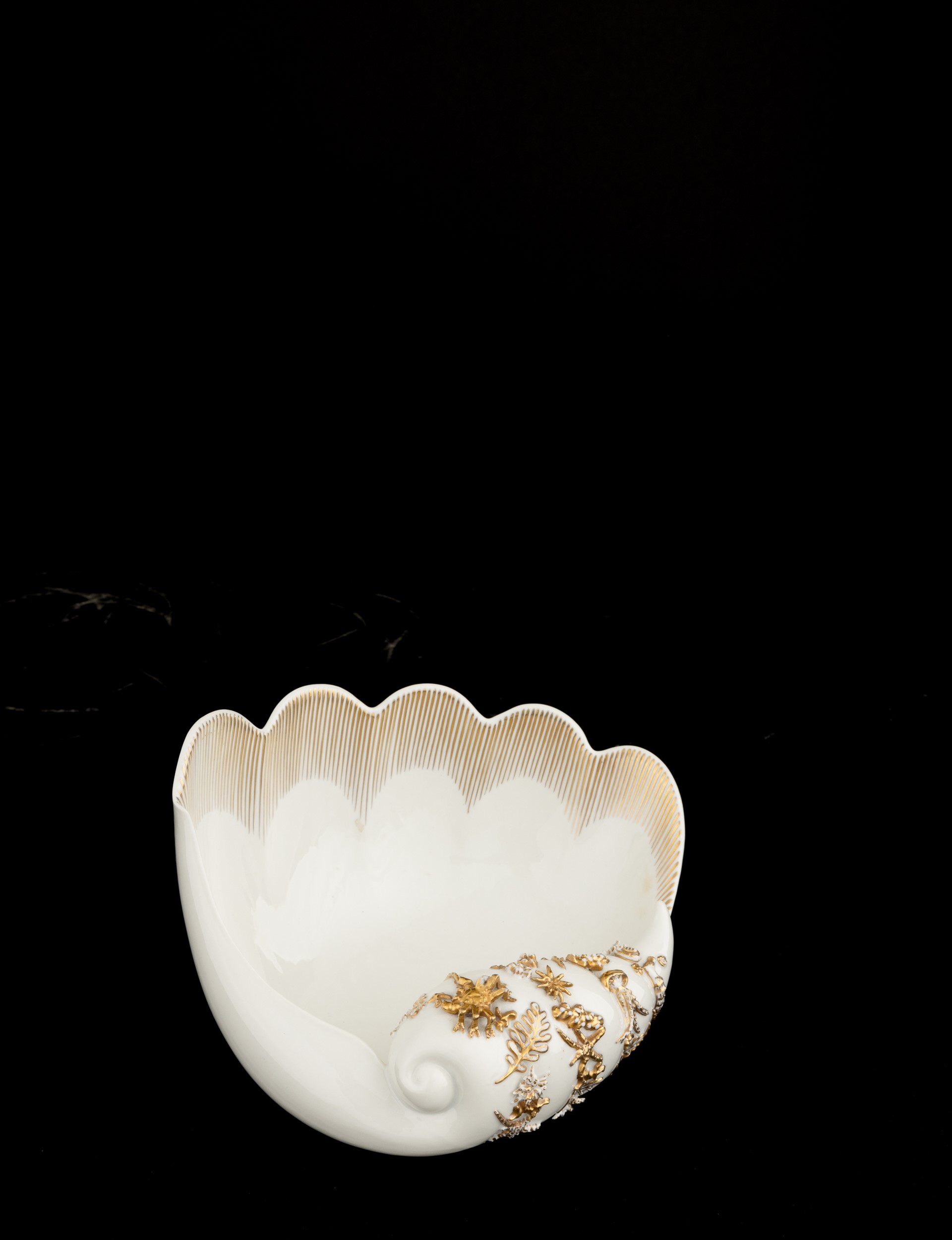 Soprammobile in forma di conchiglia in porcellana con applicazioni di motivi marini in oro.