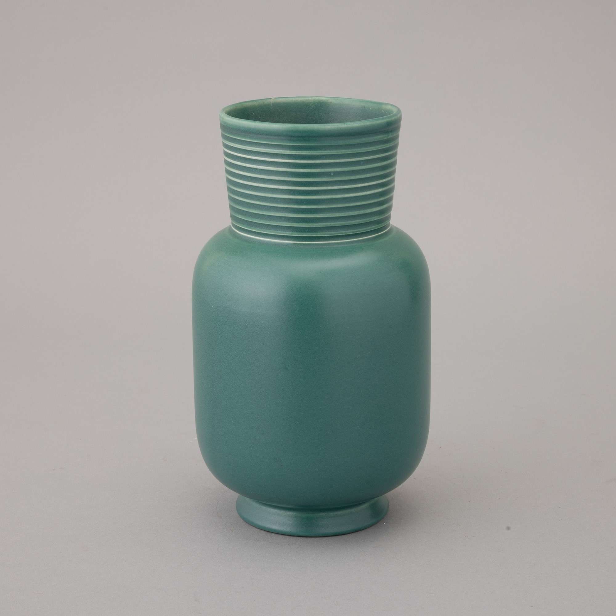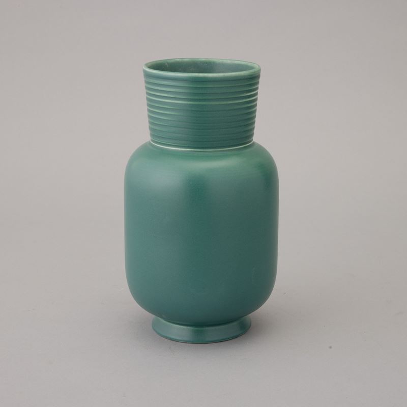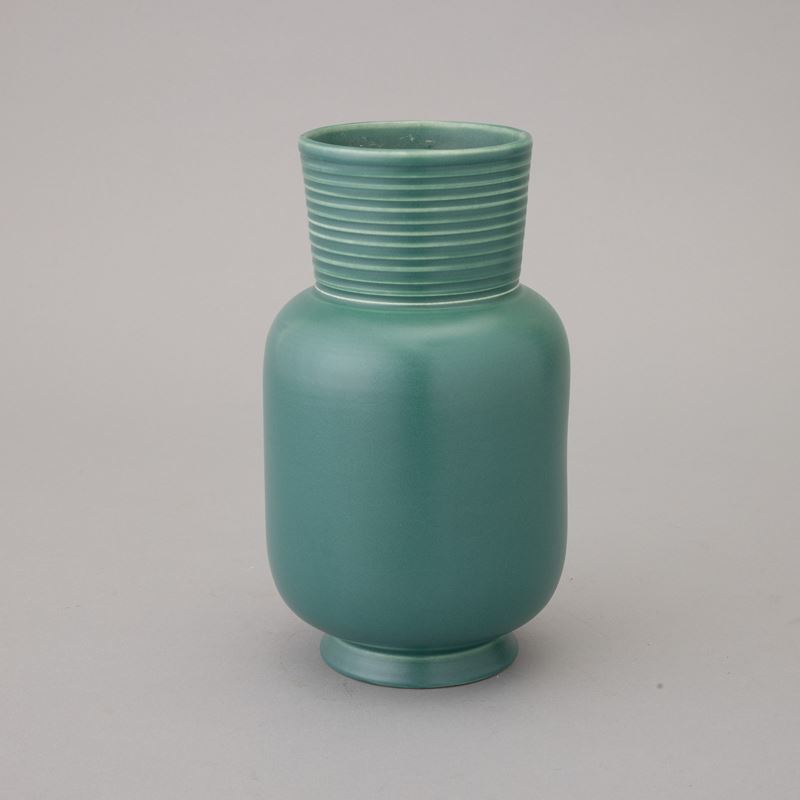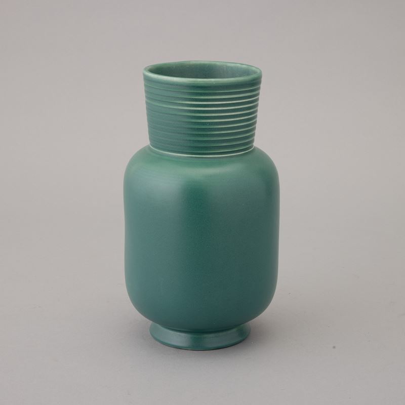 Vaso in terraglia a colaggio con decoro di smalto verde. Marchio della manifattura alla base.