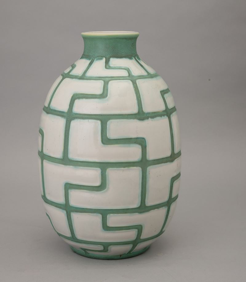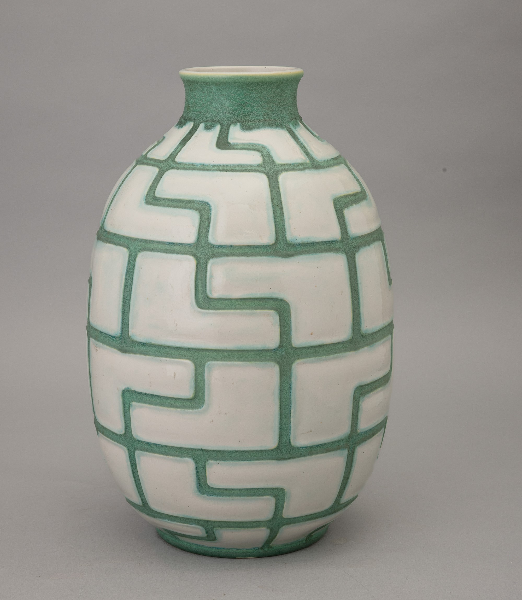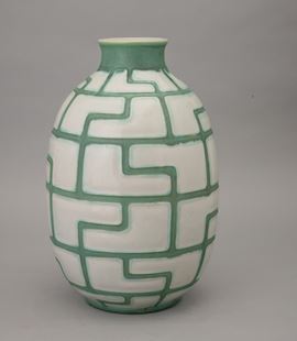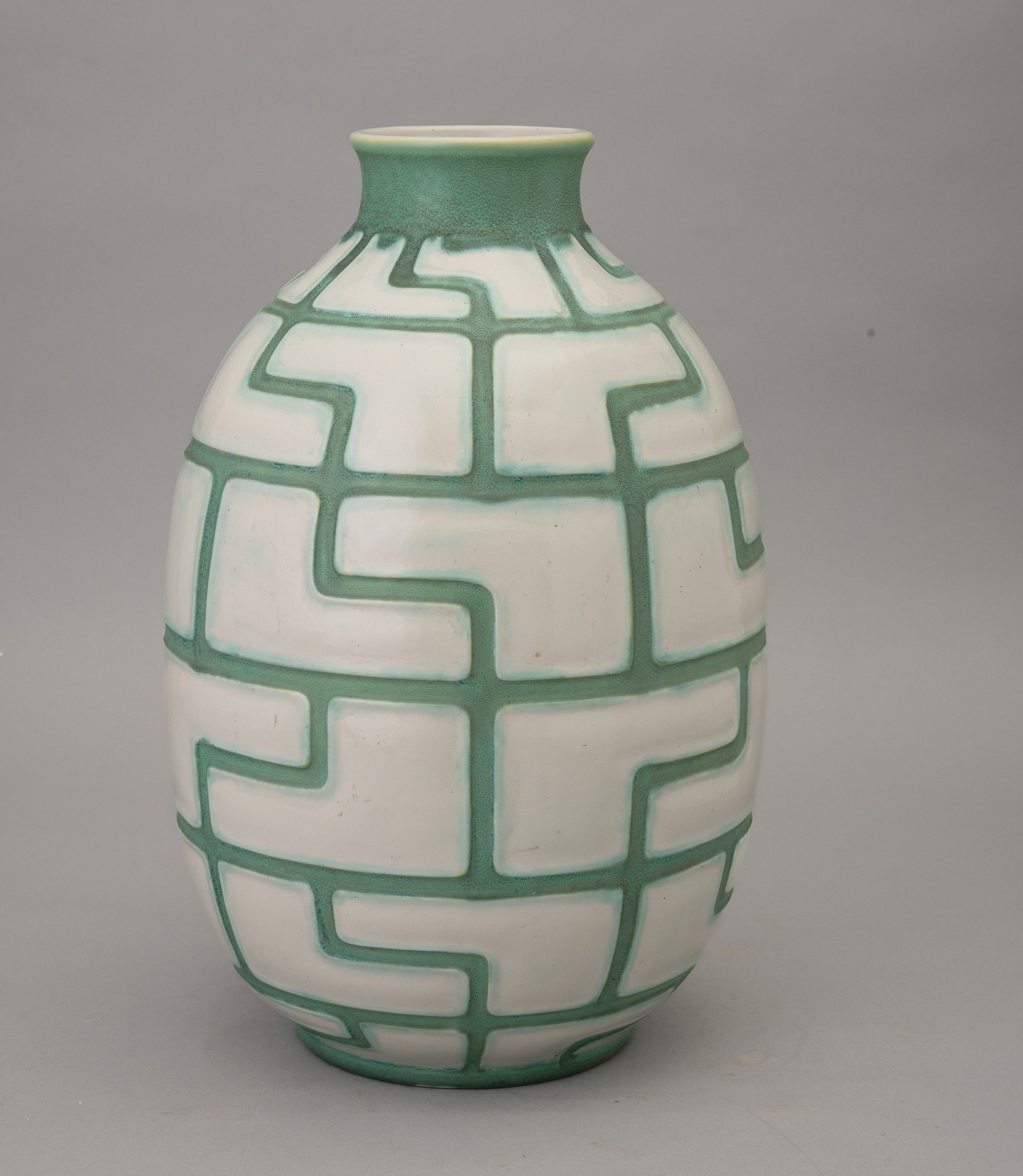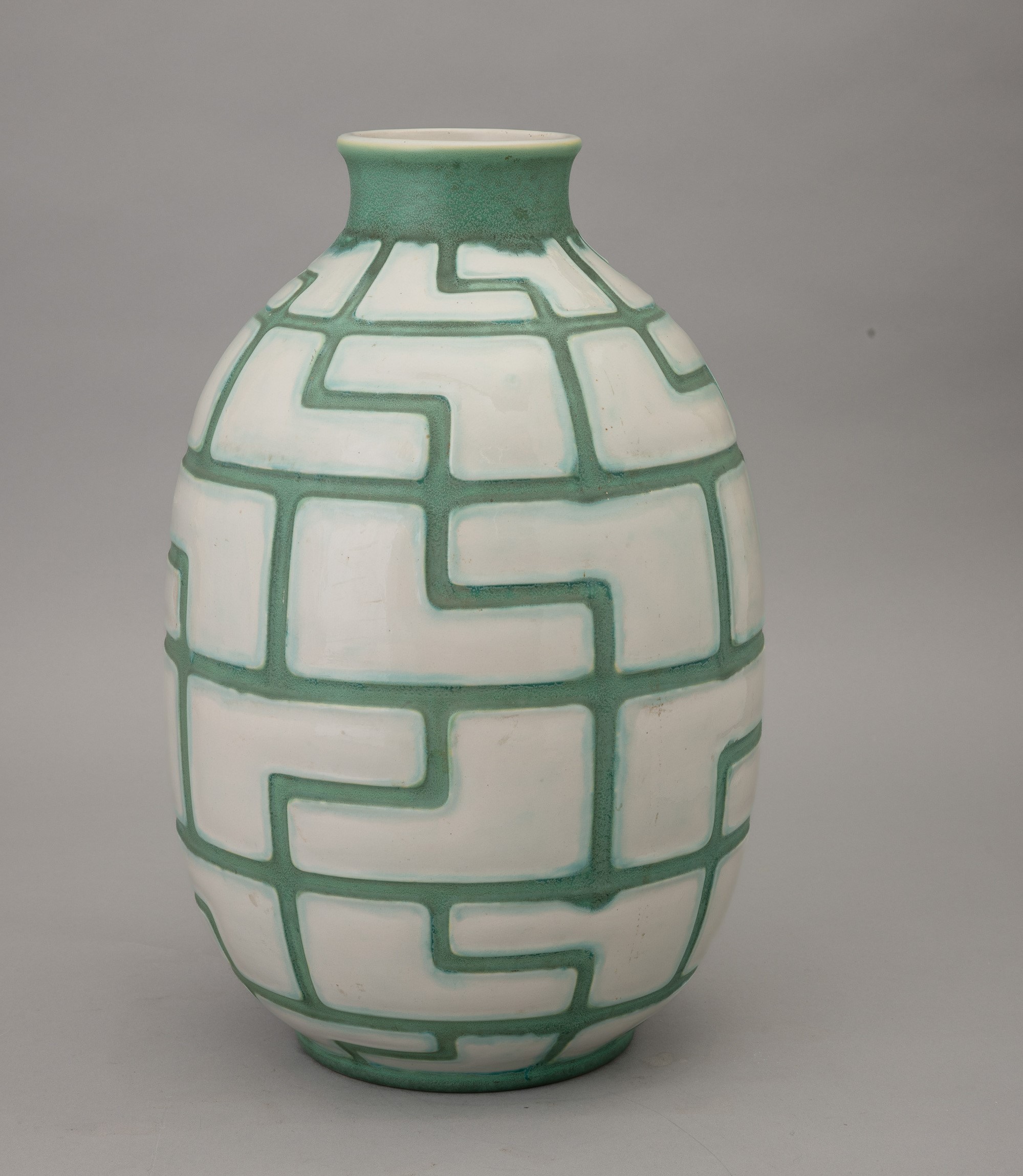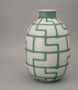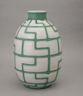 Grande vaso a uovo con collo svasato in terraglia a colaggio e decoro a labirinto in rilievo.