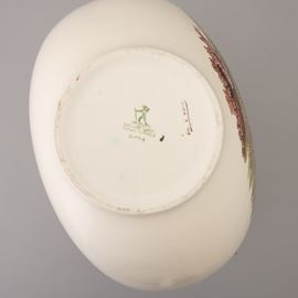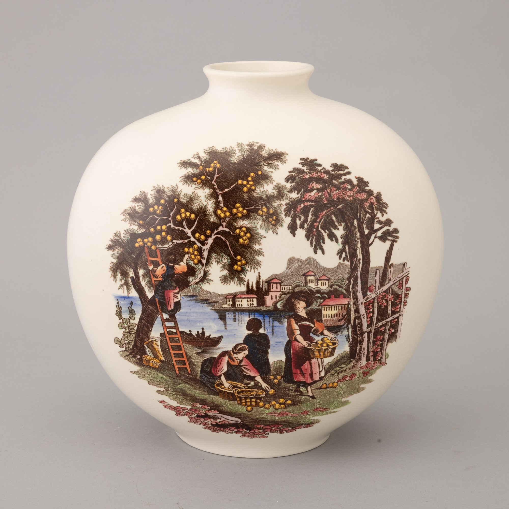 Vaso globulare a sezione ovale con piccolo collo in terraglia a colaggio con decoro serigrafato policromo con scena campestre.