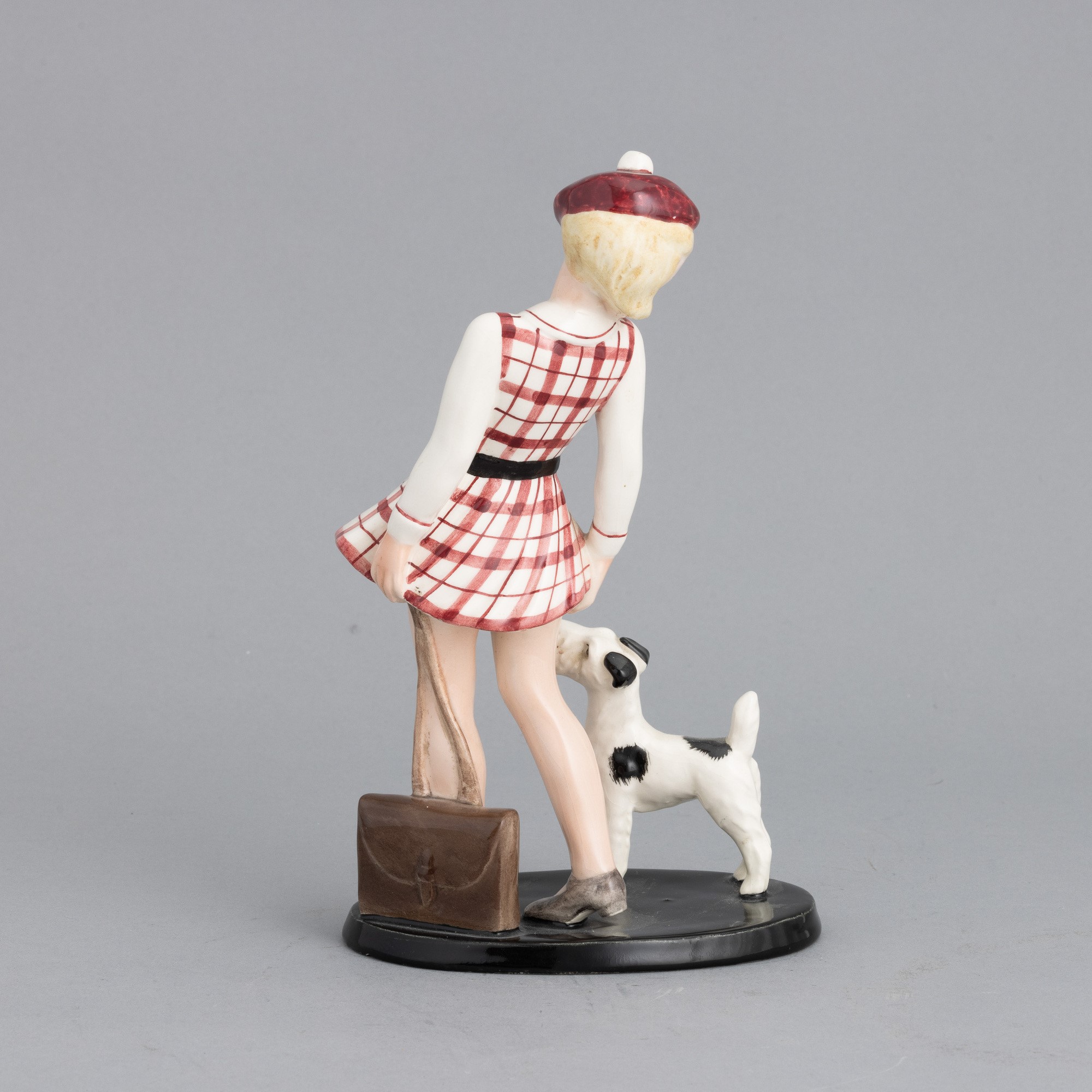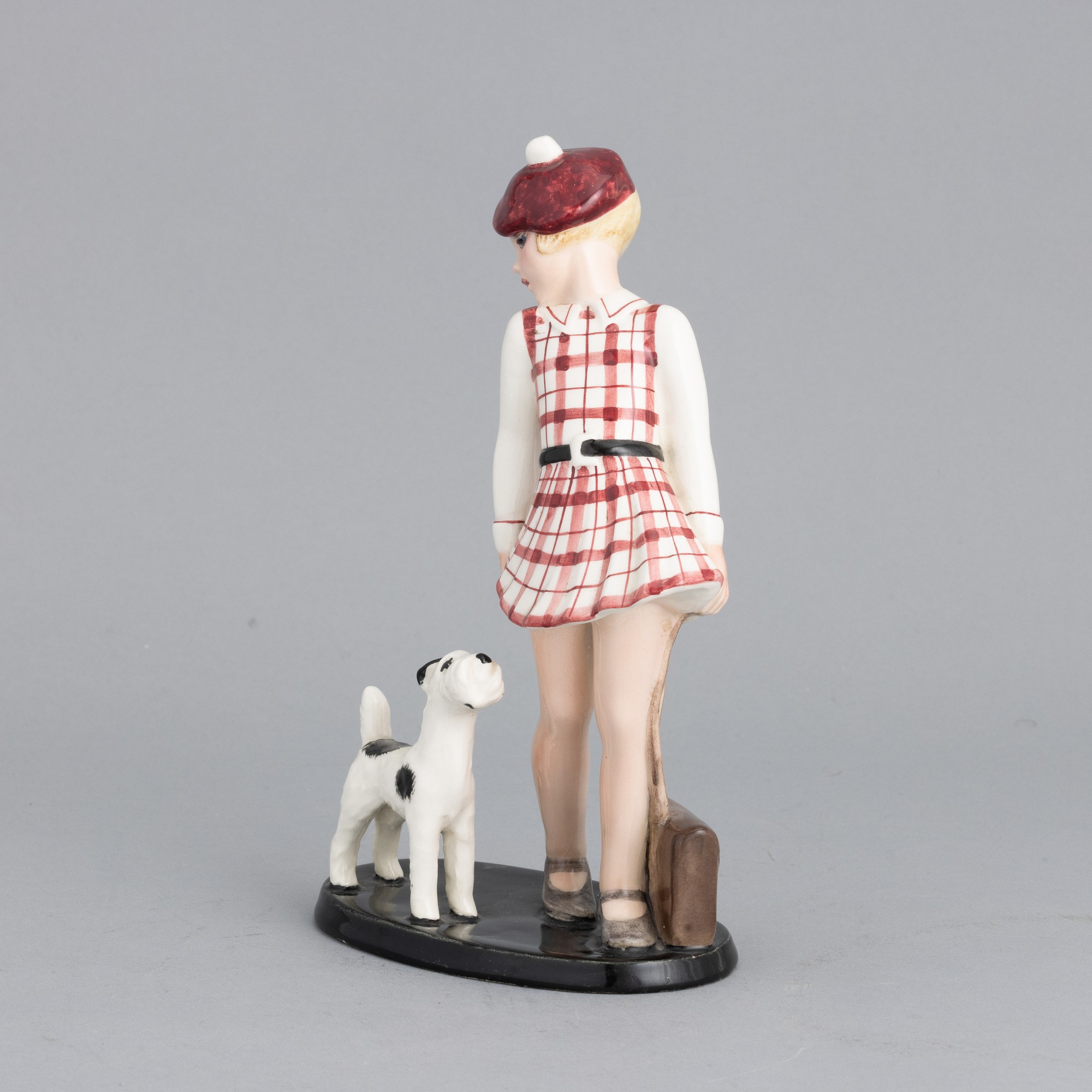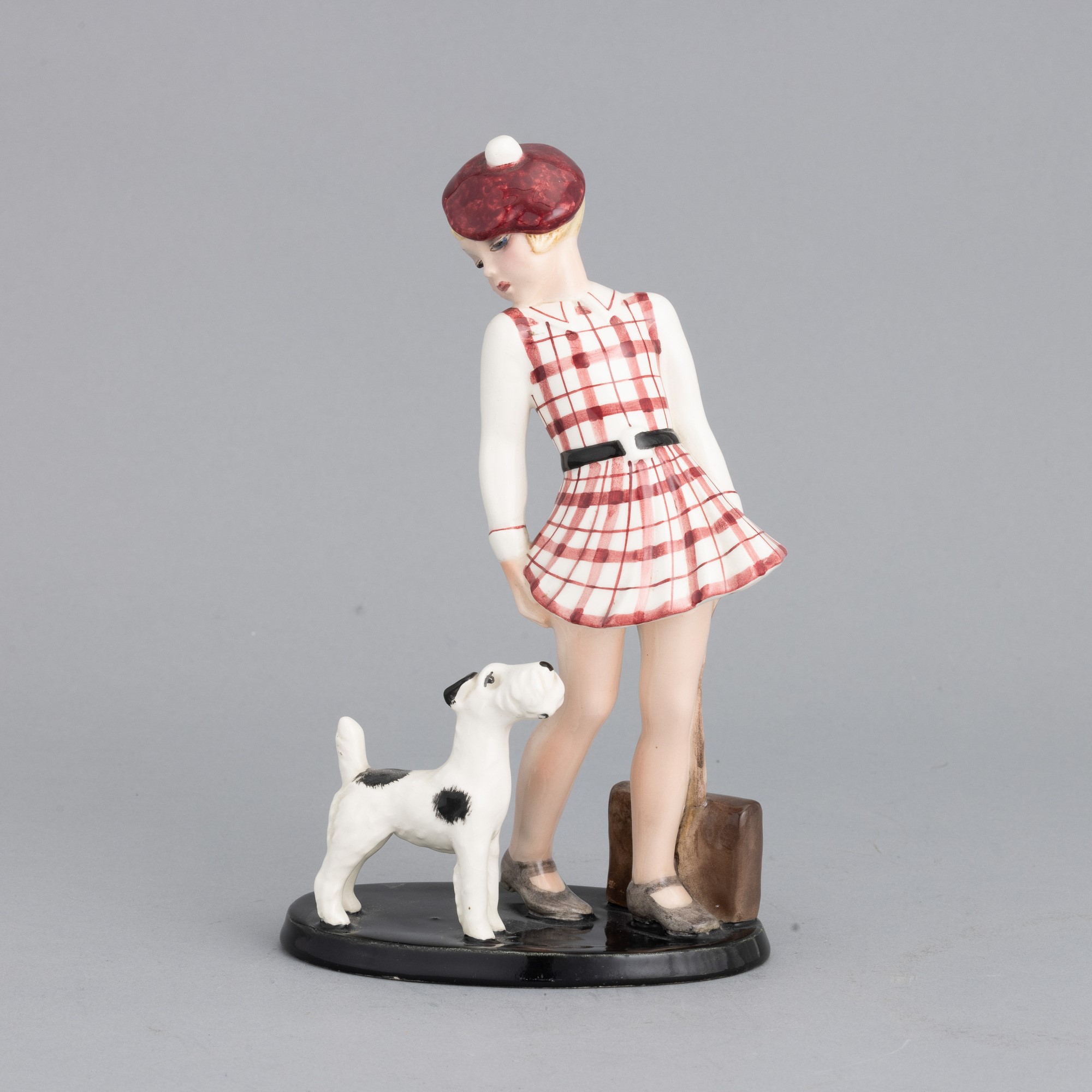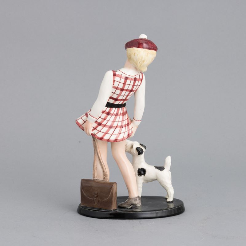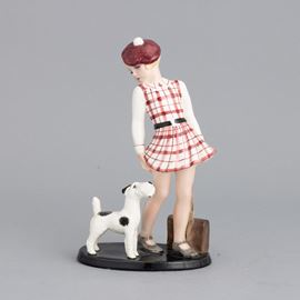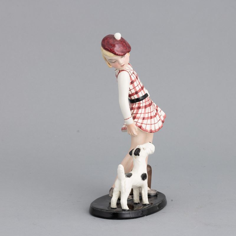 Figura di bambina con cane in terraglia a colaggio con decoro a smalti policromi.