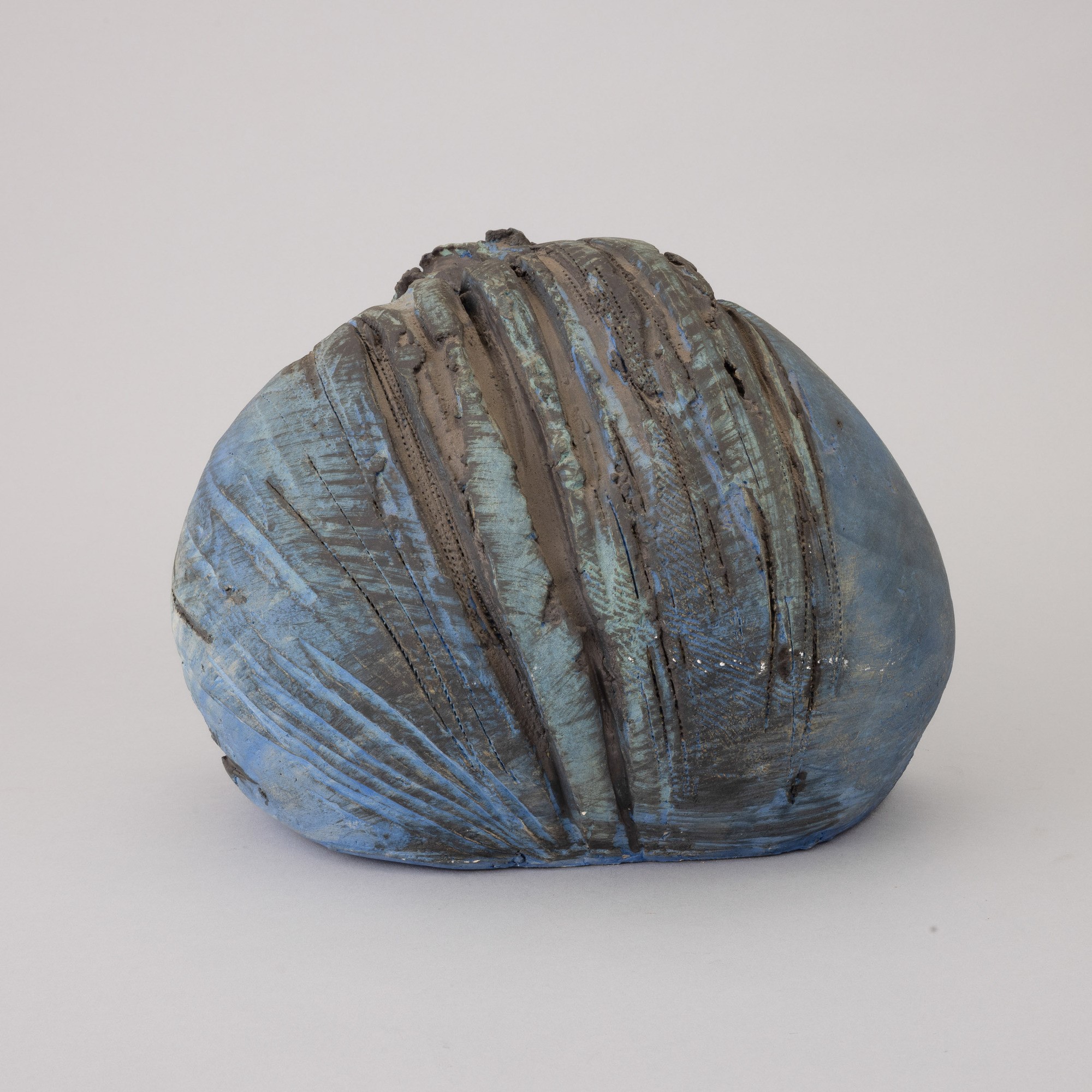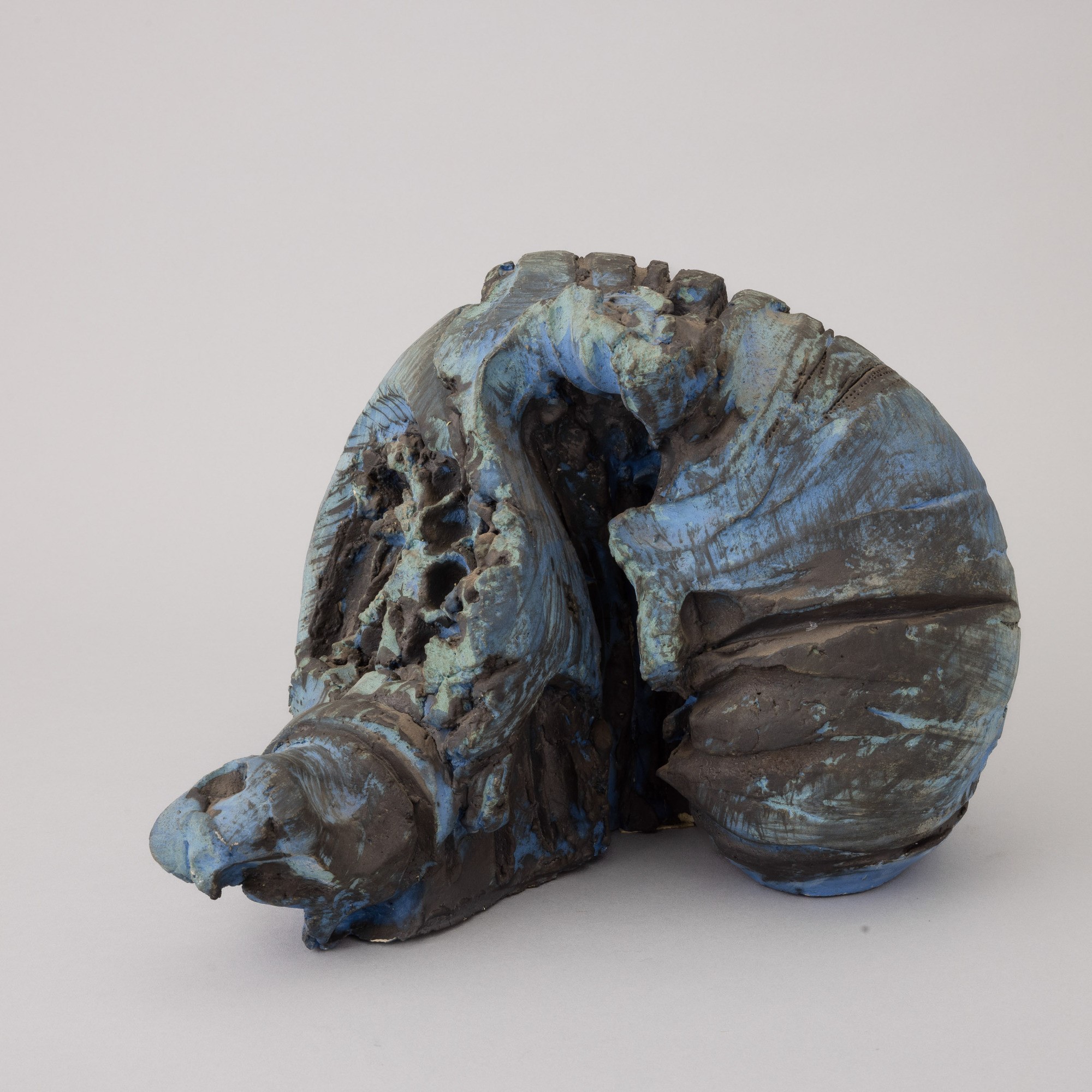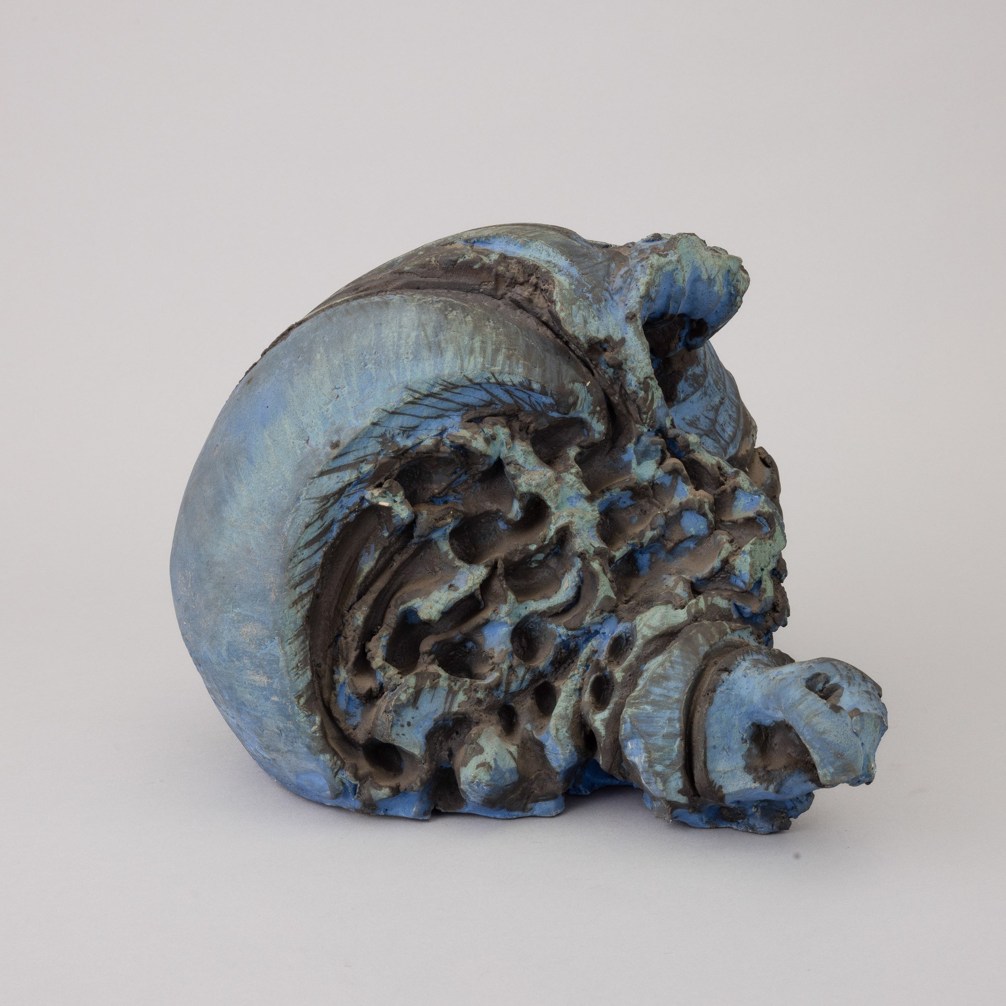 Scultura astratta in ceramica in forma di conchiglia con decoro in policromia.