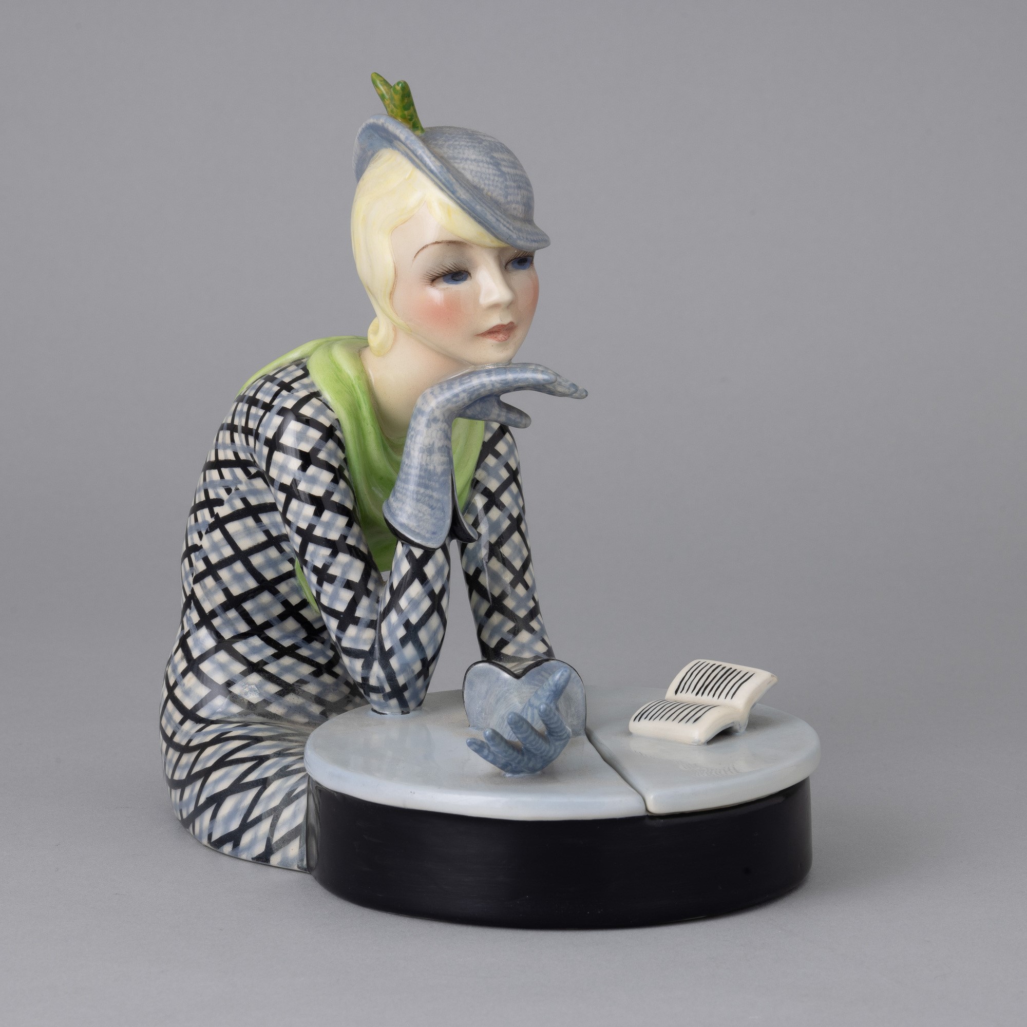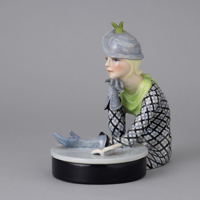 Scultura raffigurante donna che legge poggiata a un tavolino in terraglia a colaggio con decoro policromo.