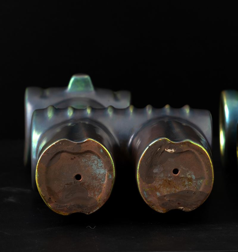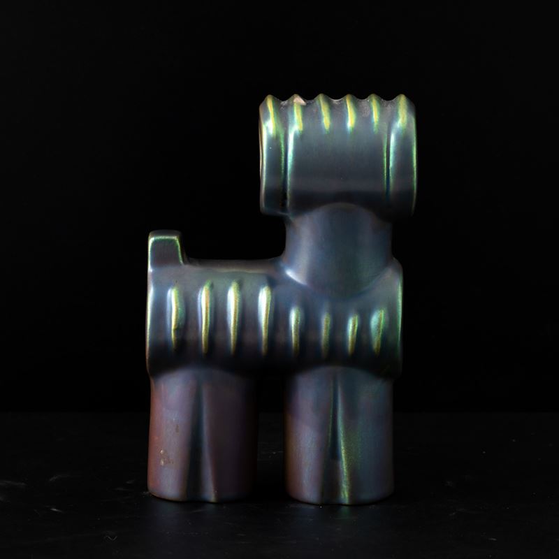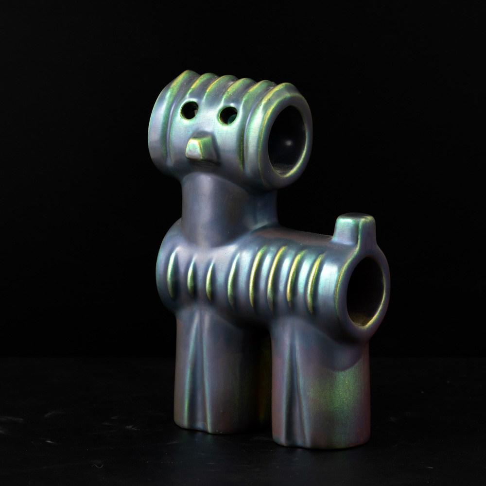Soprammobile in forma di cane stilizzato in terraglia a colaggio interamente smaltato a lustro di eosina.