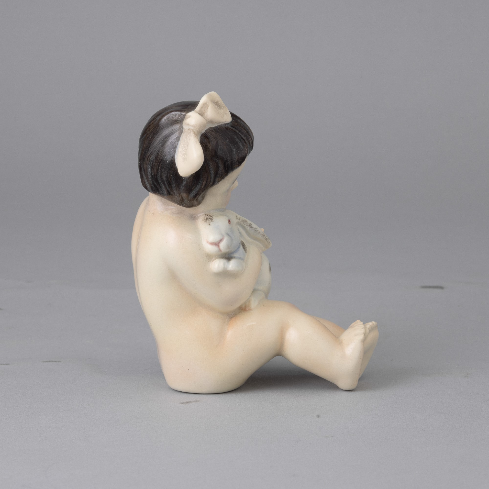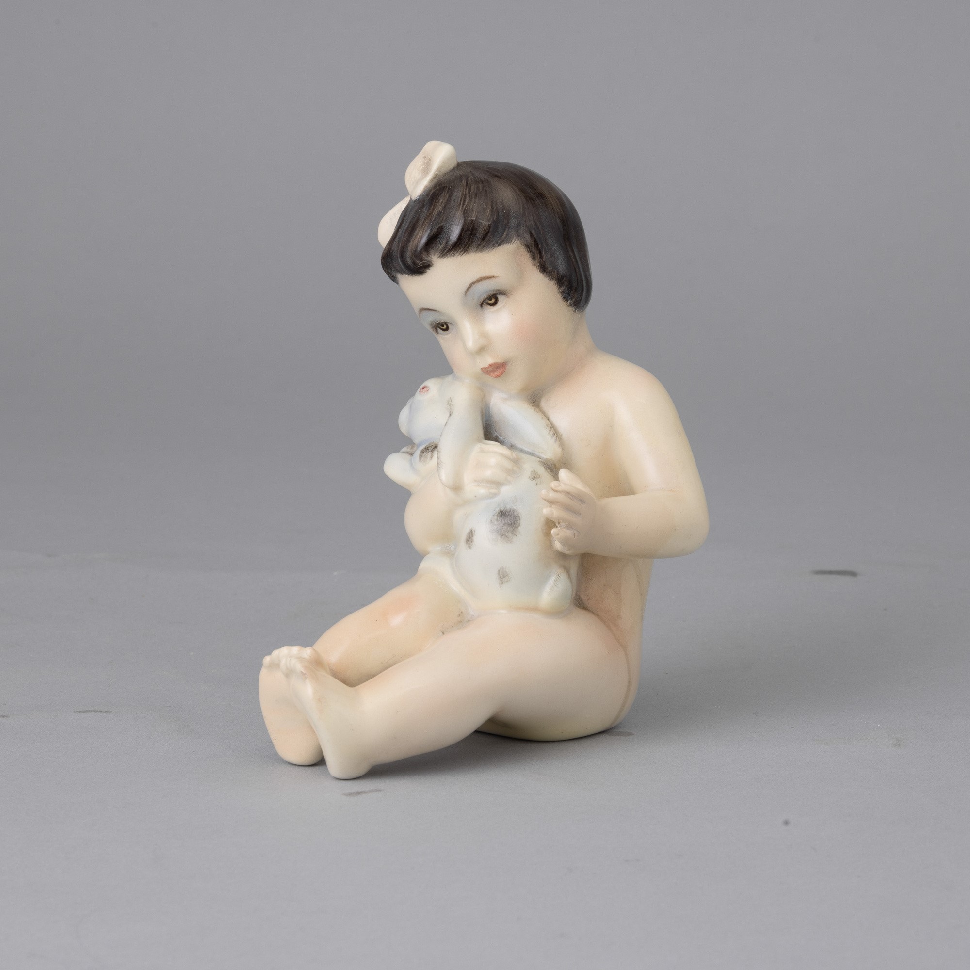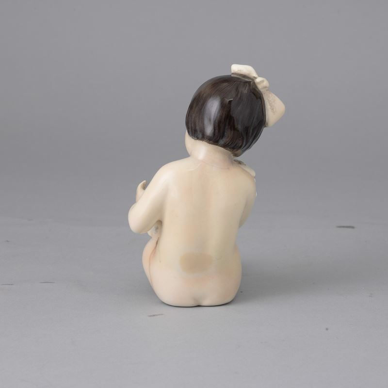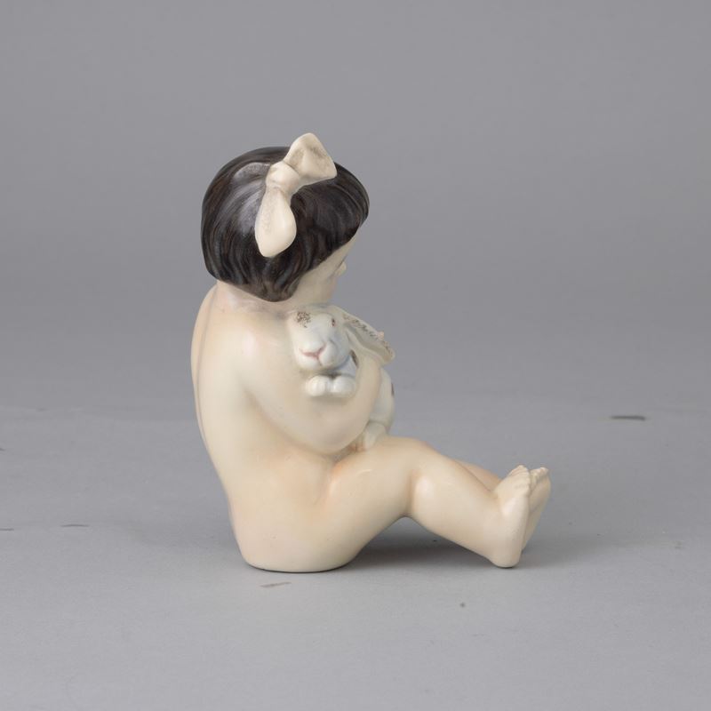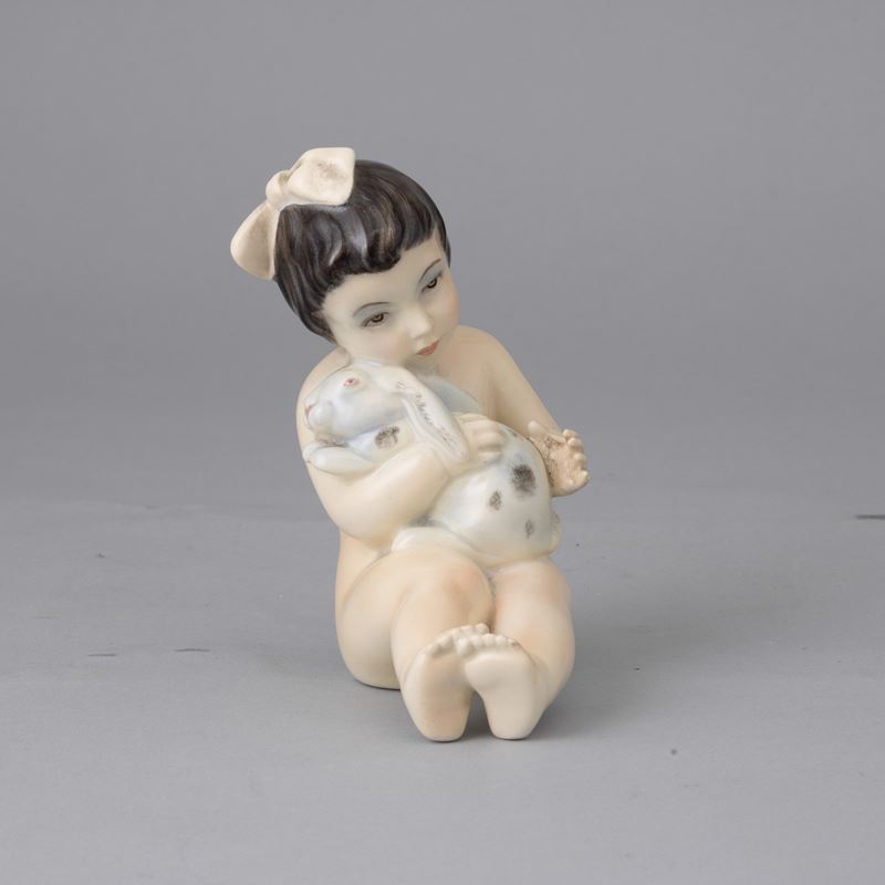 Figurina di bambina che stringe coniglietto in terraglia a colaggio con decoro policromo.