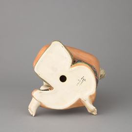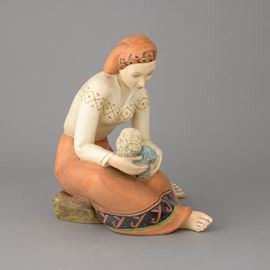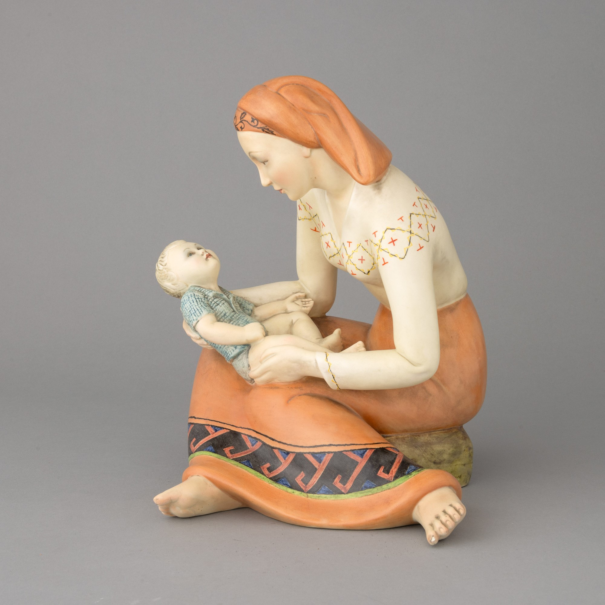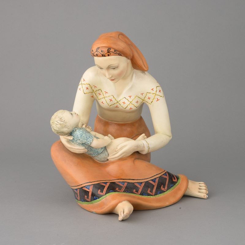 Gruppo di mamma con bebè in terraglia a colaggio con decoro policromo. Marchio della manifattura.