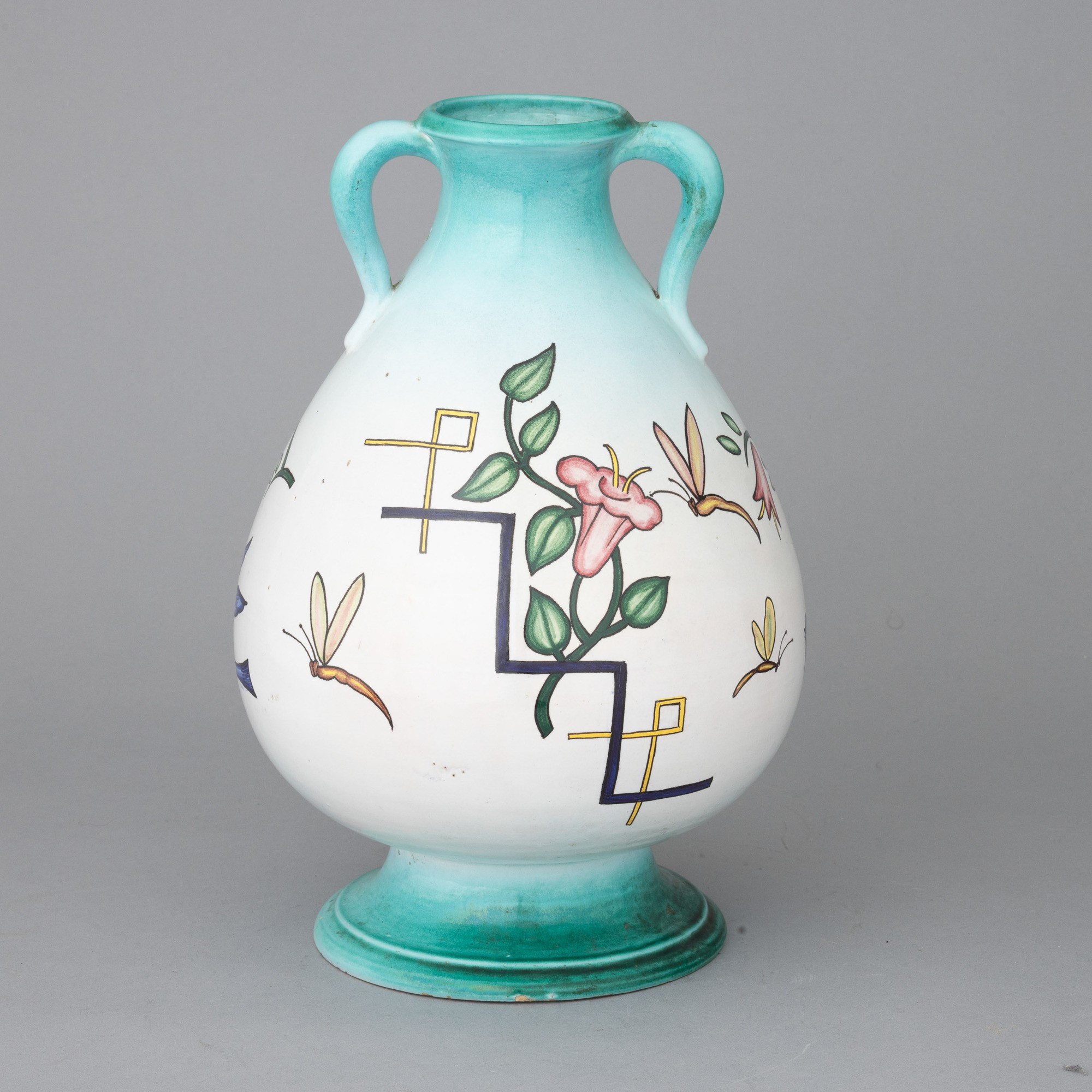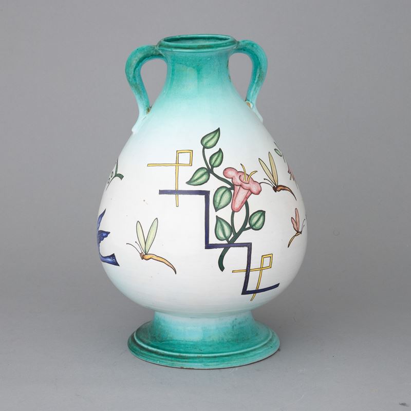 Vaso su alto piede con doppia ansa in terracotta maiolicata con decoro decò a smalti policromi su fondo sfumato.