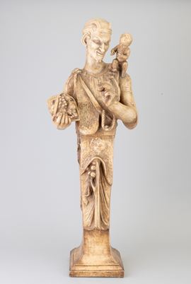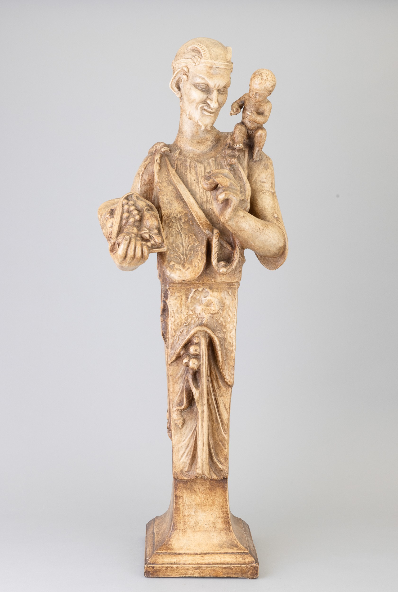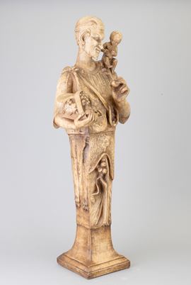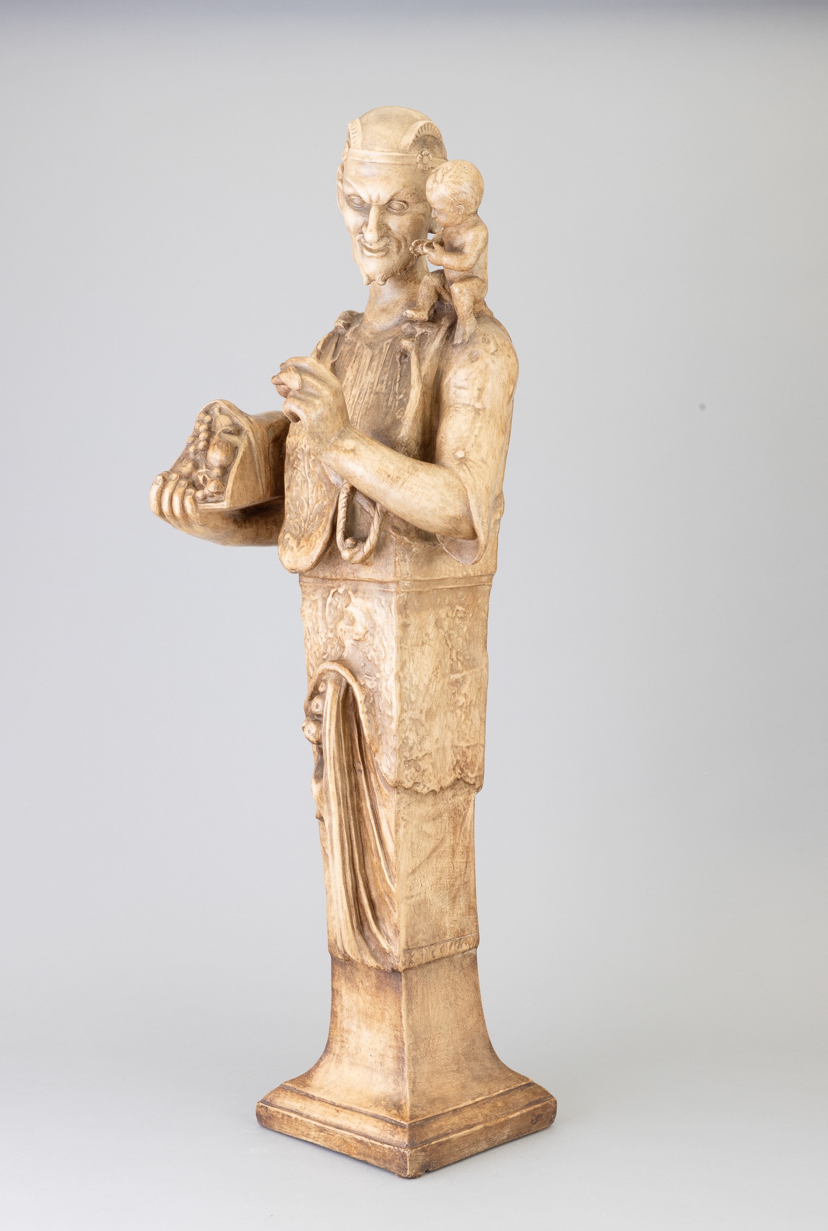 Soprammobile raffigurante erma maschile con bambino in terracotta con finitura a finto marmo.