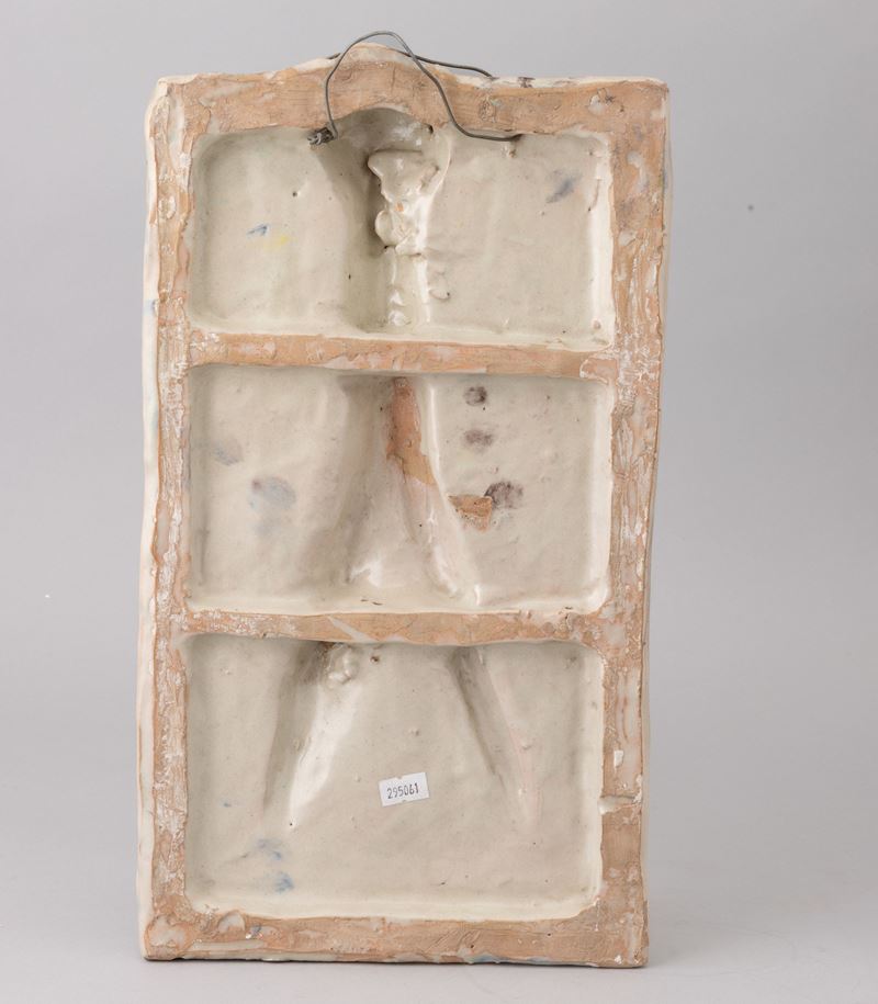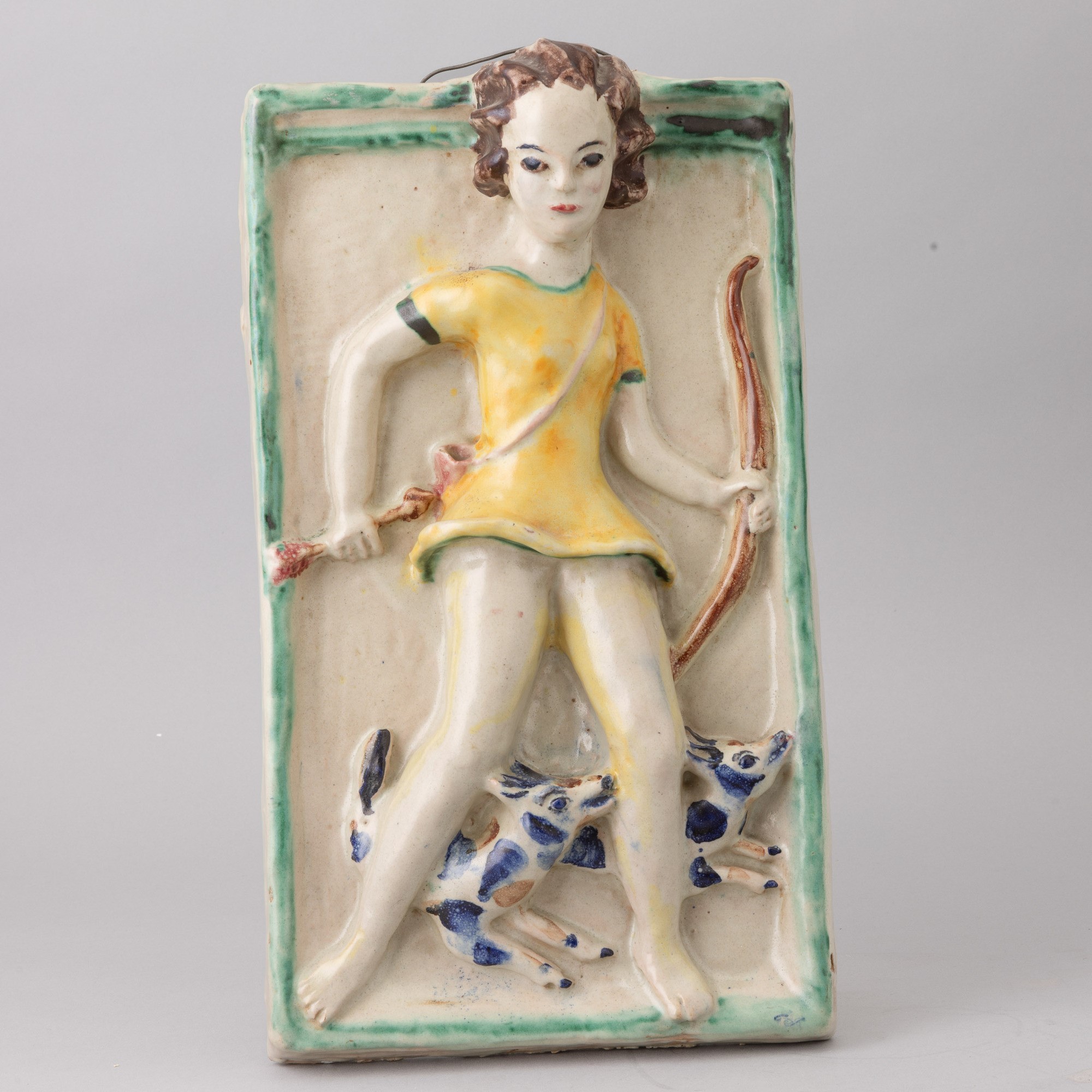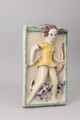 Formella in terracotta maiolicata raffigurante Diana cacciatrice con decoro di smalti policromi.
