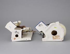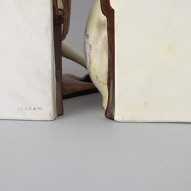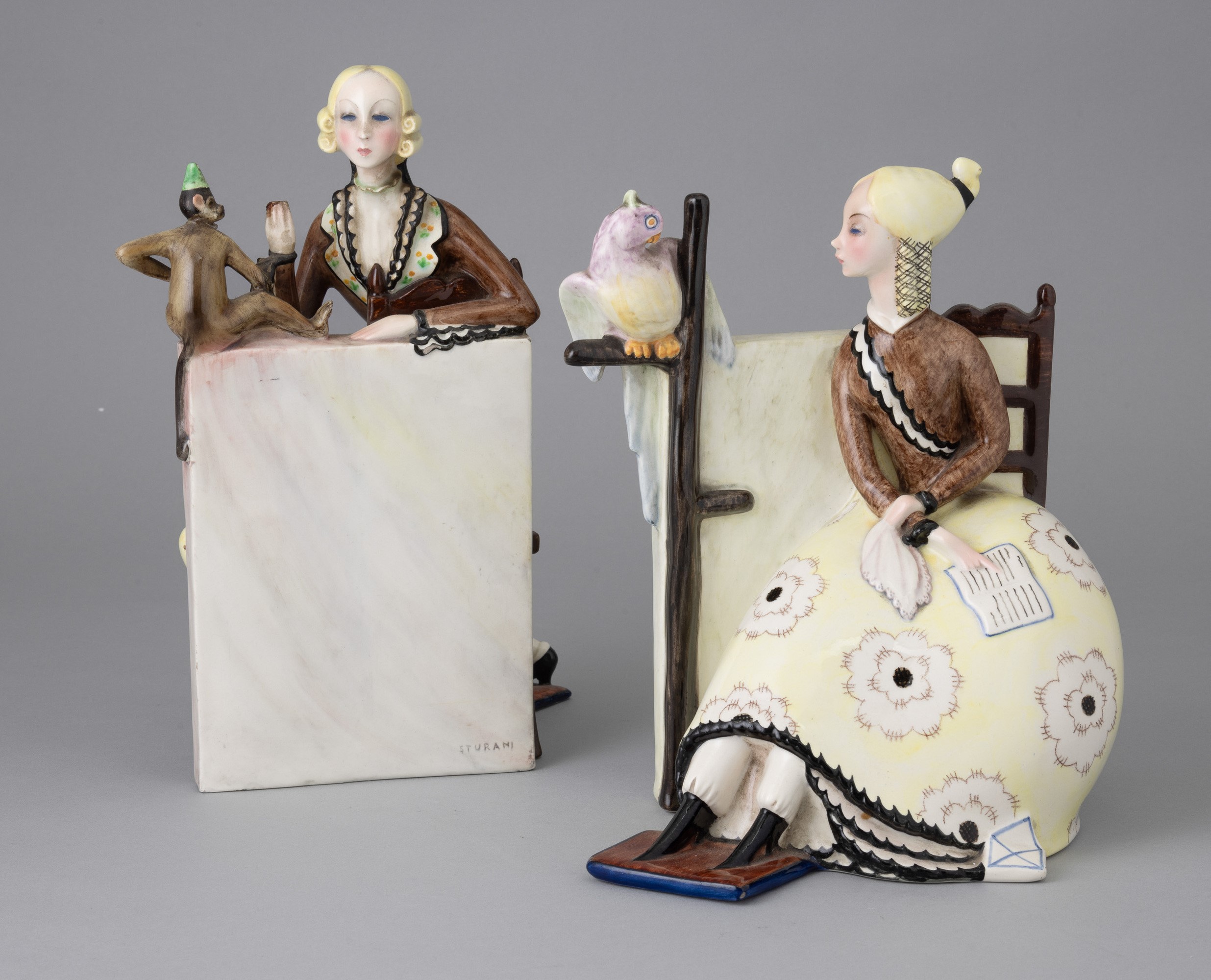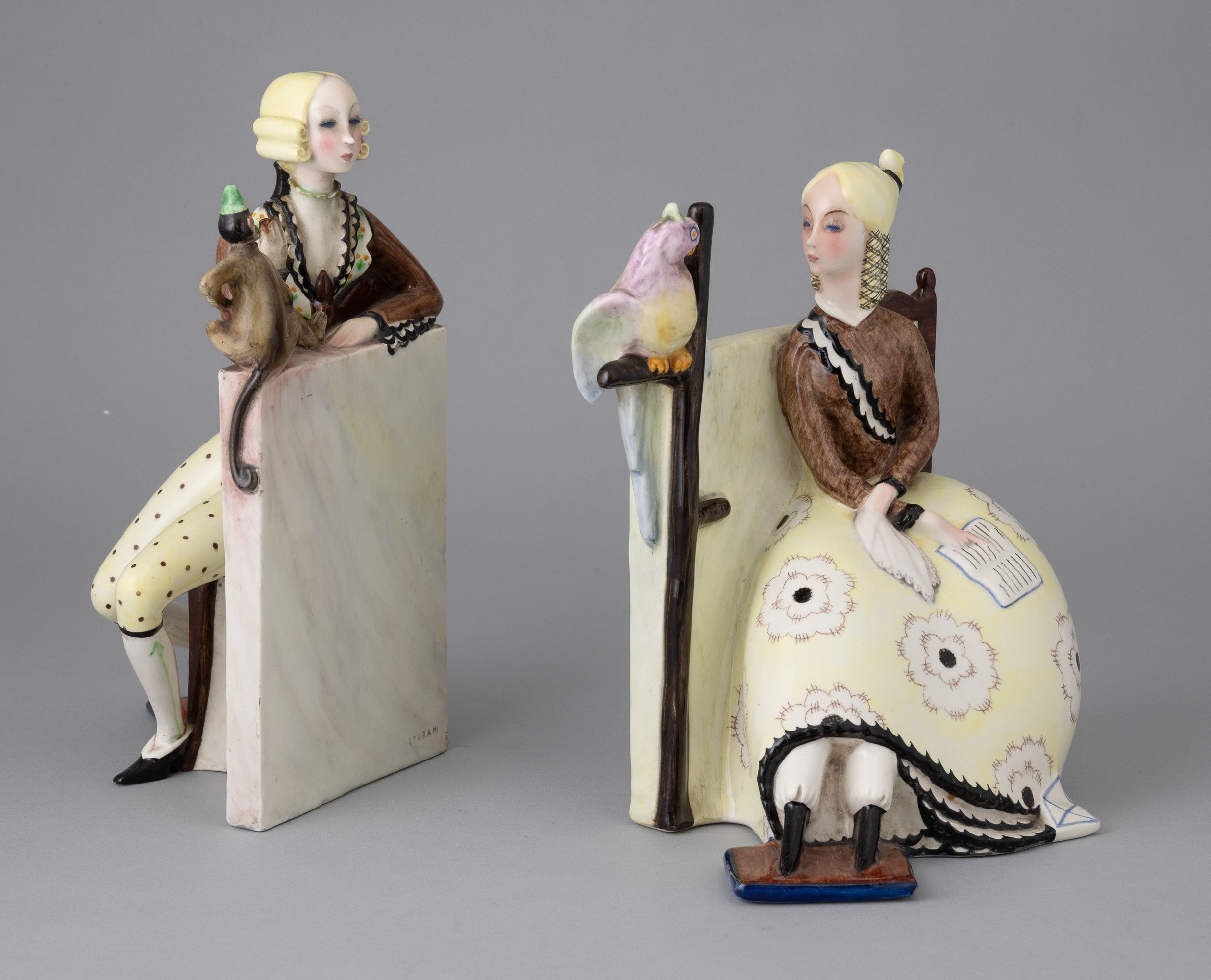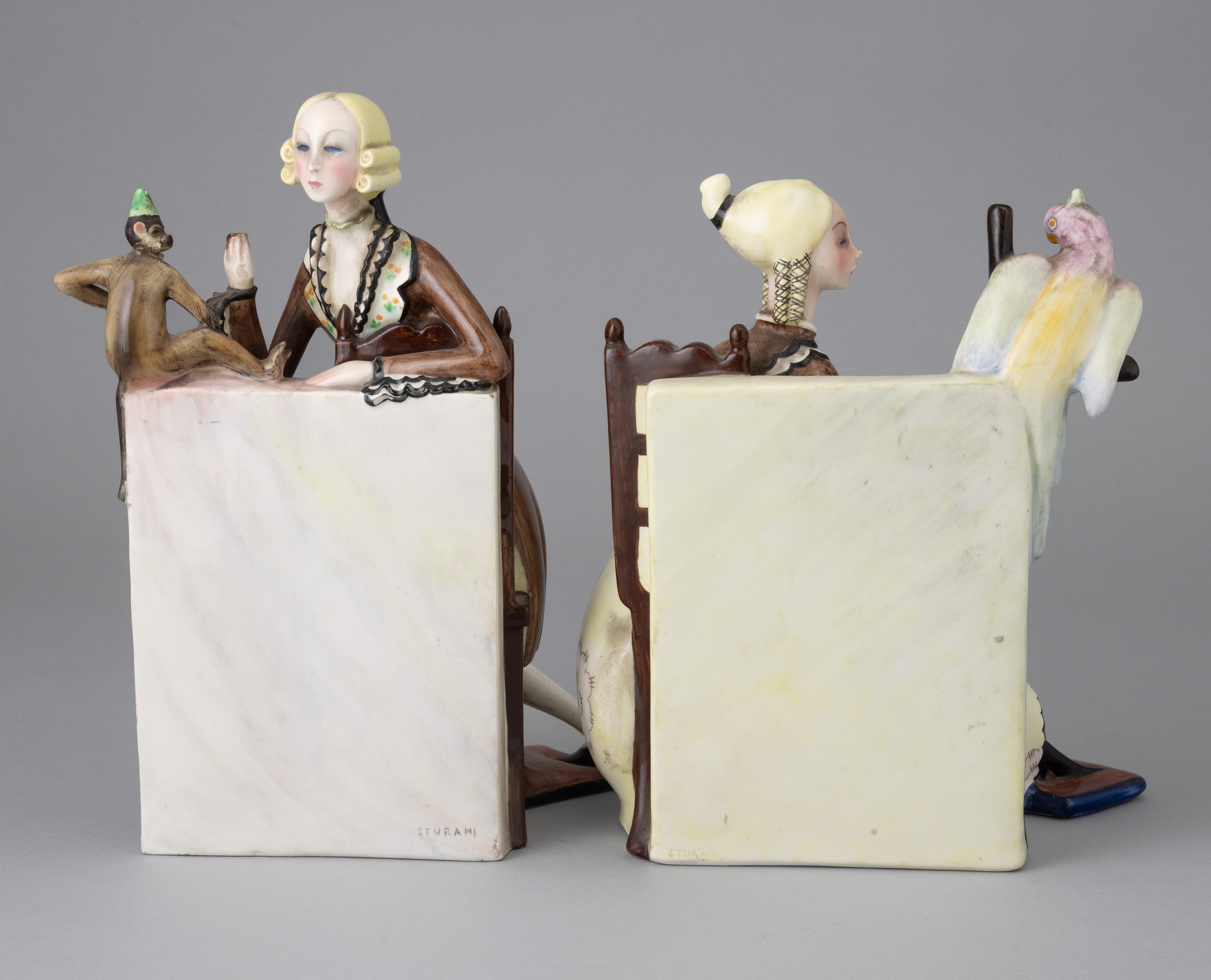 Coppia di rari fermalibri in terraglia a colaggio policroma raffiguranti personaggi in costume settecentesco con scimmietta e pappagallo.