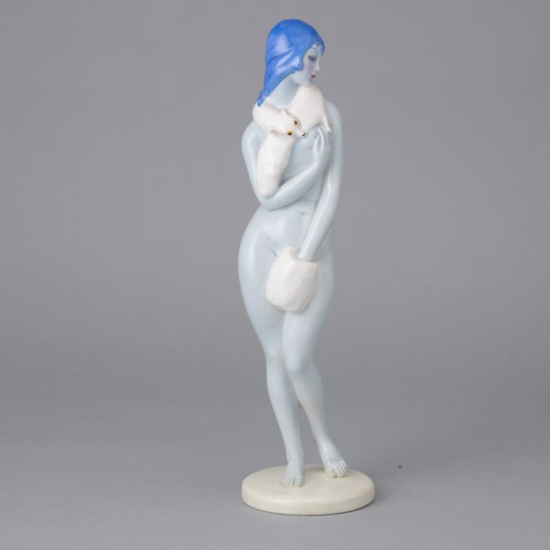 Figura femminile con manicotto e sciarpa in pelliccia in terraglia a colaggio con decoro policromo.