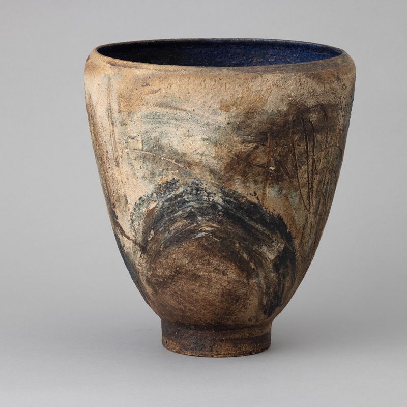 Vaso a campana rovesciata su piede cilindrico in grès con superficie graffiata e smalti opachi policromi.