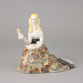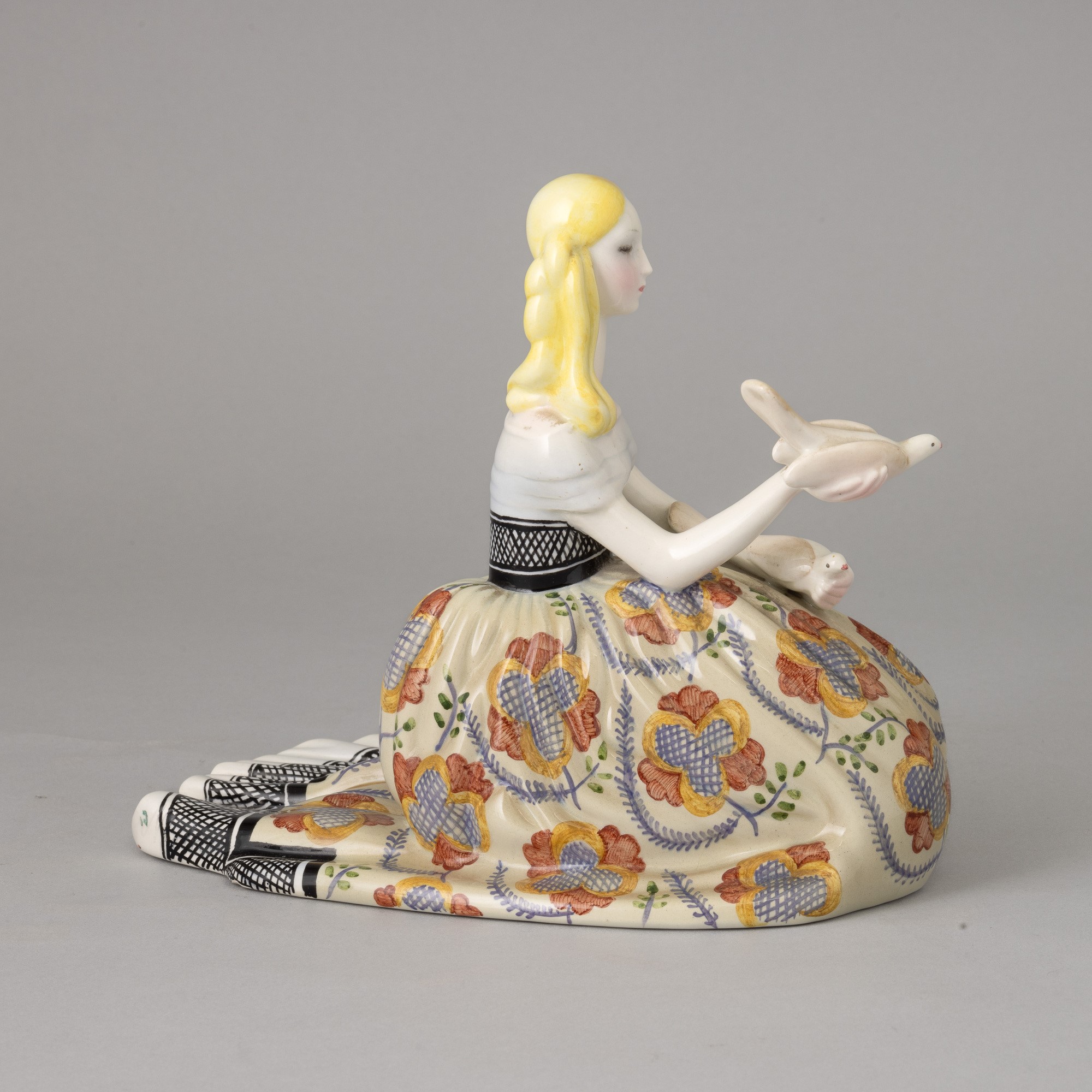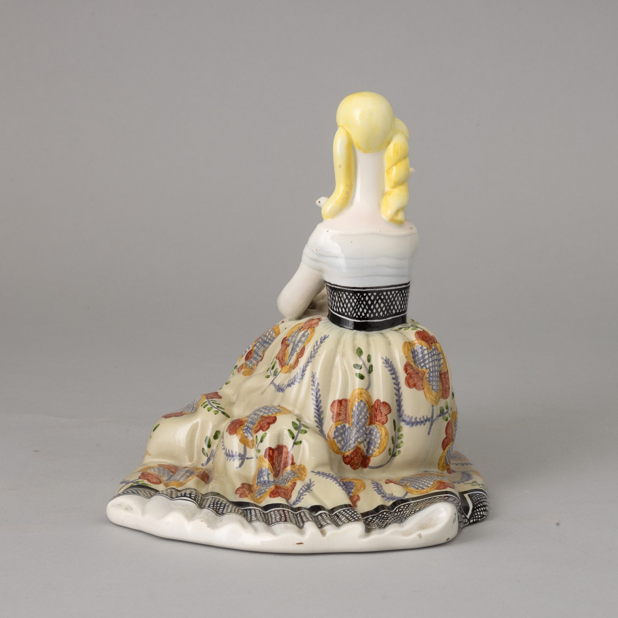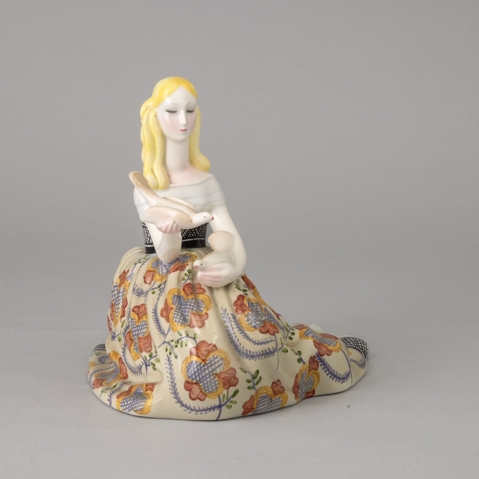 Figura di dama in ampio abito ottocentesco con colombe in terraglia a colaggio con decoro policromo.