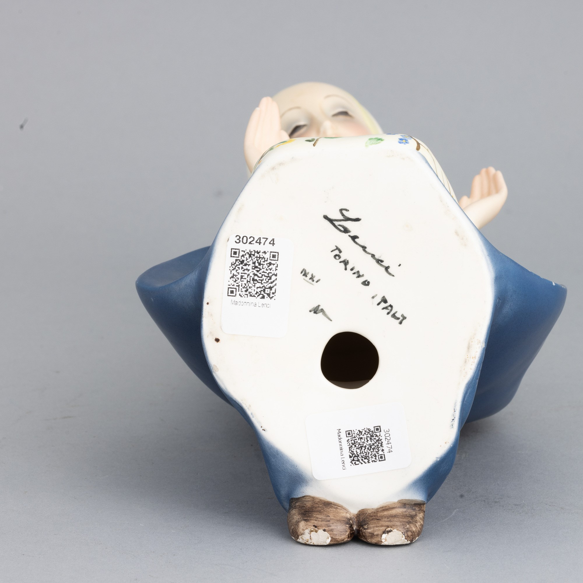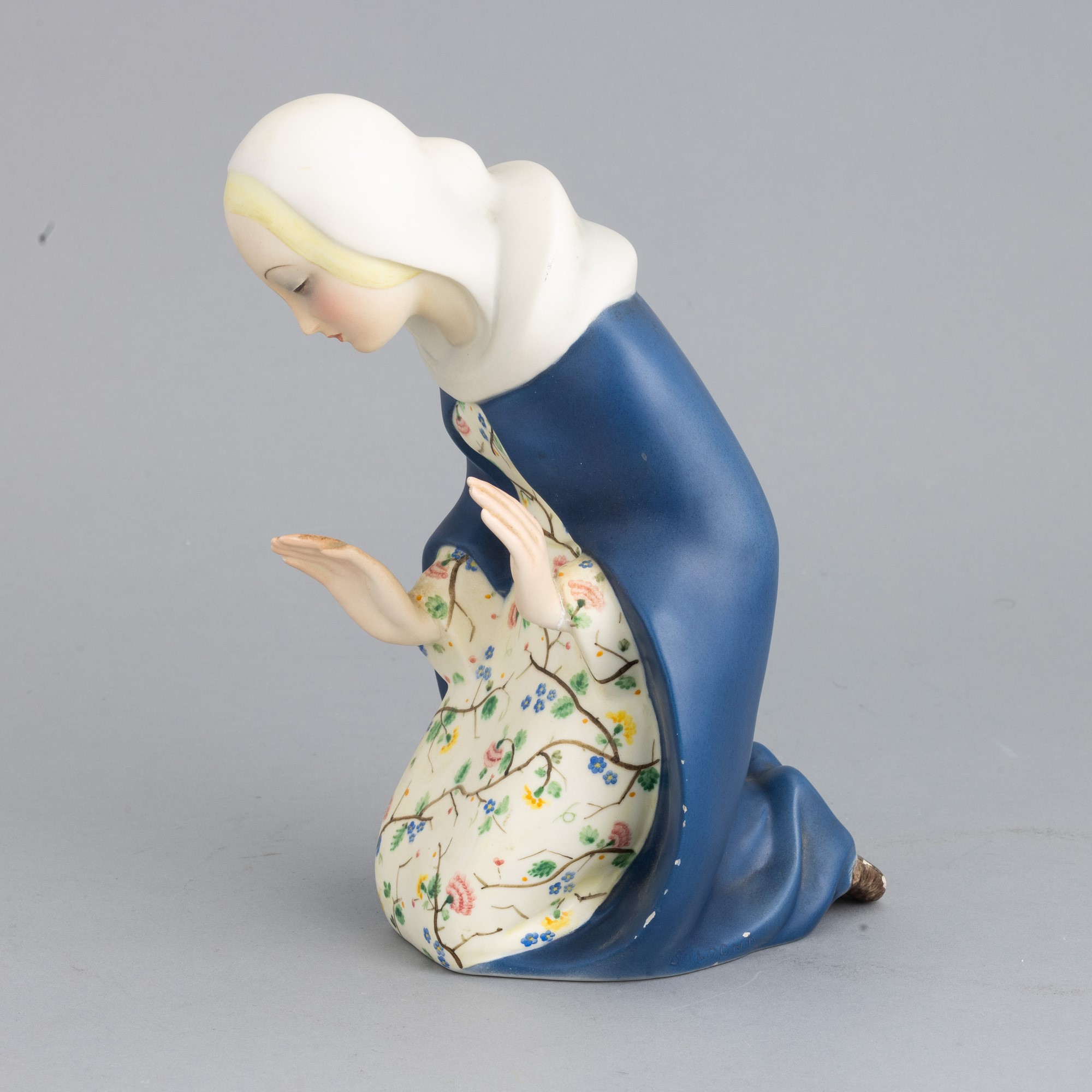 Figura di Madonna in terraglia a colaggio con decoro policromo.