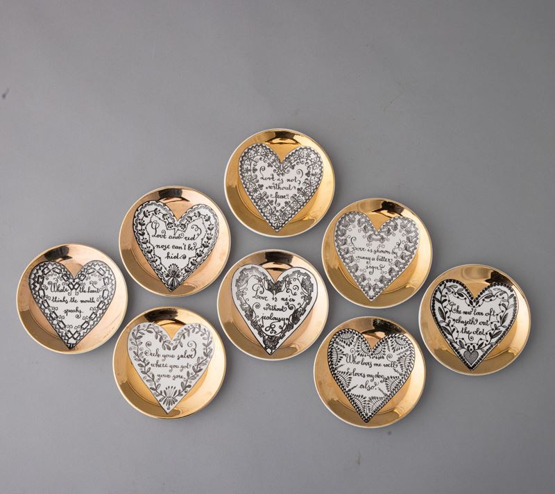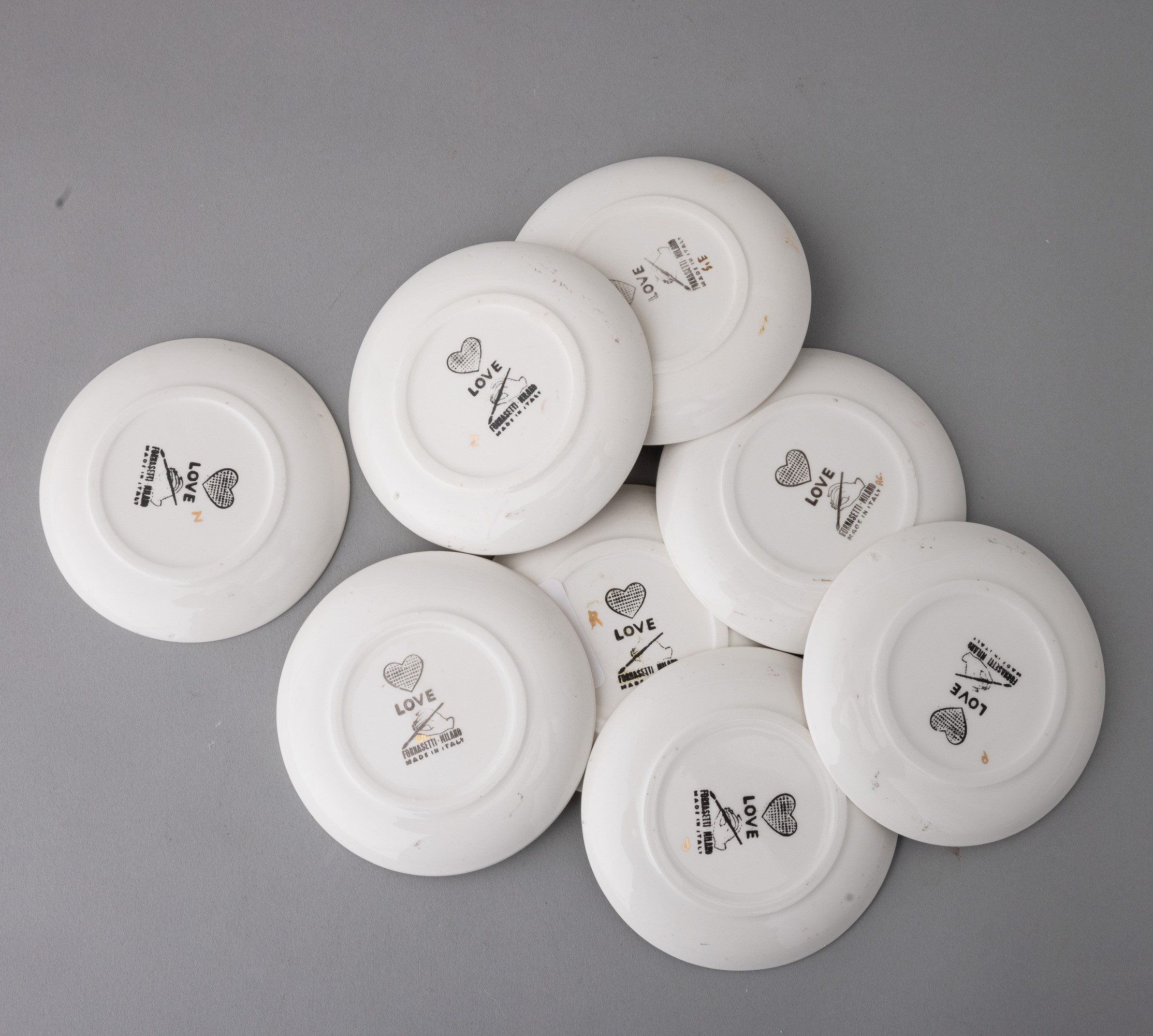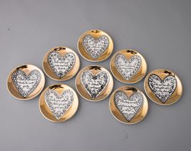 Otto piattini portapane serie Love in terraglia con decoro serigrafato di cuori con messaggi amorosi su fondo oro. Marchio della manifattura.
