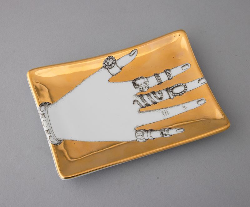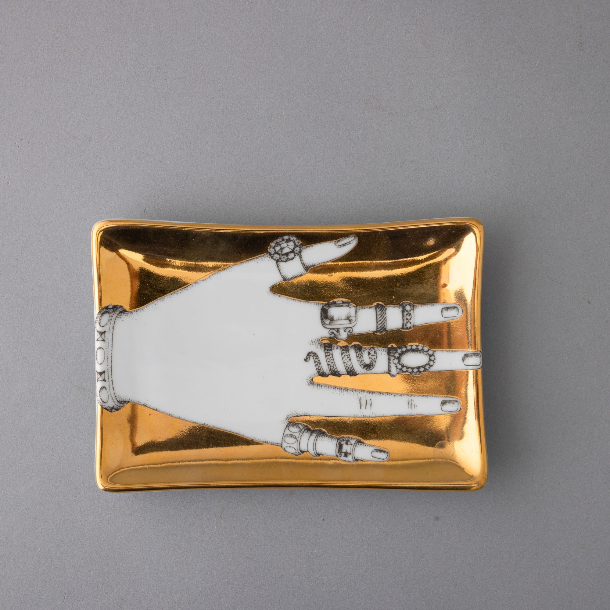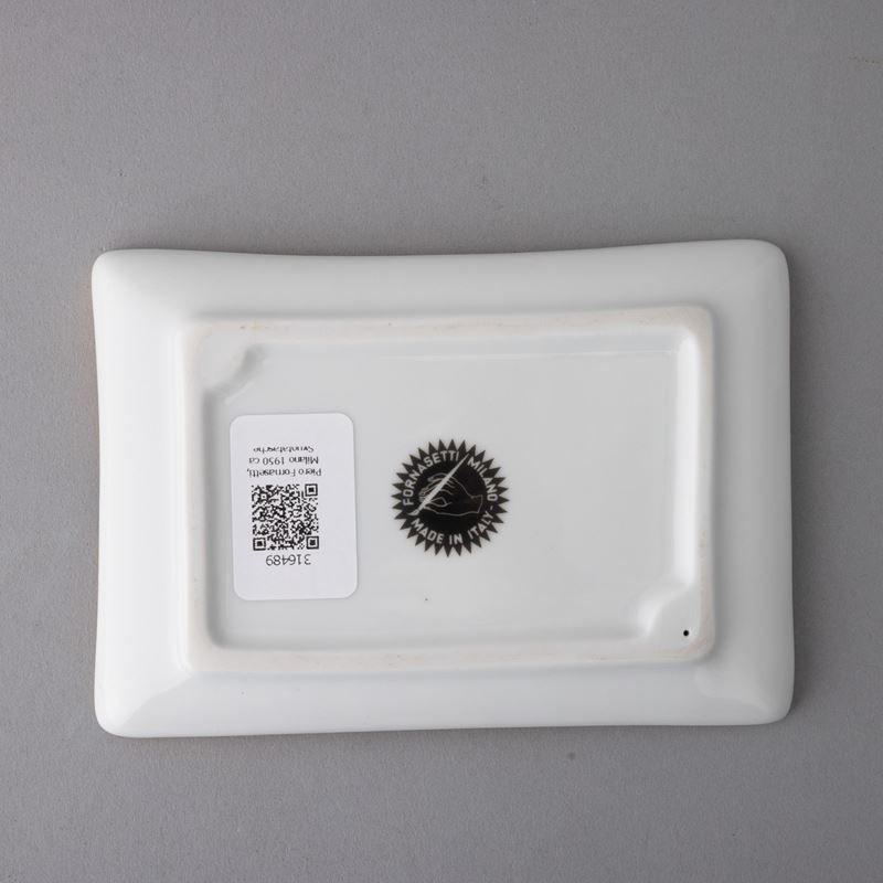 Svuotatasche rettangolare in porcellana con decoro serigrafato di mano ingioiellata.