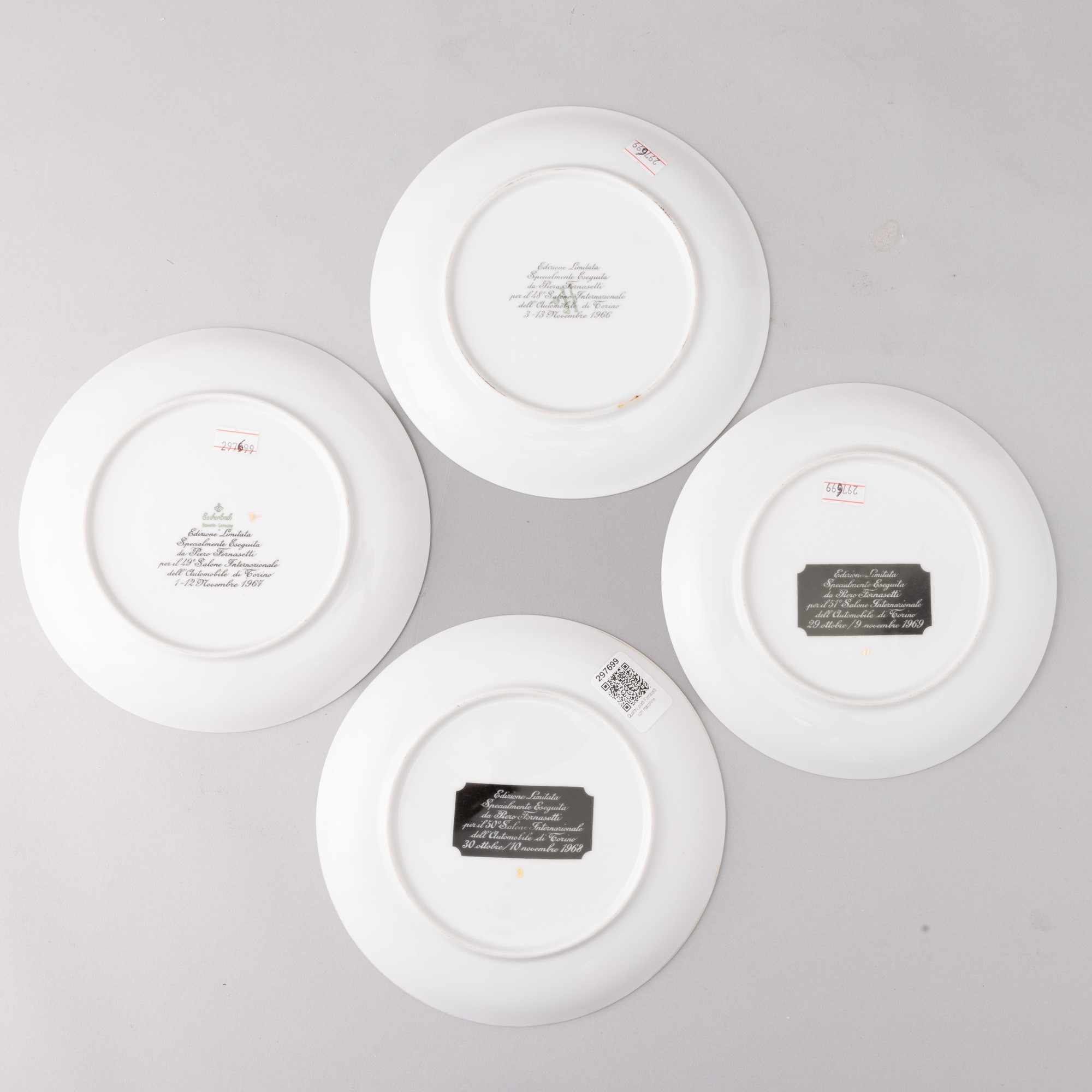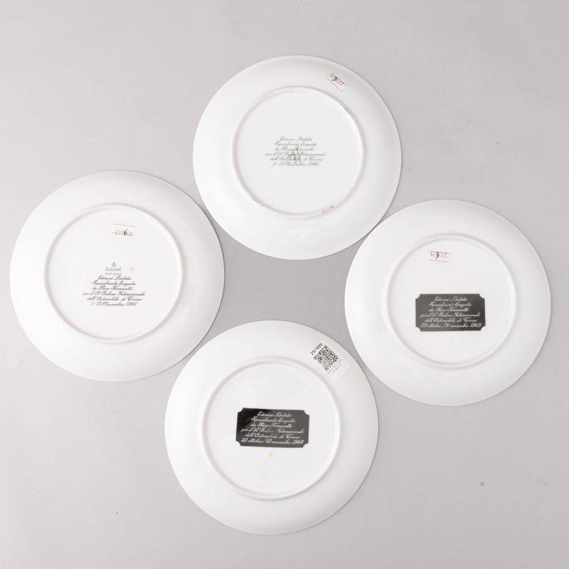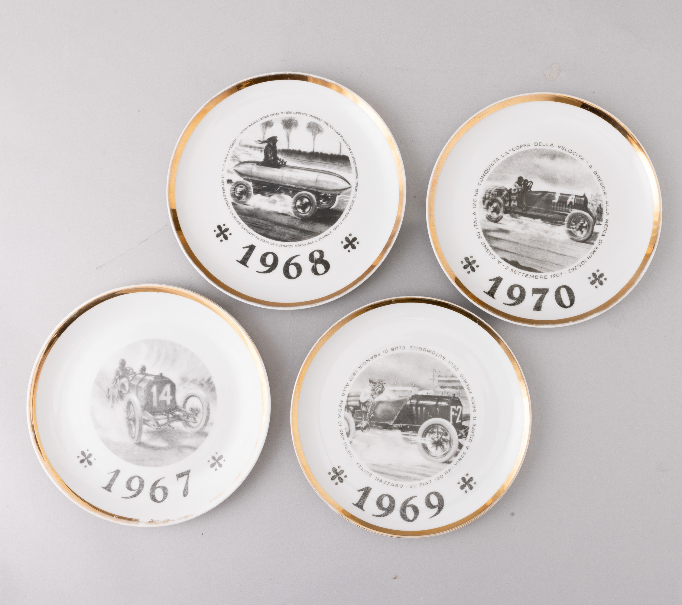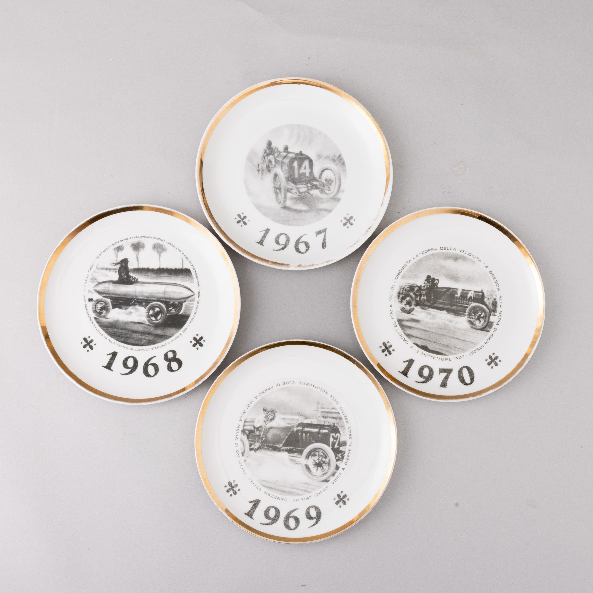 Quattro piatti in porcellana con decoro serigrafato e bordo oro. Edizione limitata specialmente eseguita per il Salone Internazionale dell’Automobile di Torino.