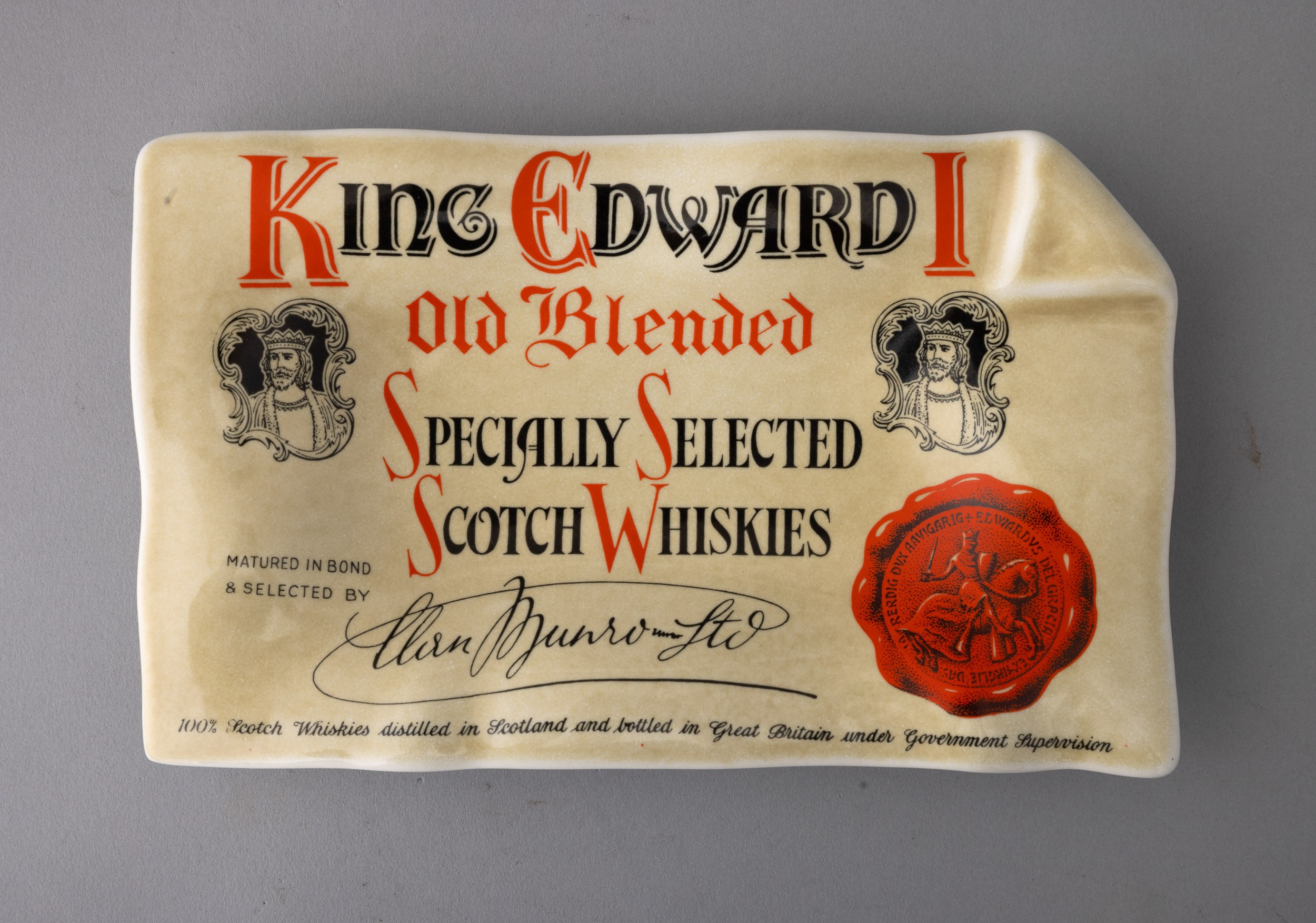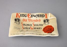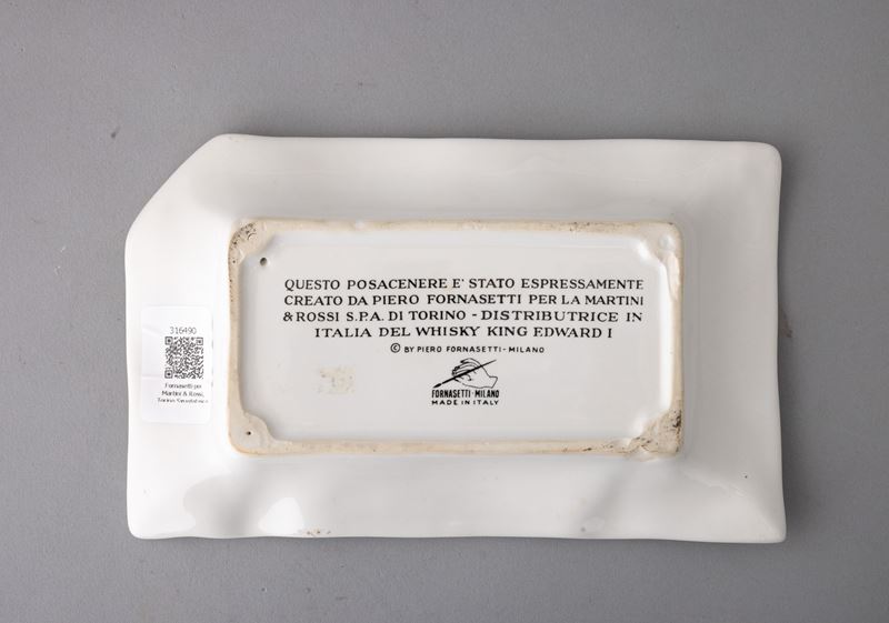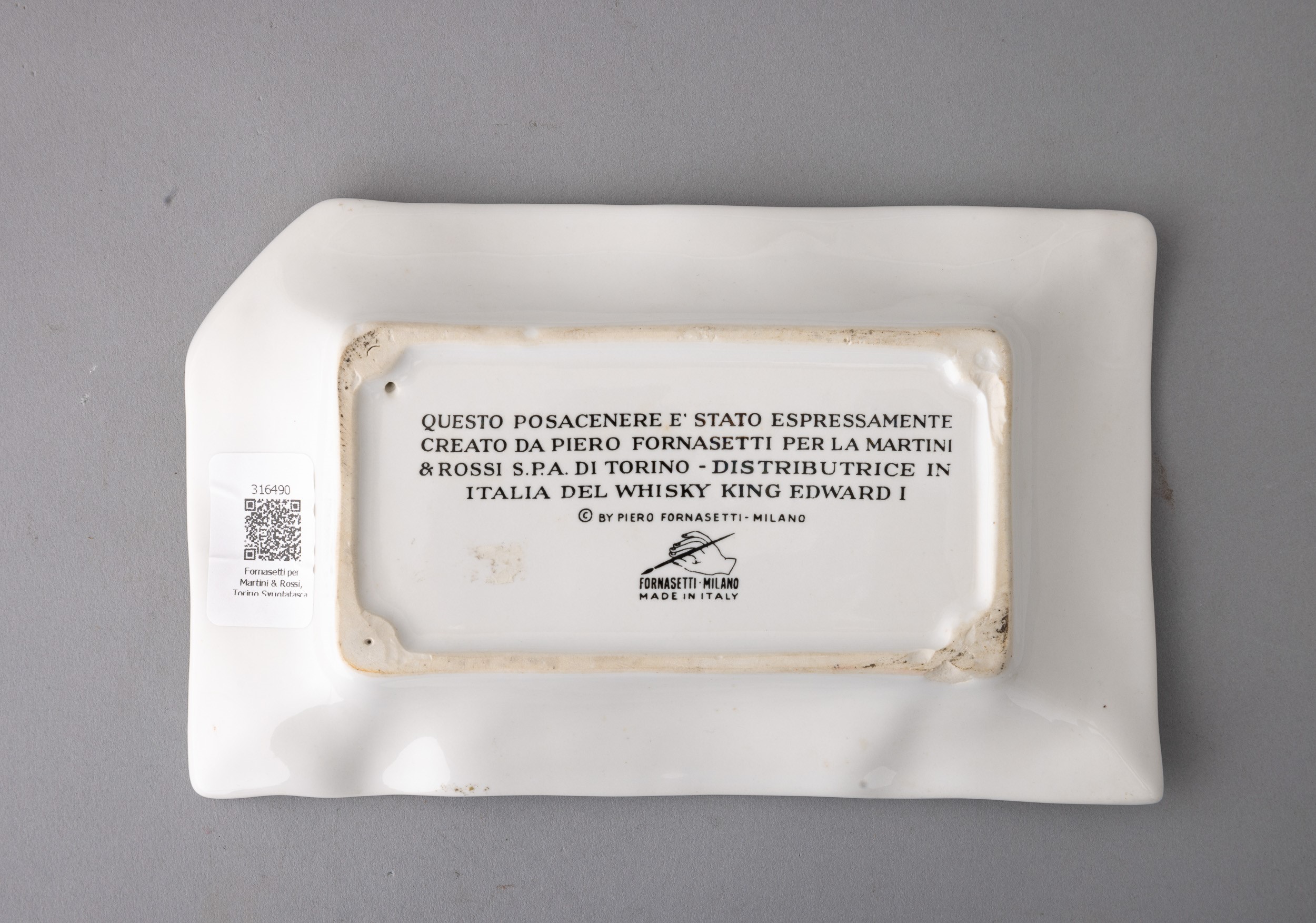 Svuotatasca in forma di fazzoletto in porcellana con decoro serigrafato policromo. Eseguito per la Martini & Rossi, Torino.
