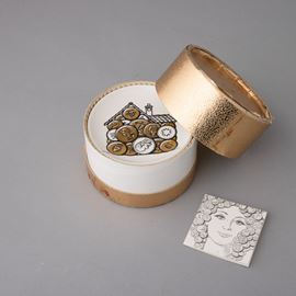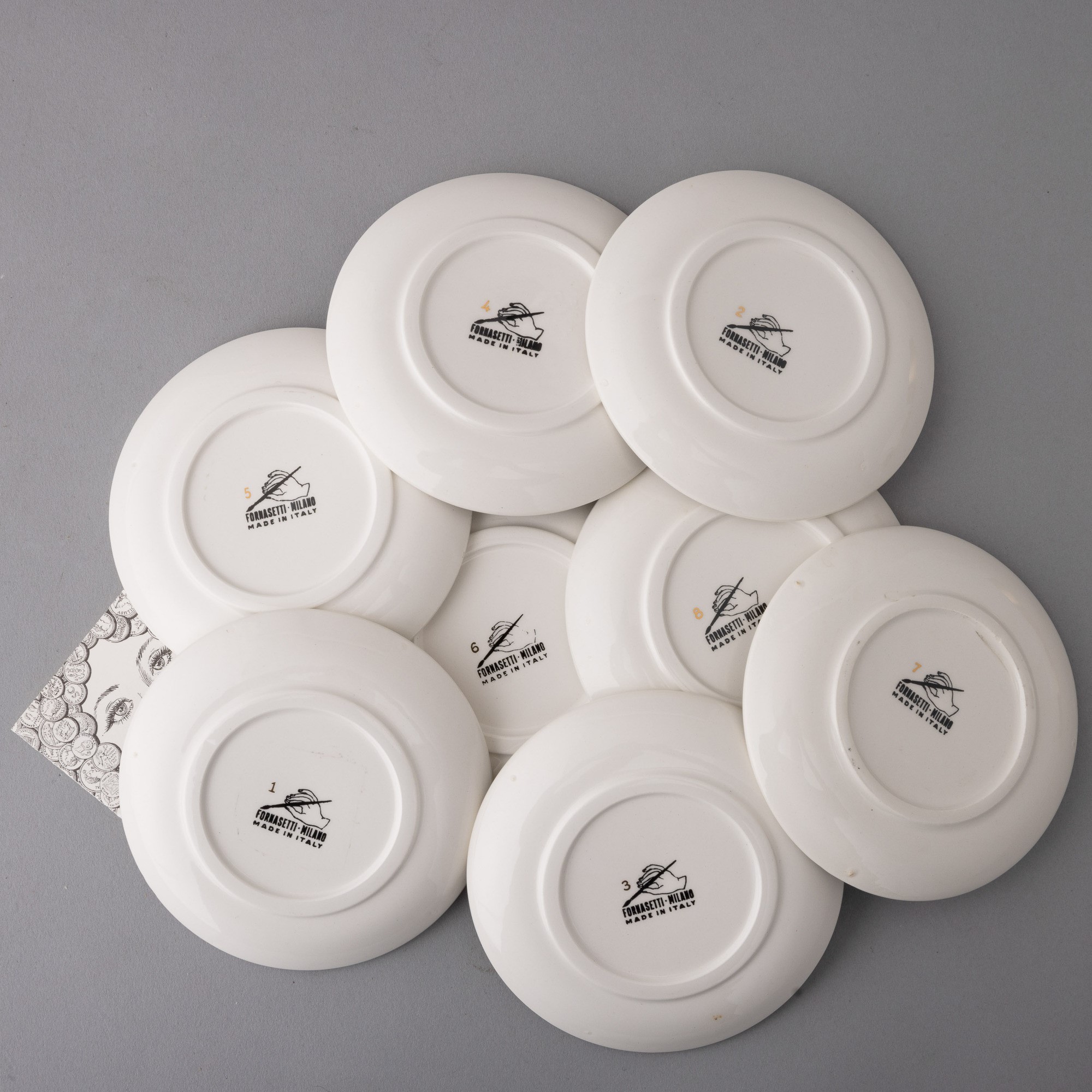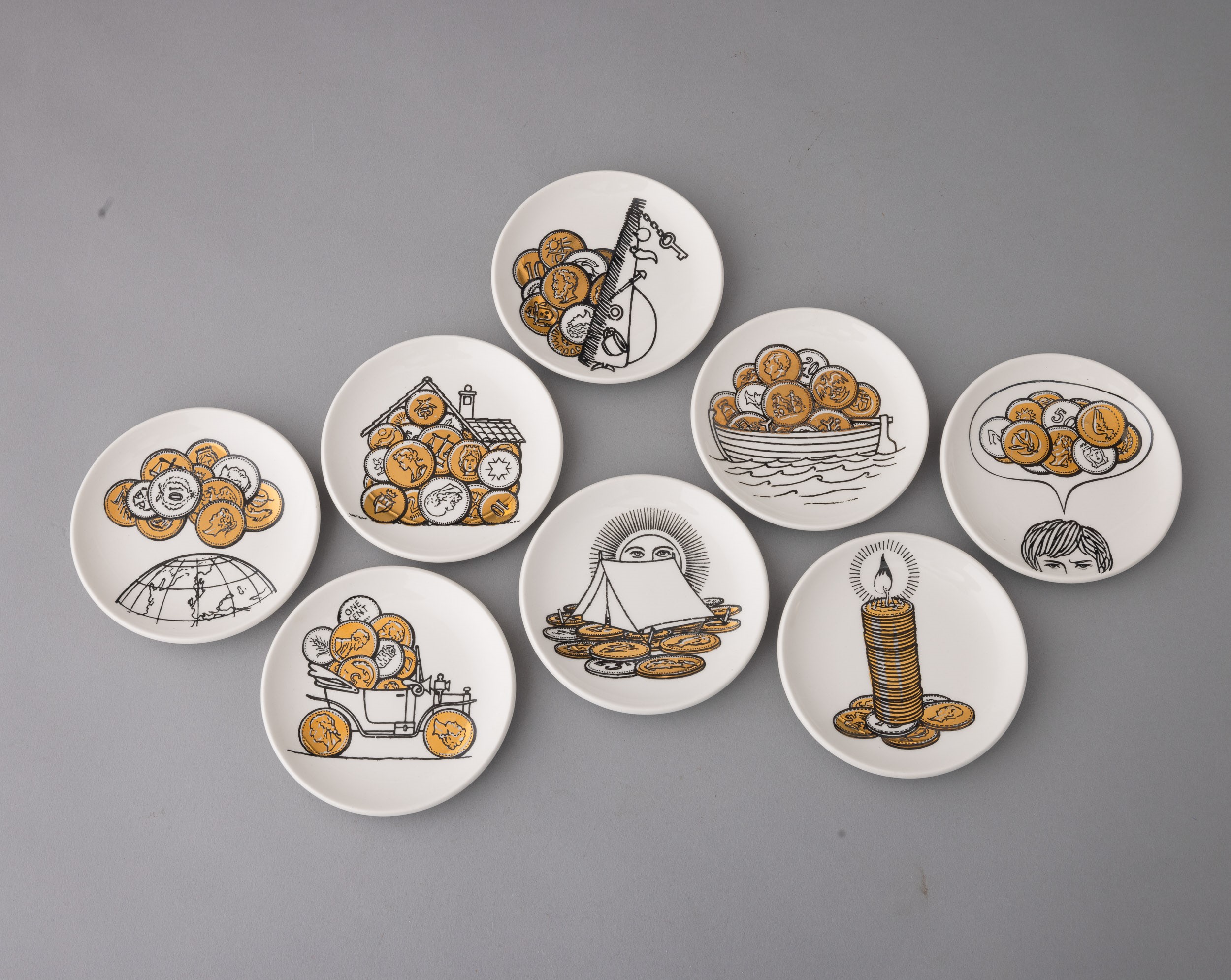 Set di otto sottobicchieri in terraglia con decoro serigrafato e in oro con temi monetari. Serie realizzata per la Banca Unione. Marchio della manifattura.