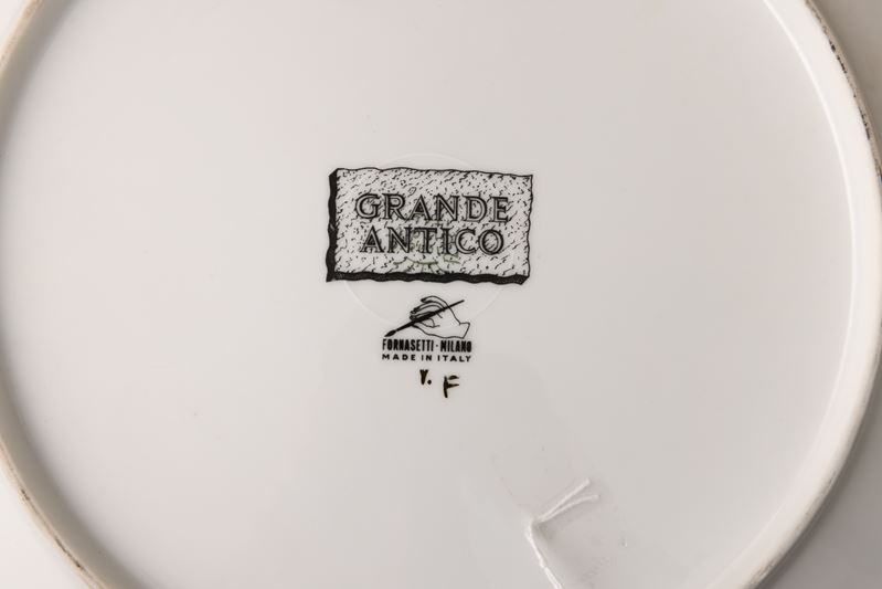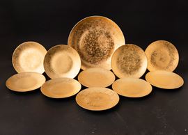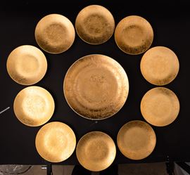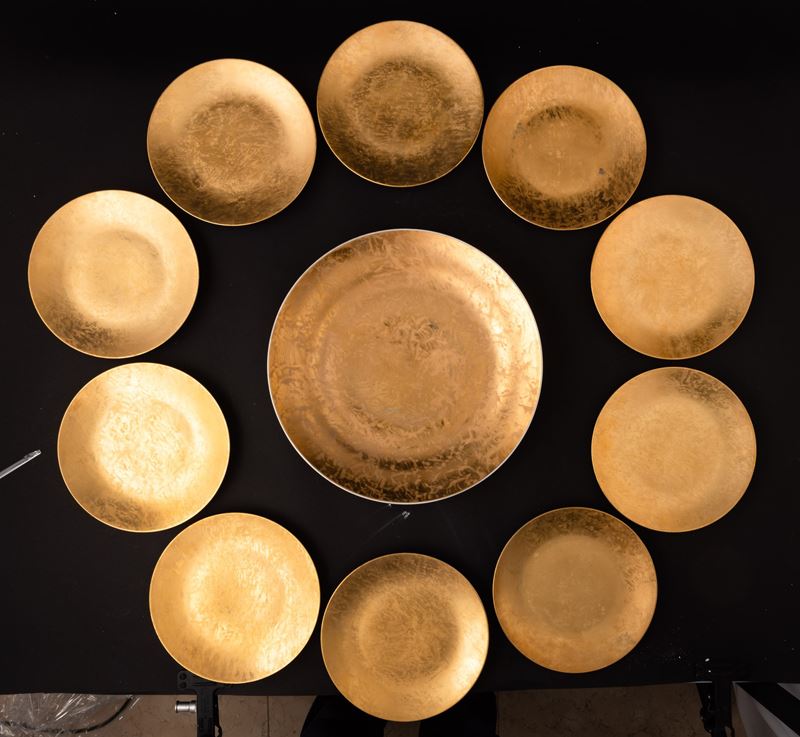 Lotto di dieci piattini e uno più grande serie Grande Antico con decoro in oro serigrafato marezzato.