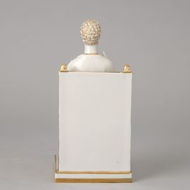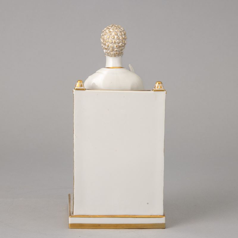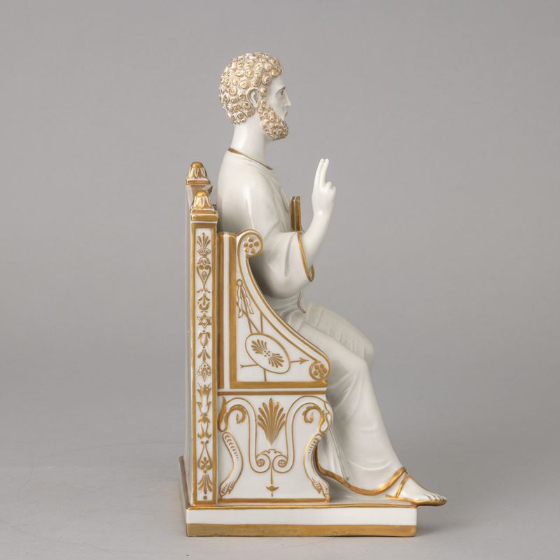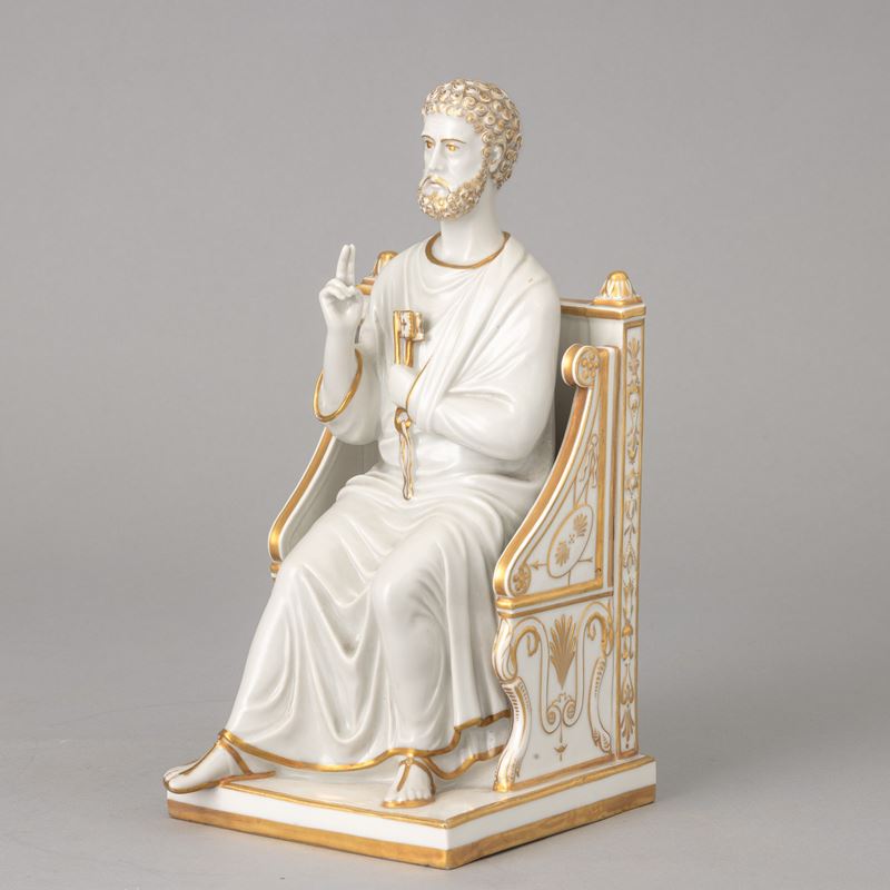 Figura di San Pietro assiso in porcellana con decoro di dorature al terzo fuoco.