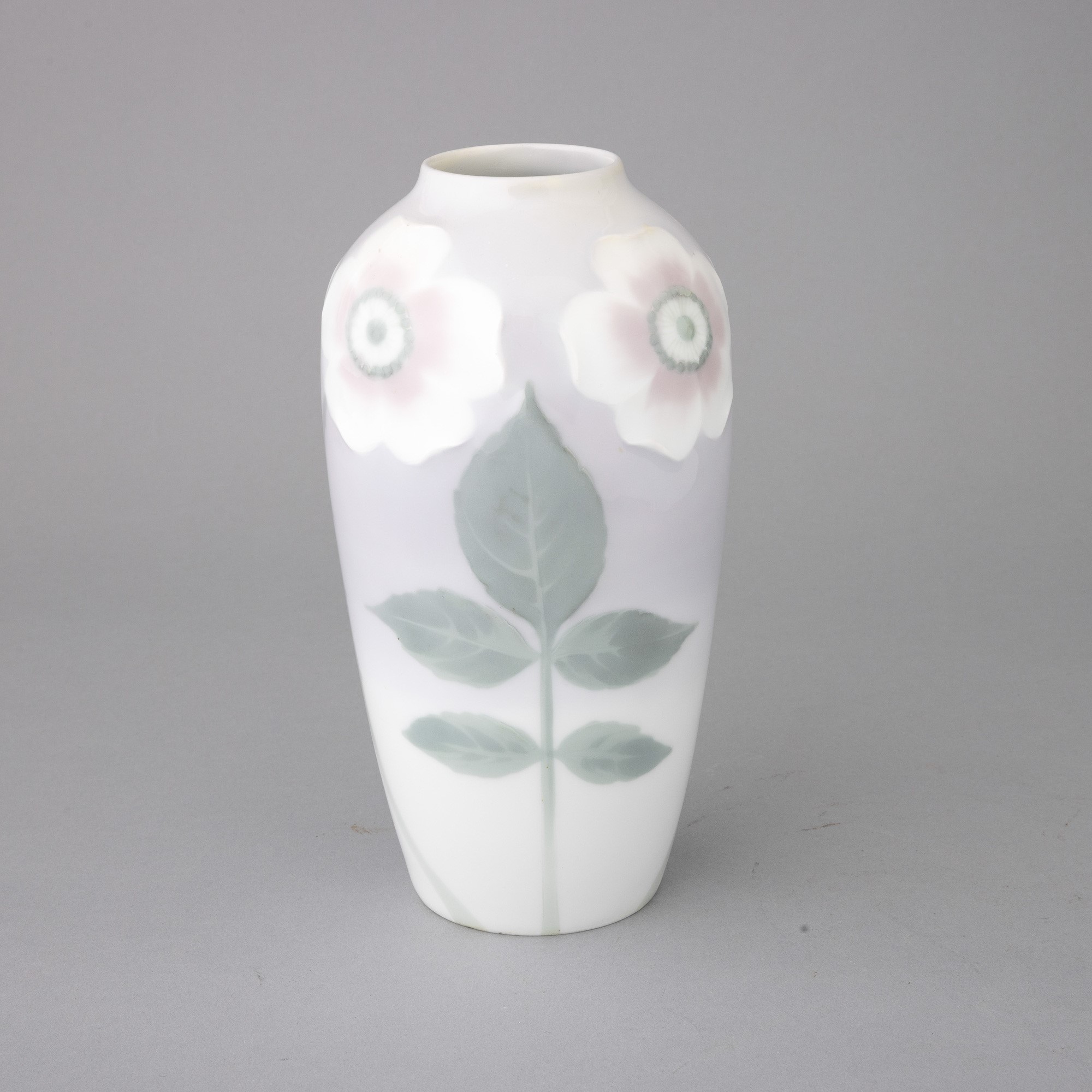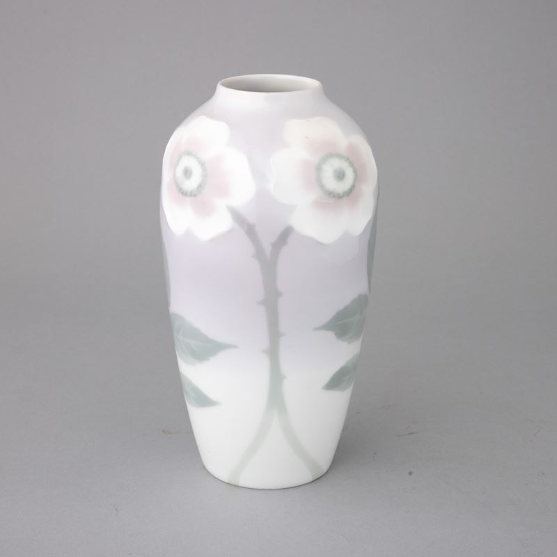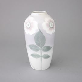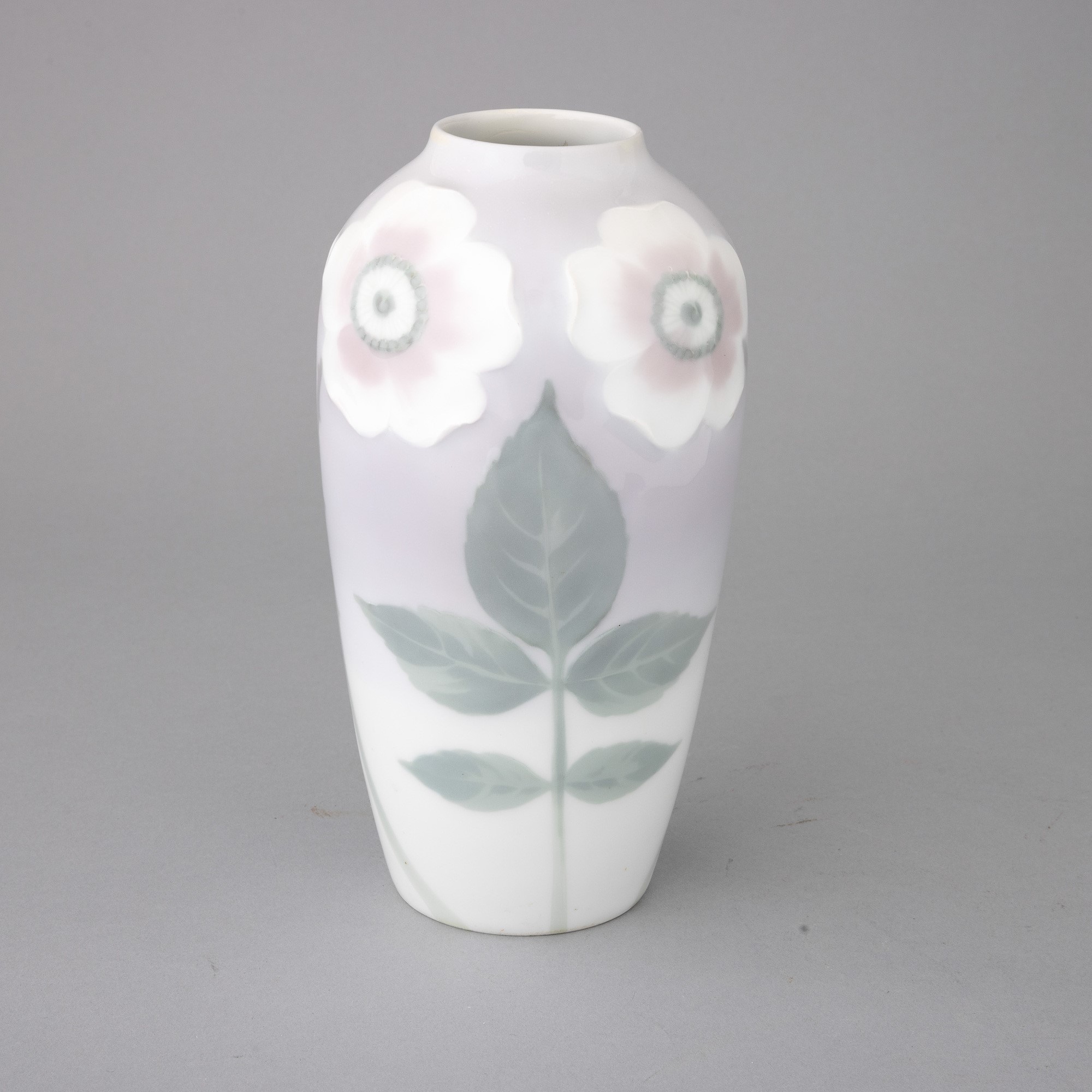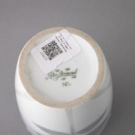 Vaso in porcellana con decoro a rilievo di fiori e foglie su fondo sfumato.