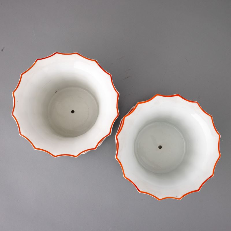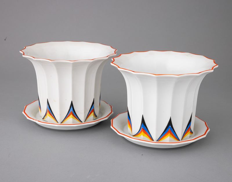 Lotto formato da due vasi porta piante con relativi sottovasi in porcellana scanalata con decoro art decò a smalti policromi.