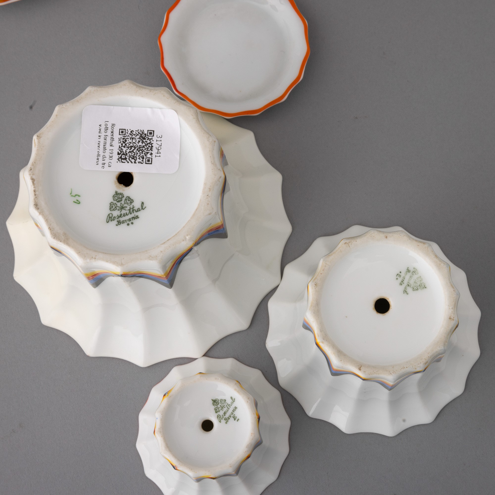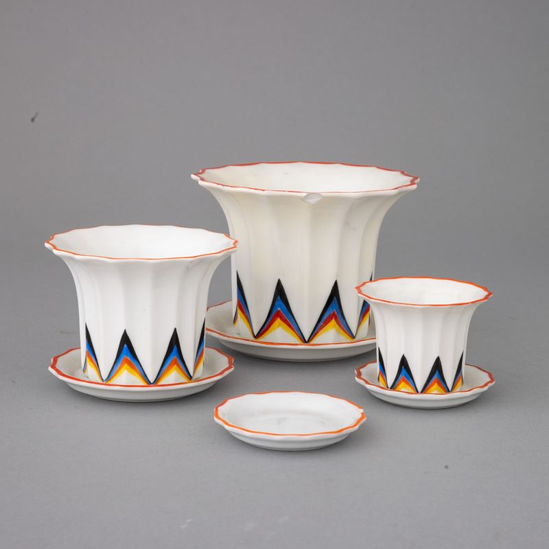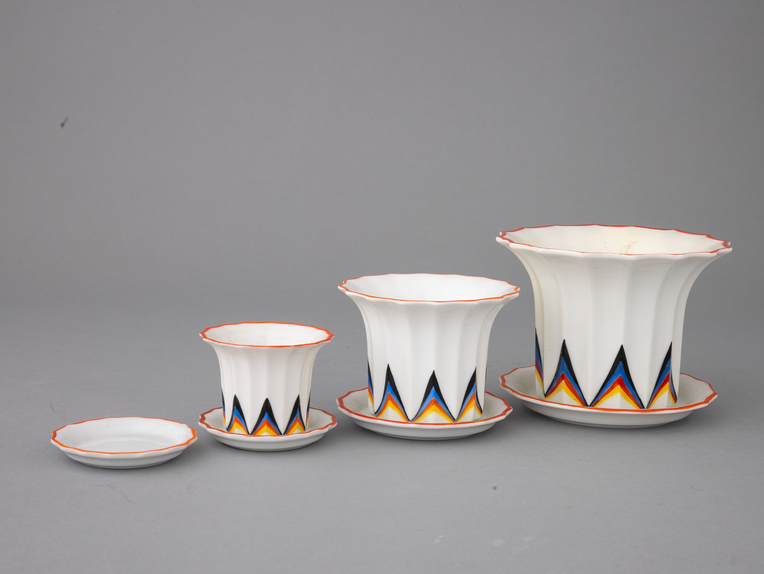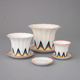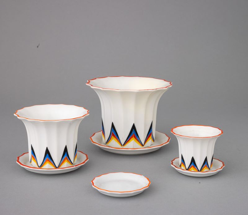 Lotto formato da tre vasi porta piante con quattro sottovasi in porcellana scanalata con decoro art decò a smalti policromi.